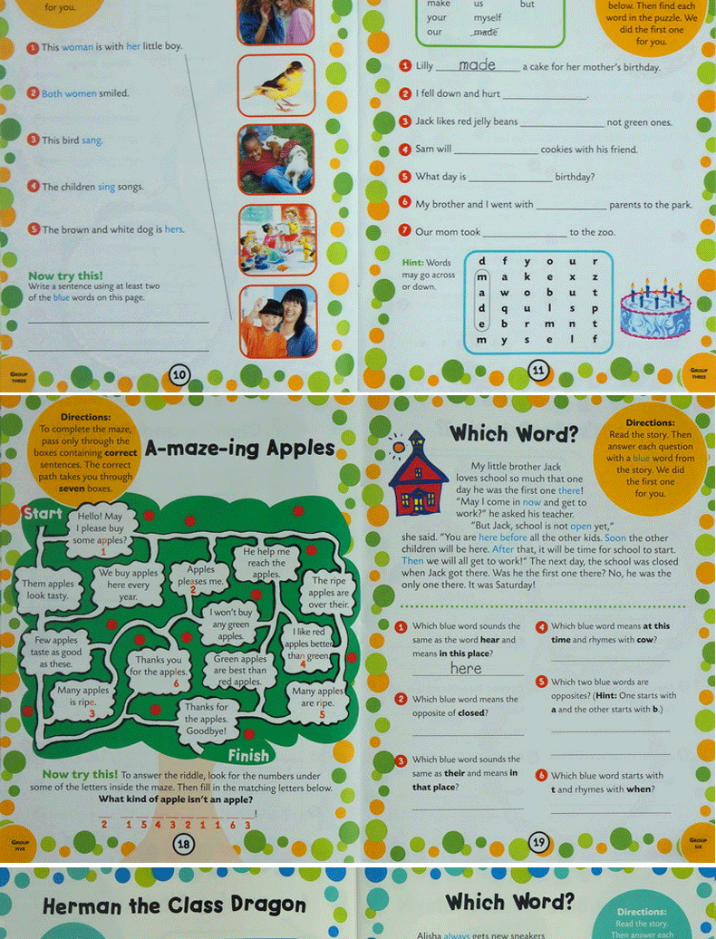 1. 全面系统:练习册把SightWord用常见句型的形式展示,然后以游戏练习的方式和孩子互动。这样可以学习了一个常见句型+某一主题的相关词汇。这对拓展主题词,用替换主题词的方式来巩固某个日常句型非常有帮助。