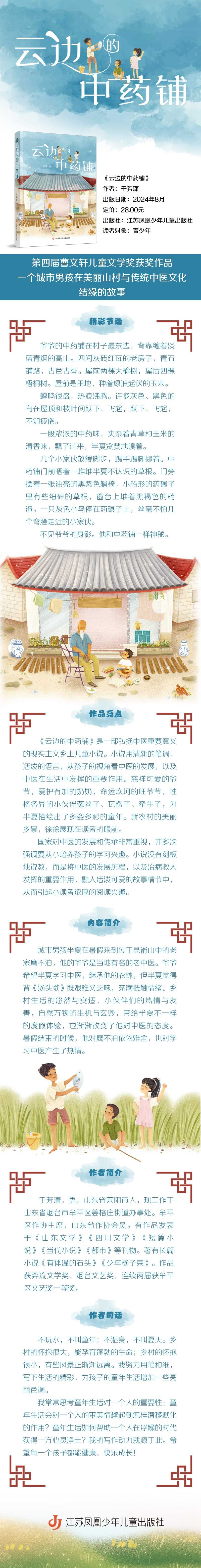 《云边的中药铺》是一部弘扬中医重要意义的现实主义乡土儿童小说。小说用清新的笔调、活泼的语言,从孩子的视角看中医的发展,以及中医在生活中发挥的重要作用。慈祥可爱的爷爷,爱护有加的奶奶,命运坎坷的旺爷爷,性格各异的小伙伴菟丝子、瓦楞子、牵牛子,为半夏描绘出了多姿多彩的童年。新农村的美丽乡景,徐徐展现在读者的眼前。 国家对中医的发展和传承非常重视,并多次强调要从小培养孩子的学习兴趣。小说没有刻板地说教,而是将中医的发展历程,以及治病救人发挥的重要作用,融入活泼可爱的故事情节中,从而引起小读者浓厚的阅读兴趣。《云边的中药铺》是一部弘扬中医重要意义的现实主义乡土儿童小说。小说用清新的笔调、活泼的语言,从孩子的视角看中医的发展,以及中医在生活中发挥的重要作用。慈祥可爱的爷爷,爱护有加的奶奶,命运坎坷的旺爷爷,性格各异的小伙伴菟丝子、瓦楞子、牵牛子,为半夏描绘出了多姿多彩的童年。新农村的美丽乡景,徐徐展现在读者的眼前。 国家对中医的发展和传承非常重视,并多次强调要从小培养孩子的学习兴趣。小说没有刻板地说教,而是将中医的发展历程,以及治病救人发挥的重要作用,融入活泼可爱的故事情节中,从而引起小读者浓厚的阅读兴趣。
