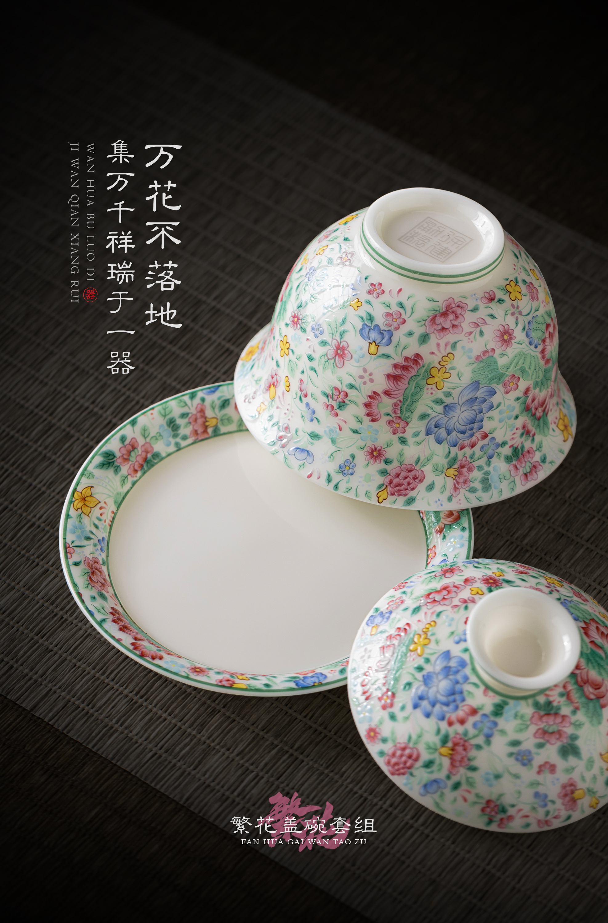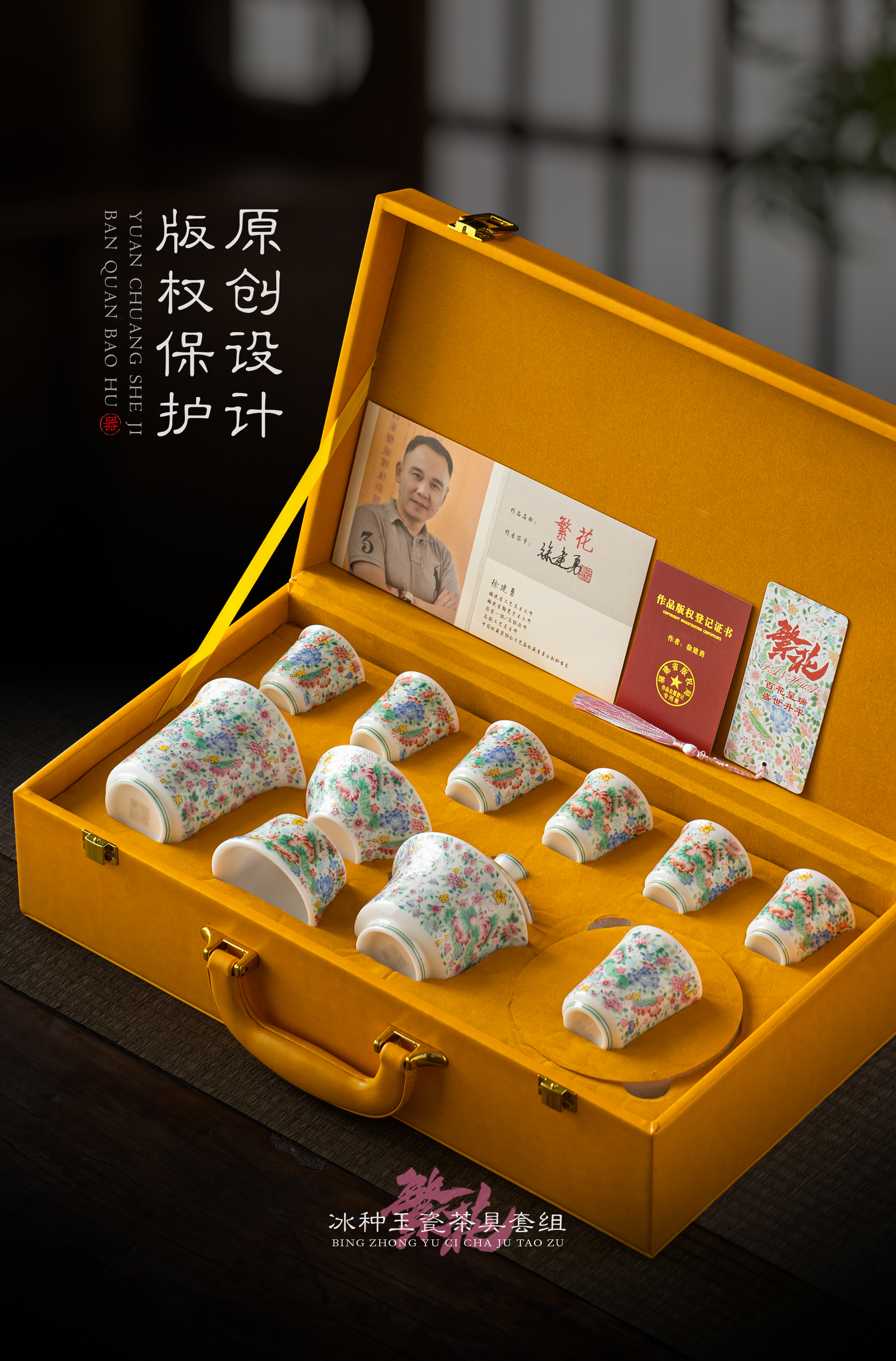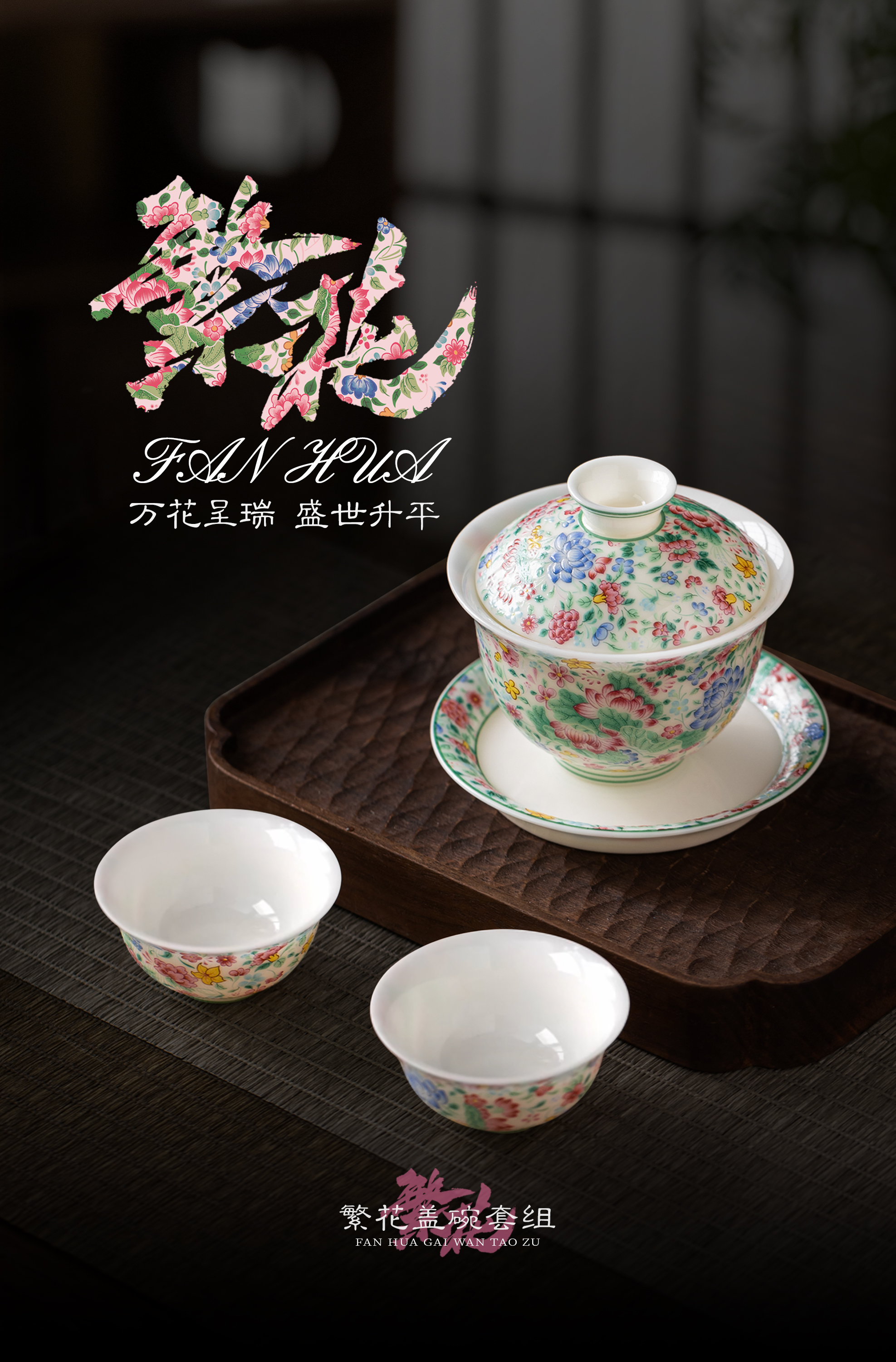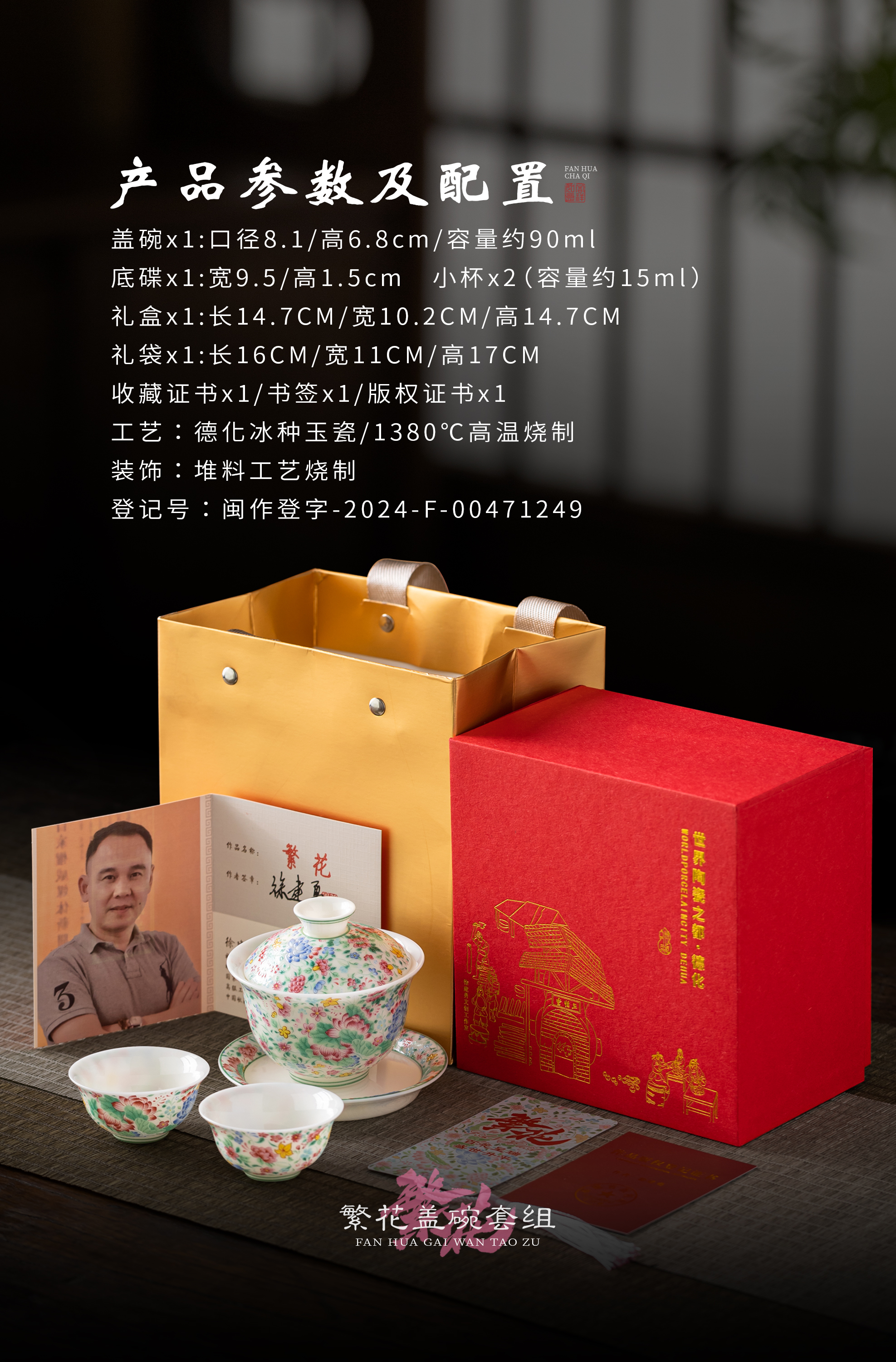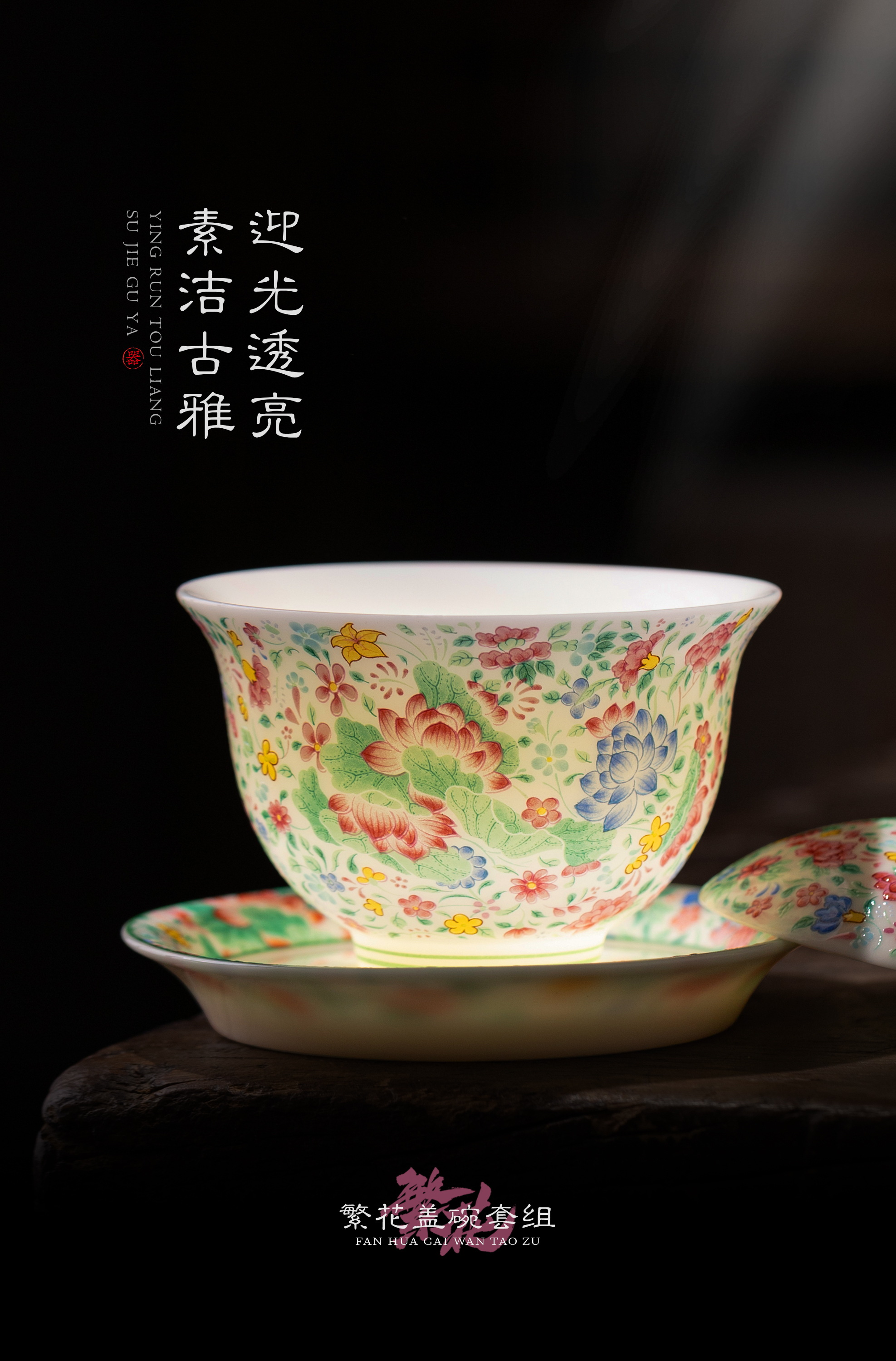 【万花呈瑞 盛世升平】繁花冰种玉瓷盖碗套组/茶具套组/圆融杯/莲花杯主人杯/咖啡杯 徐建勇大师签章,繁花争艳 推感立体 迎光透亮,精美包装 gao端豪礼