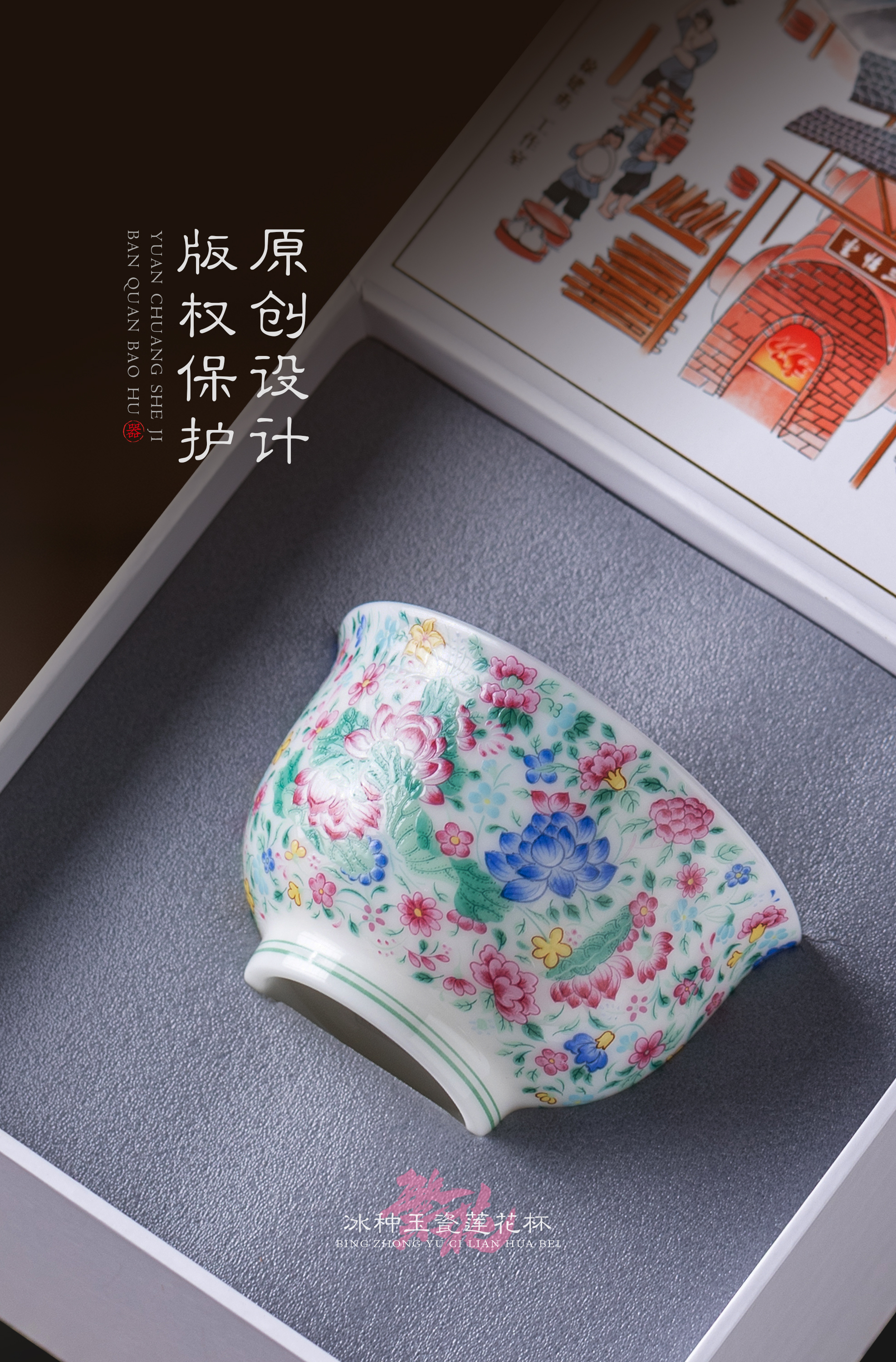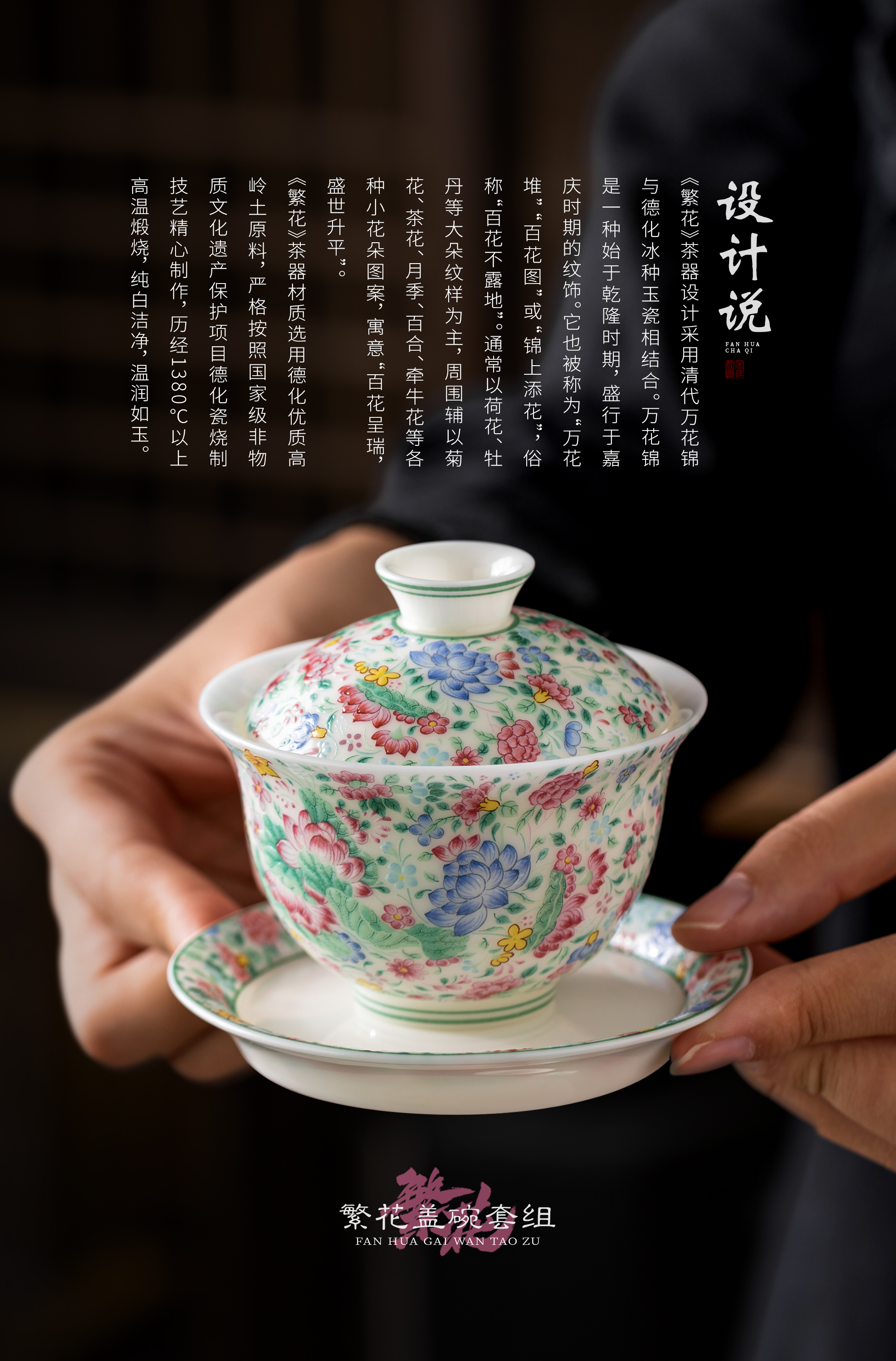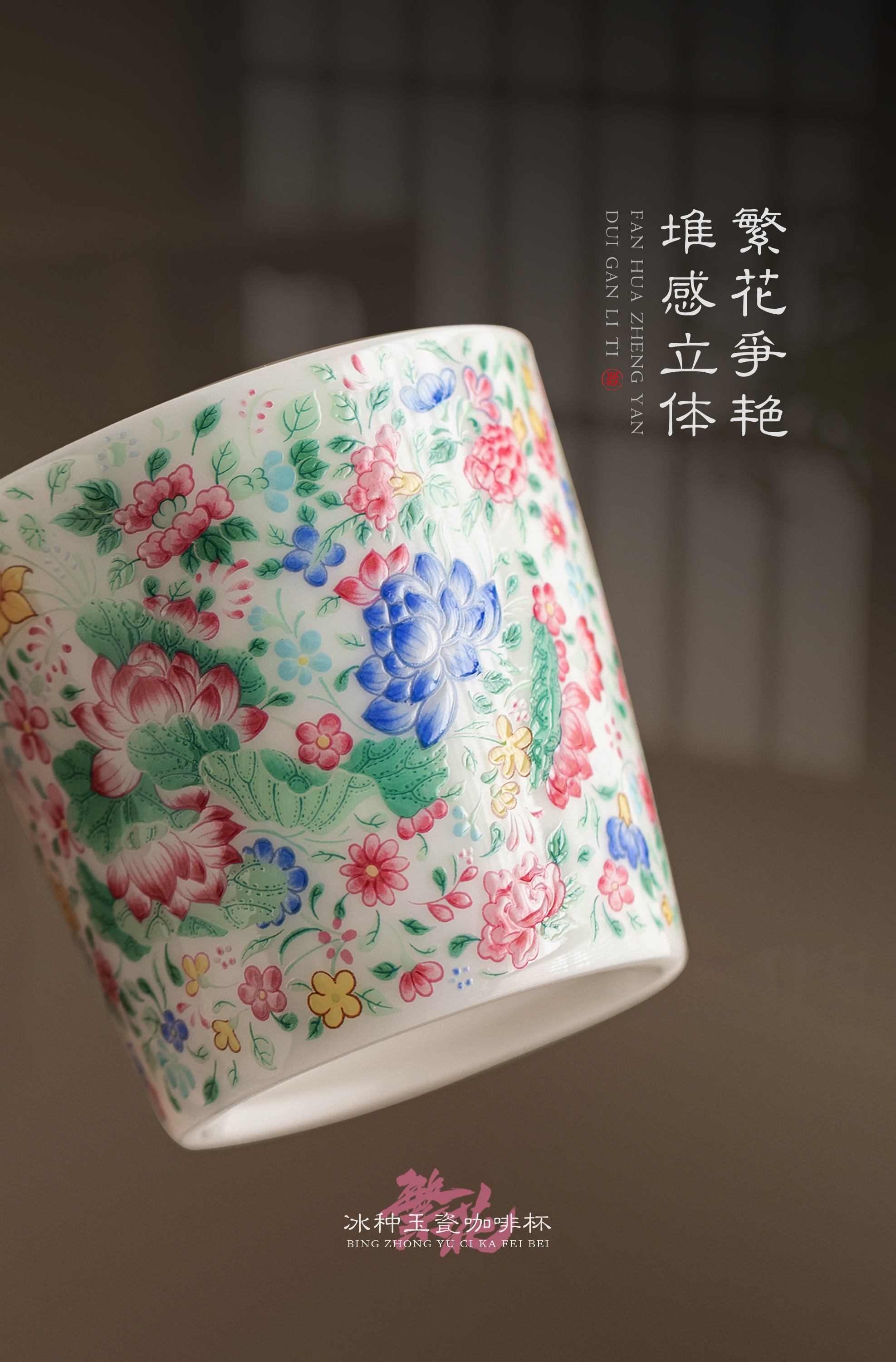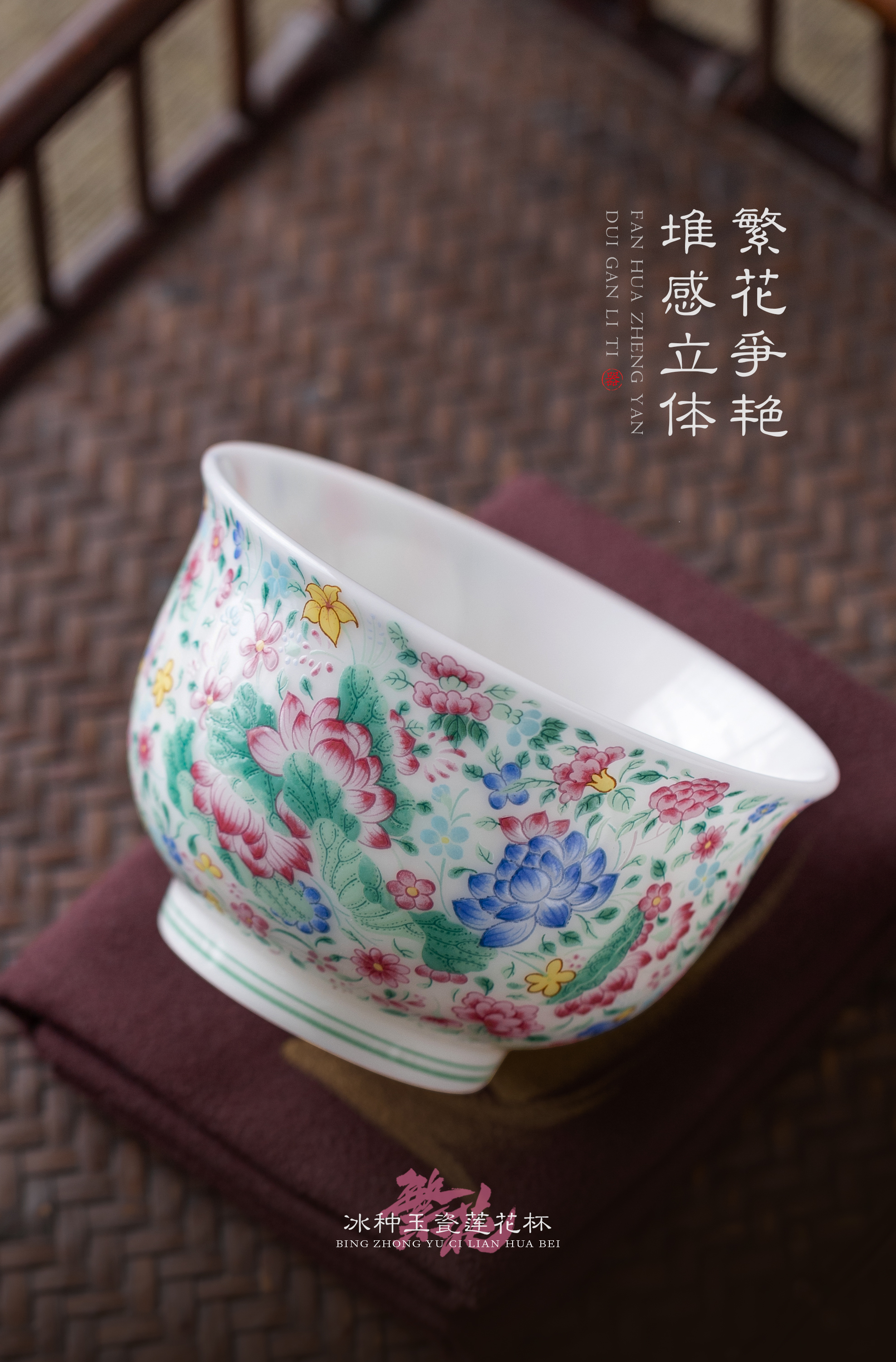 【万花呈瑞 盛世升平】繁花冰种玉瓷盖碗套组/茶具套组/圆融杯/莲花杯主人杯/咖啡杯 徐建勇大师签章,繁花争艳 推感立体 迎光透亮,精美包装 gao端豪礼
