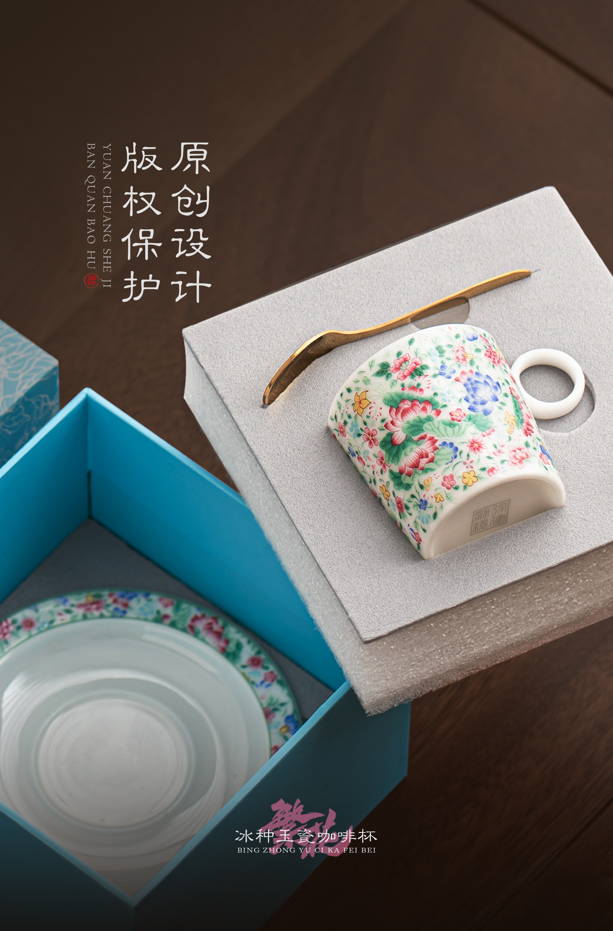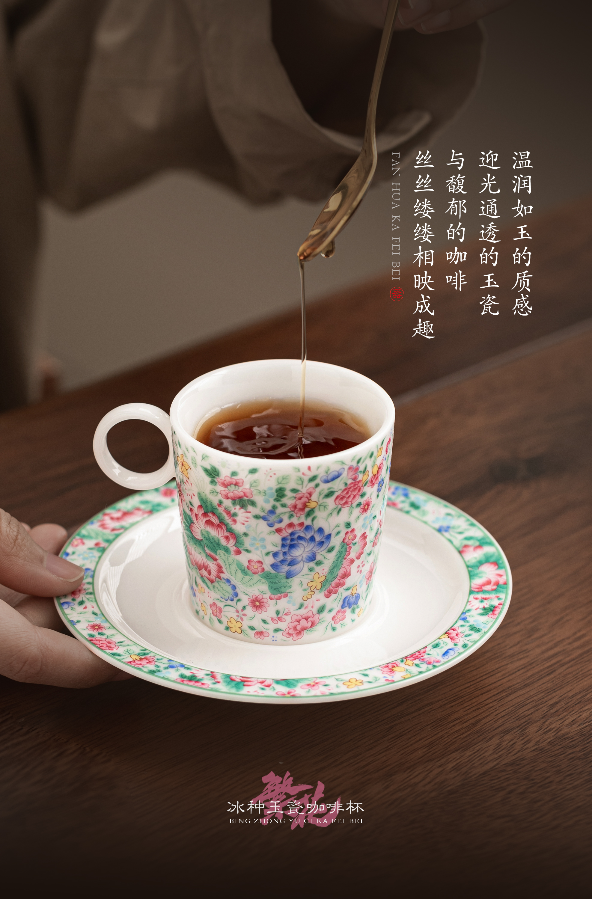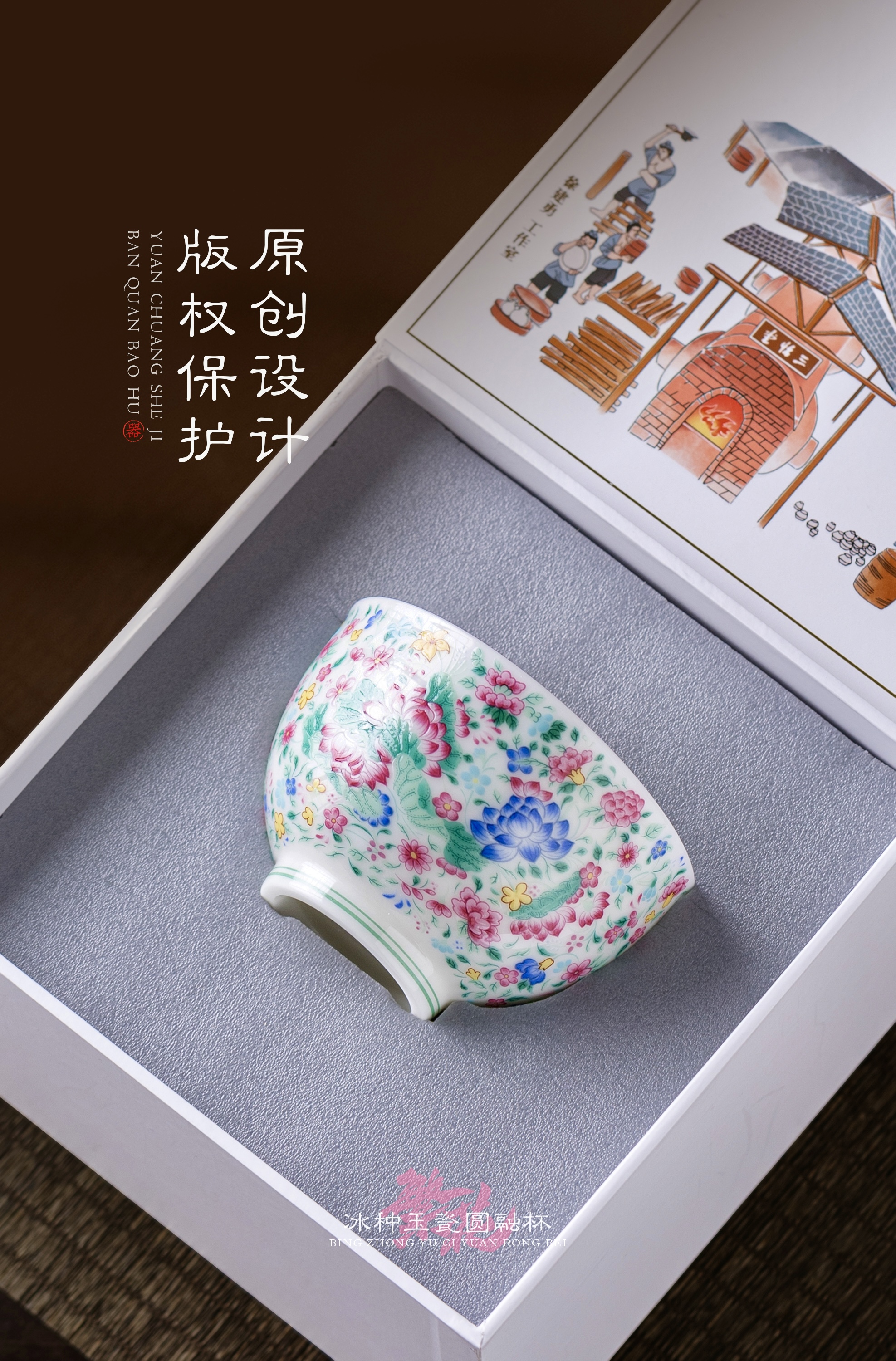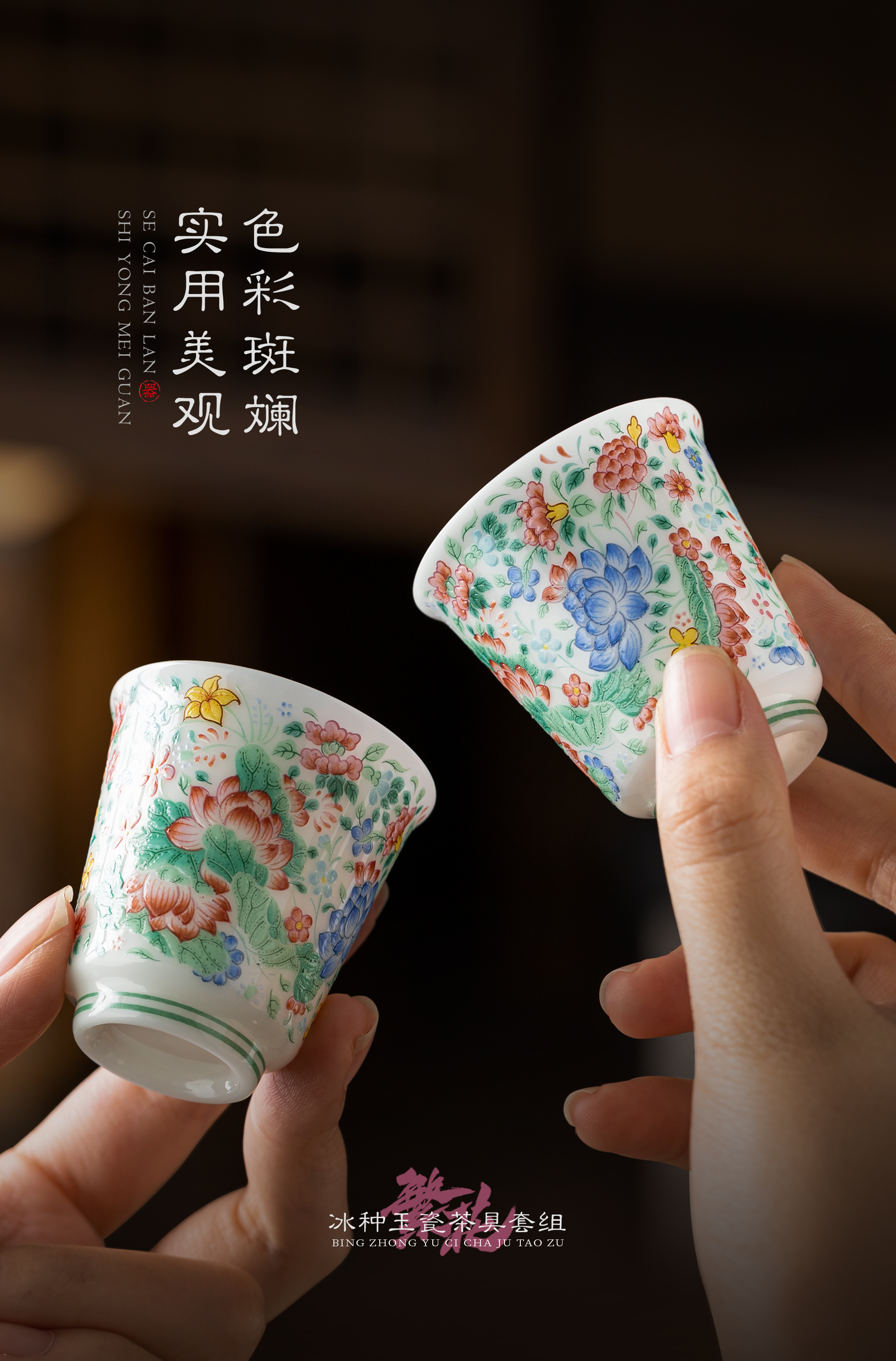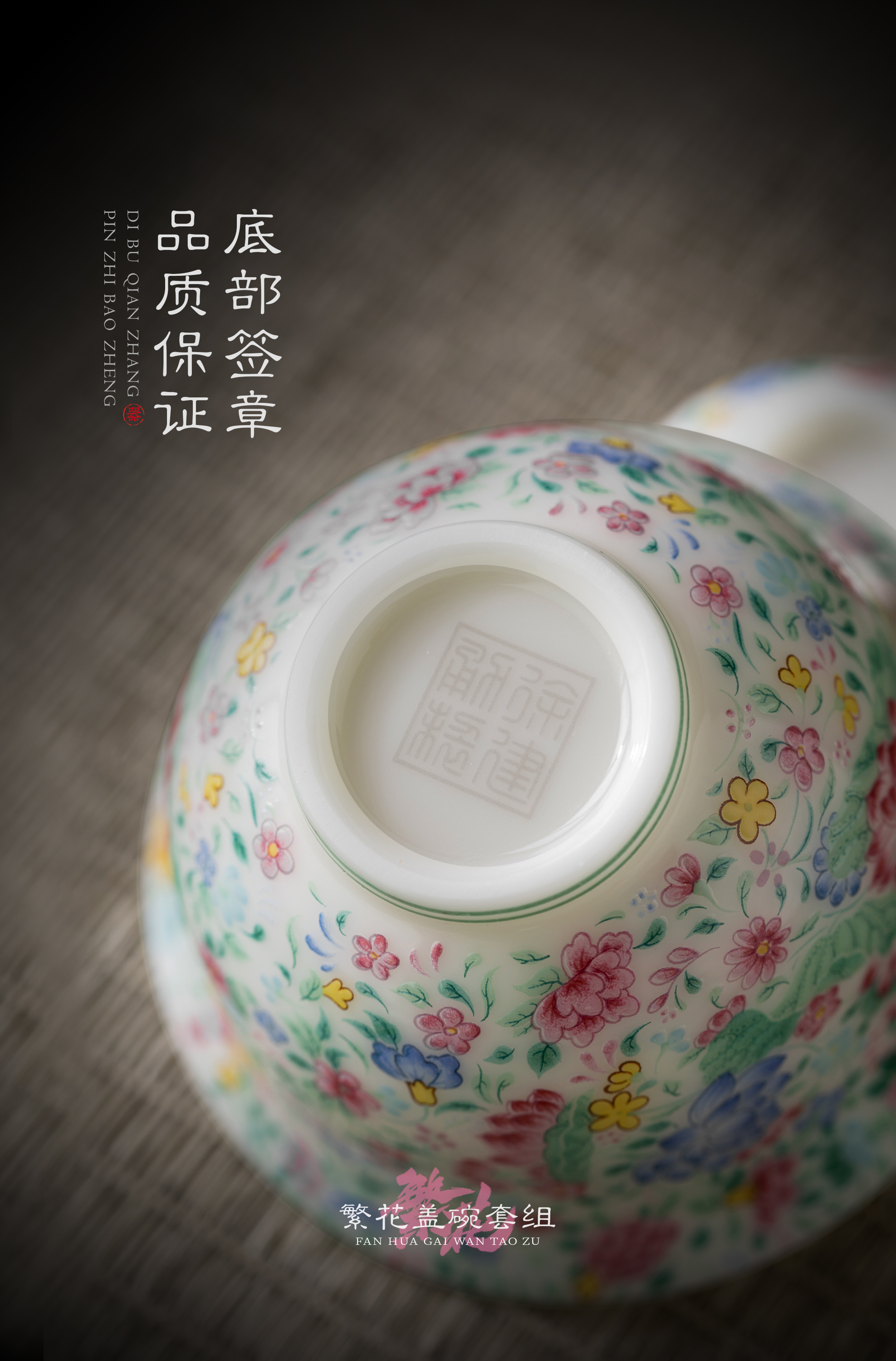 【万花呈瑞 盛世升平】繁花冰种玉瓷盖碗套组/茶具套组/圆融杯/莲花杯主人杯/咖啡杯 徐建勇大师签章,繁花争艳 推感立体 迎光透亮,精美包装 gao端豪礼