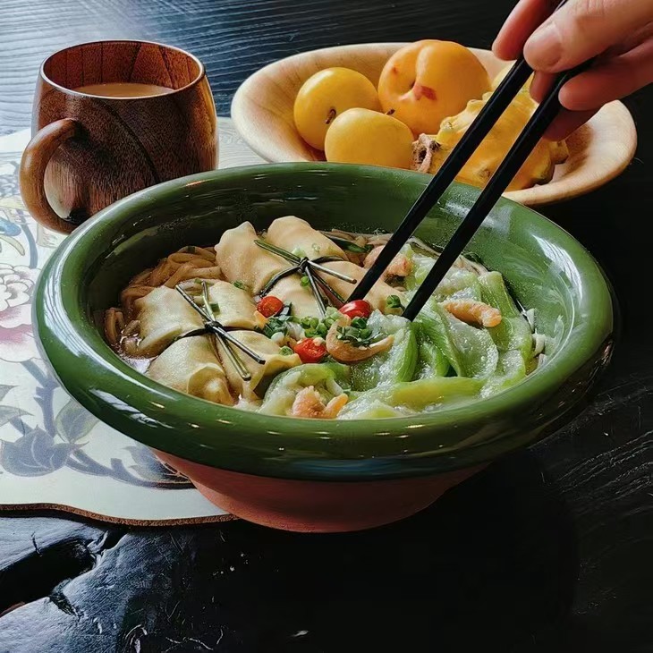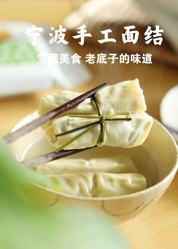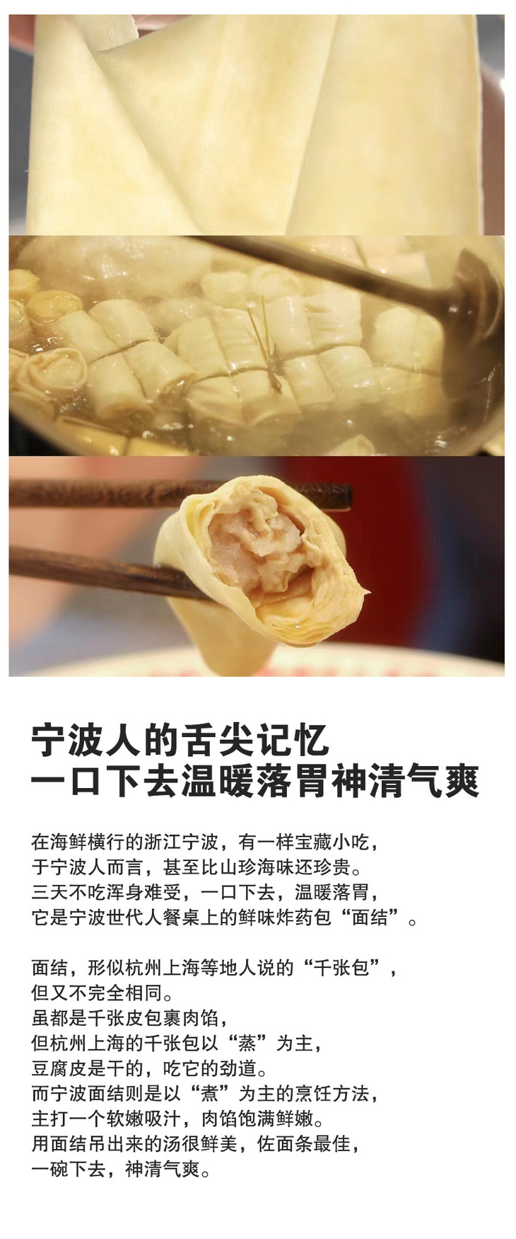 手工面结的原料十分讲究。东北精选黄豆制成的千张皮,就经过六道工序处理,确保其纤薄柔韧,每张皮还都需手工切割成方形,用纯净水泡发,以去除豆腥味,同时保留豆香气息,使得煮后的面结皮更加鲜嫩。而肉馅则是宁波面结的灵魂所在。,选用本地土壤肥沃、气候适宜的农家黑猪肉,精选猪前腿和里脊,按照3分肥7分瘦的黄金比例,手工剁馅、手工搅拌,不添加任何植物蛋白、鸡精等食品添加剂。包好后的面结,再用宁波的古林蔺草茎叶捆制,不仅能保证面结不散,吃起来还有蔺草独特的香气!