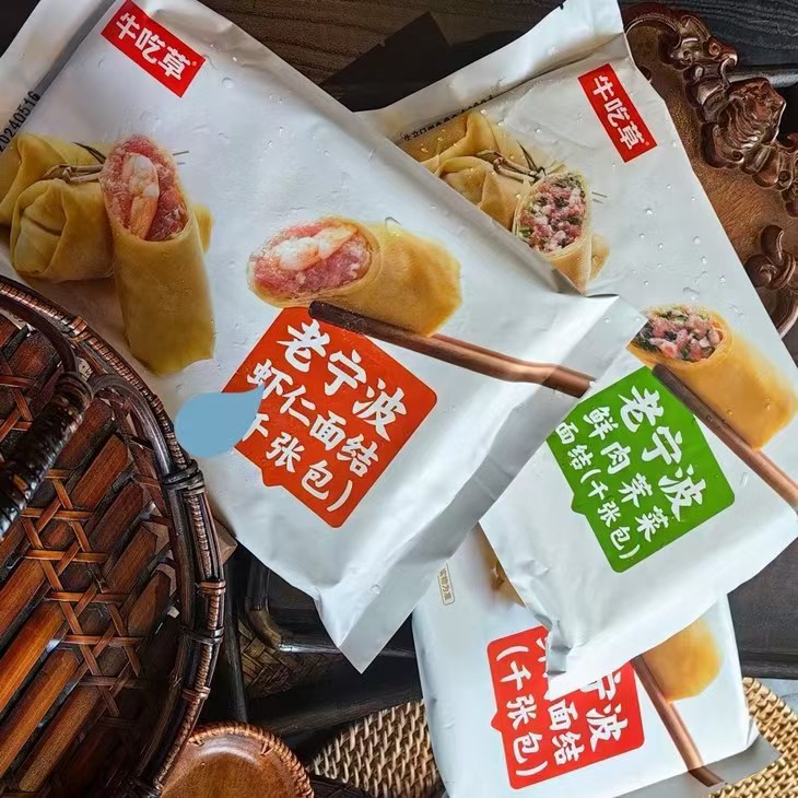 2枚一捆,一盒四捆。鲜肉、荠菜鲜肉、虾仁鲜肉,三个口味,每个都好吃到离谱!大家收到之后,一定要冷冻,以保持最佳口感。想吃时直接下锅,小火慢煮15分钟左右,能最大程度还原现包现煮的鲜活感。无论是佐汤、佐面、佐菜,都很舒服落胃!而面结汤配面是最正宗的宁波吃法,再扔几颗青菜、几粒油豆腐,可以收获幸福一整天的美味,暖胃又暖心。吸饱汤汁的千张皮,真是鲜香软嫩得不像话,肉馅也超多汁,就算是菜肉馅,也一样爽滑弹牙!