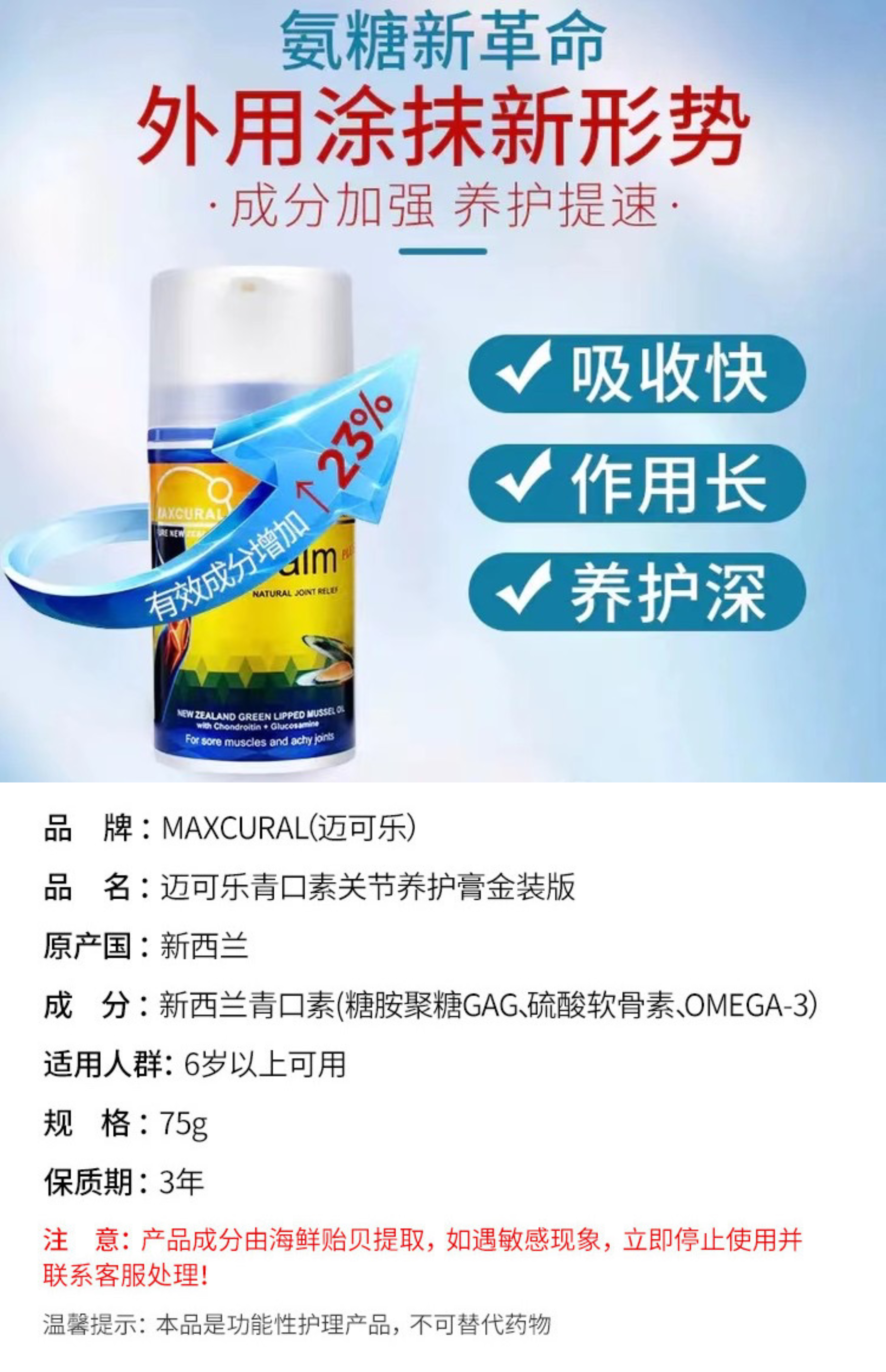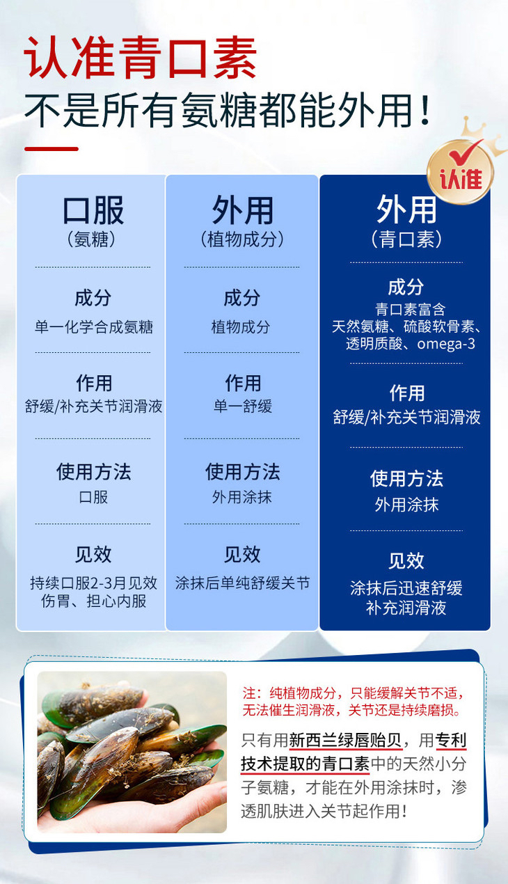我个人觉得是真的非常有效,基本上当天涂当天好,最多睡一晚就又活蹦乱跳了,而且老年人早预防好过不可逆的退化。大家可以看下官网介绍,可能更清晰一些。听一些在新西兰和土澳的朋友说,他们几乎是每家必备,特别是有老人的,主要成分是超临界CO2萃取技术下完美提炼的贻贝青口素,保持原料的生物活性,不破坏蛋白质和脂类,通过精华的渗透作用,让人体关节自我产生润滑液修复损伤的关节或肌肉组织,抗菌消炎,从而让人体关节恢复到最初状态。基本上也不会过敏,有过一两例吧,可以先小范围测试,然还关节不舒服就抹抹,在很多很多行业内刊都是有口皆碑的!