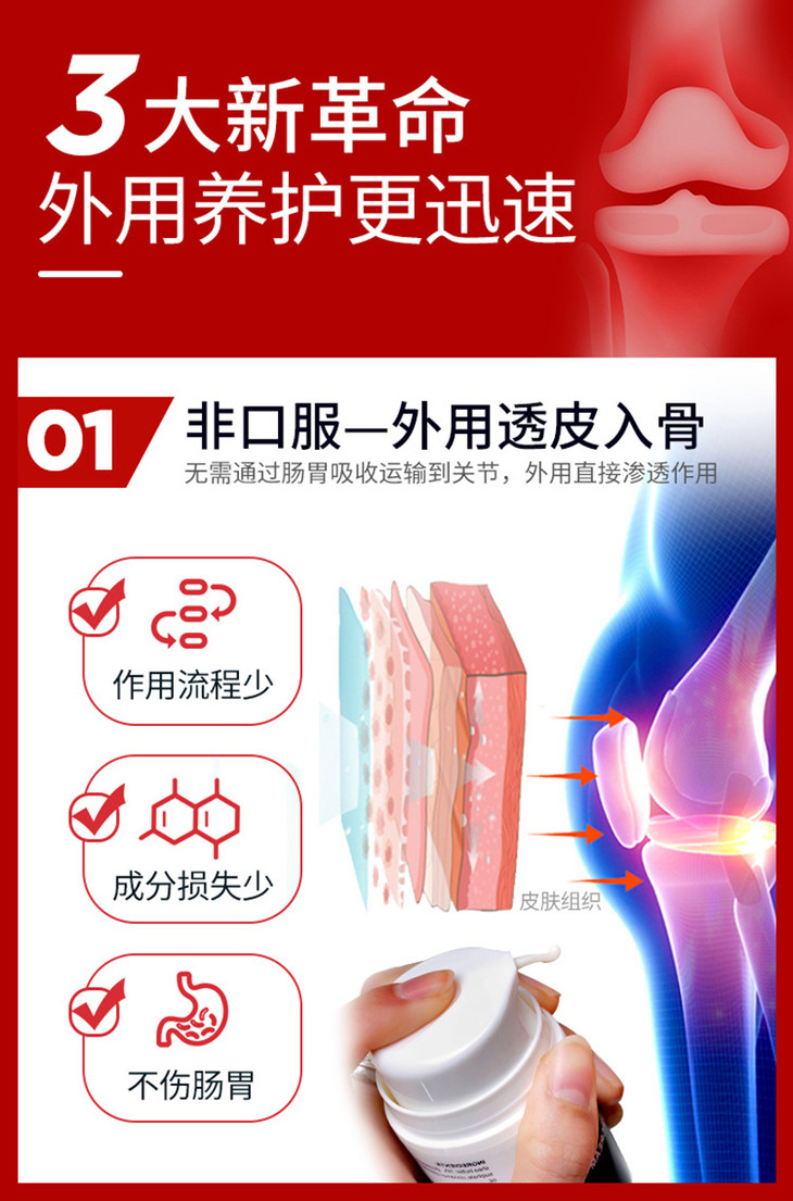 特别特别推荐给家中长辈备上,据不完全统计老年人退行性关节炎,使用一个晚上疼痛能缓解65%以上,长期使用补充关节润滑液,增强软骨健康。老人家有不舒服总是会忍,也不舍得花钱,这真的得细心观察并说服他们坚持了哦!