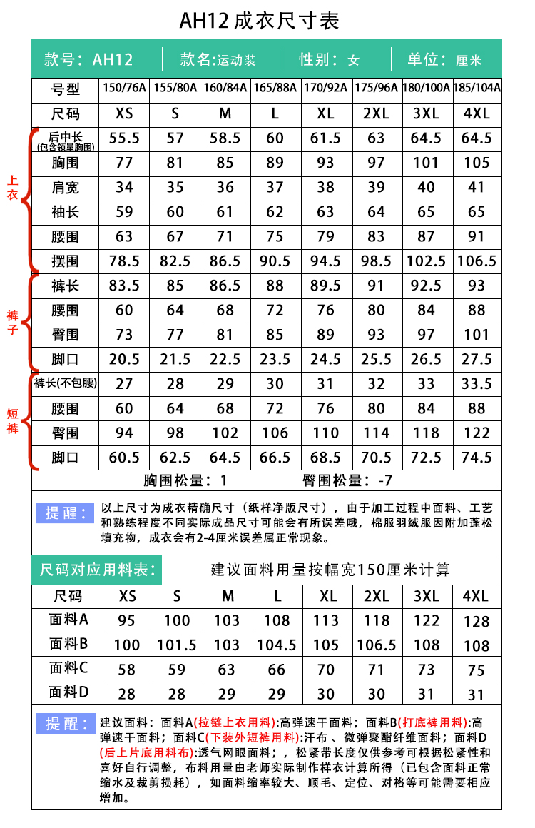 裁缝学苑AH12速干衣长袖瑜伽运动服纸样健身服女装长短裤子样板图纸
