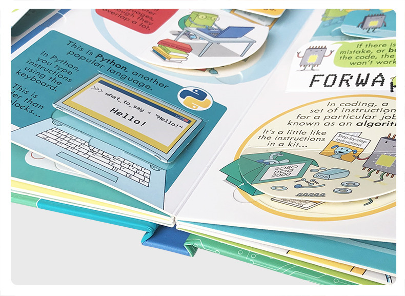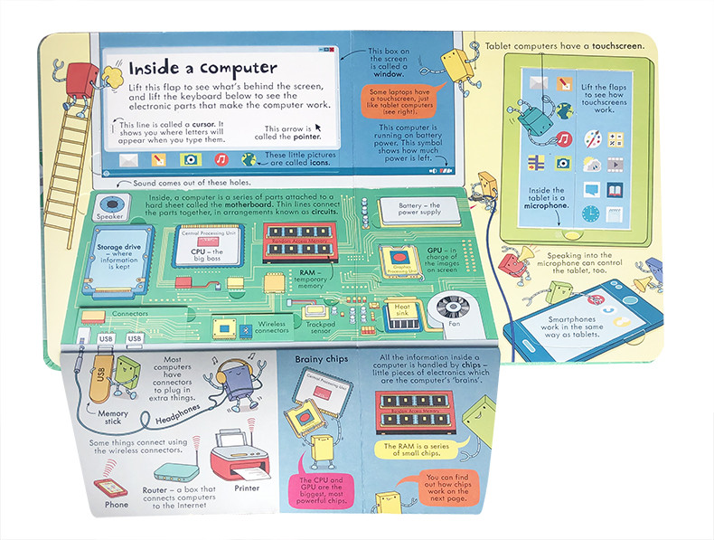 这本彩色的书有70个褶叶,揭示了当电脑打开时会发生什么?、编码是如何工作的?、以及台式电脑的故事等一系列问题的答案。