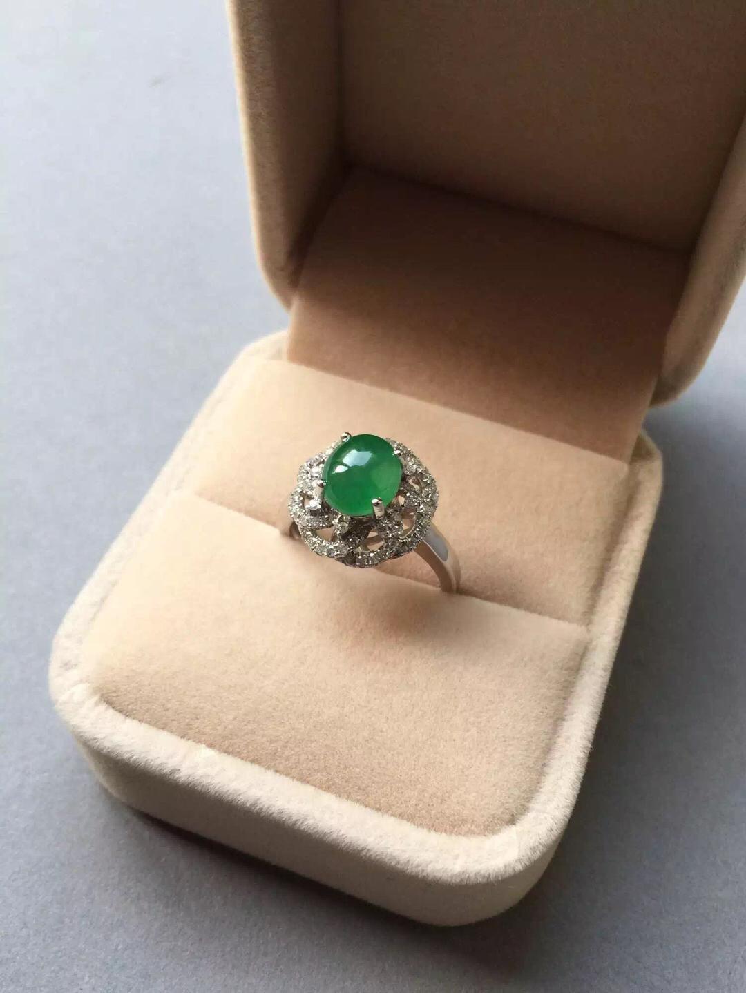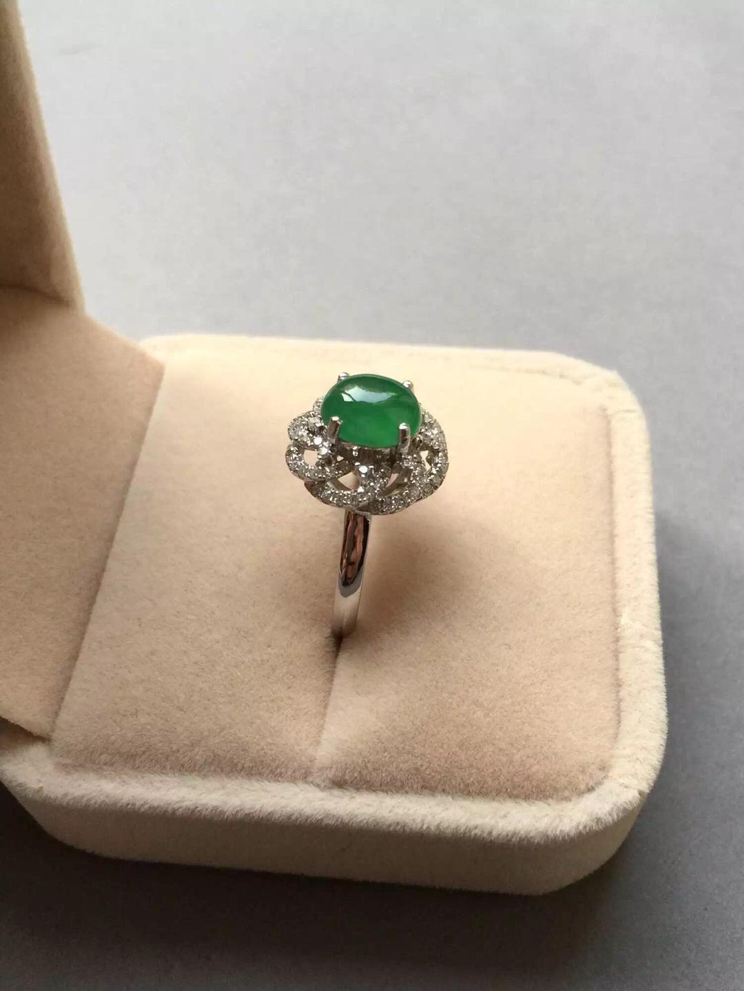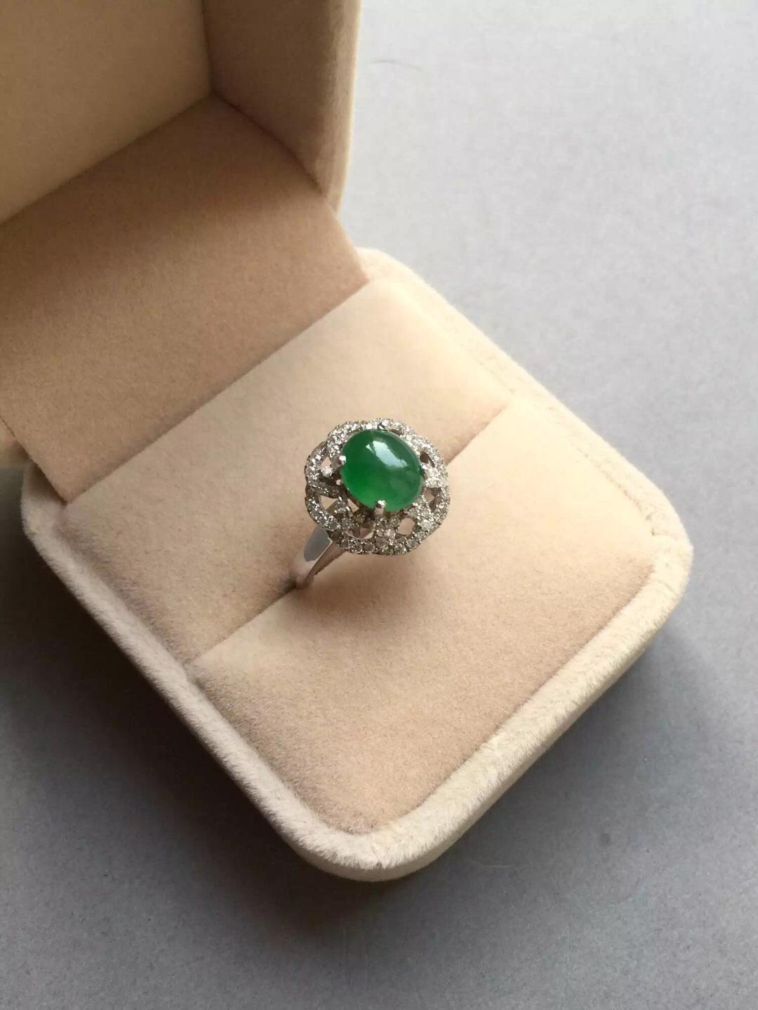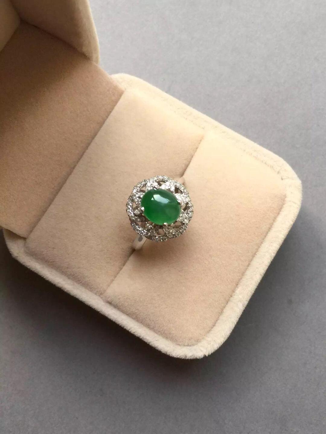 冰种阳绿翡翠蛋面戒指,正气阳,色泽艳丽,种水棒,荧光强烈,阳光下绚丽夺目,18k白金钻石豪华镶嵌,单单镶嵌就2000多了,漂亮的花朵款式,璀璨的钻石和绿翡翠蛋面相得益彰,蛋面8.2*7*3.1mm,圈口13可以免费改