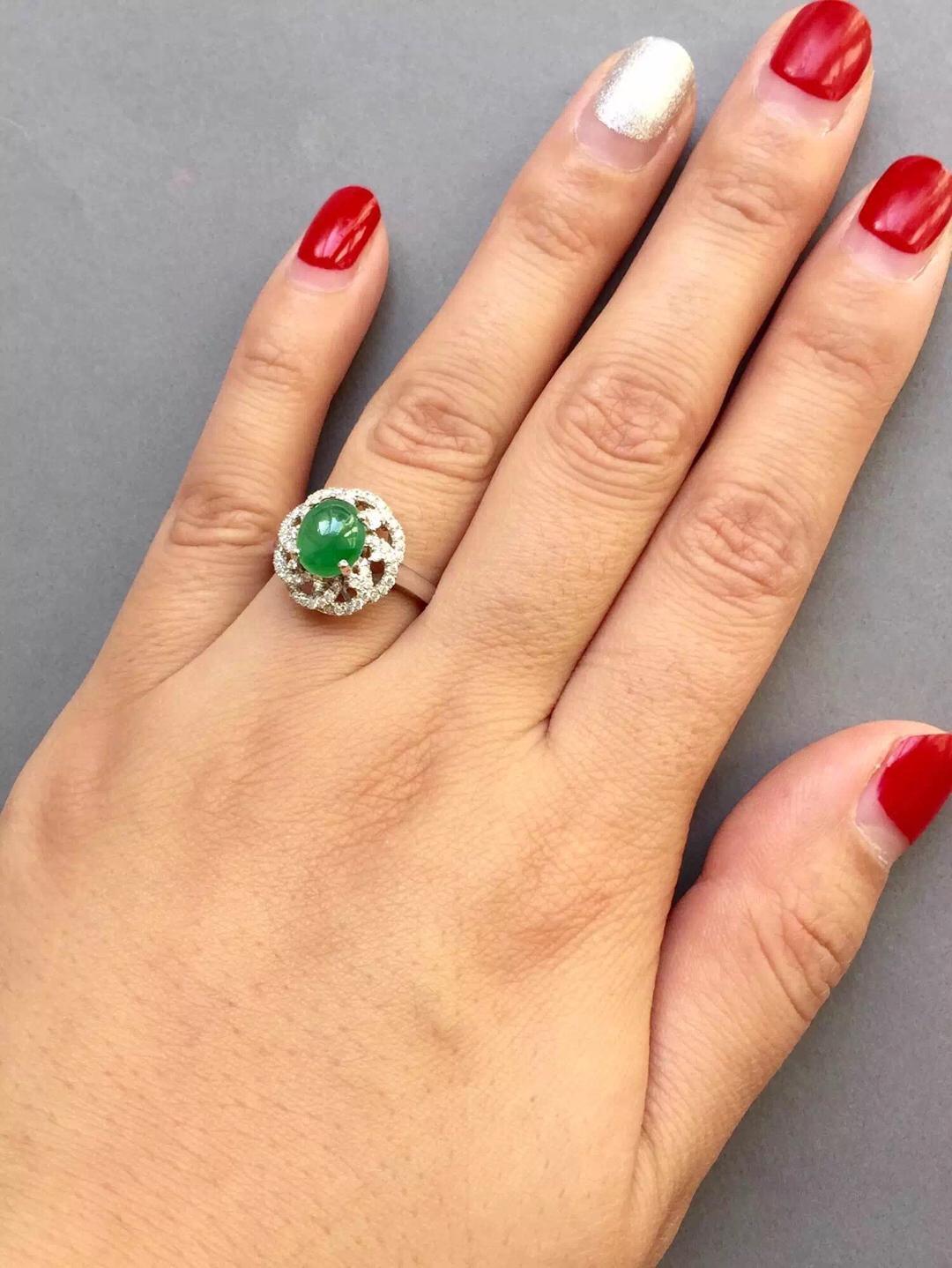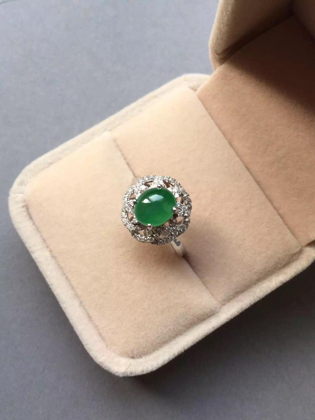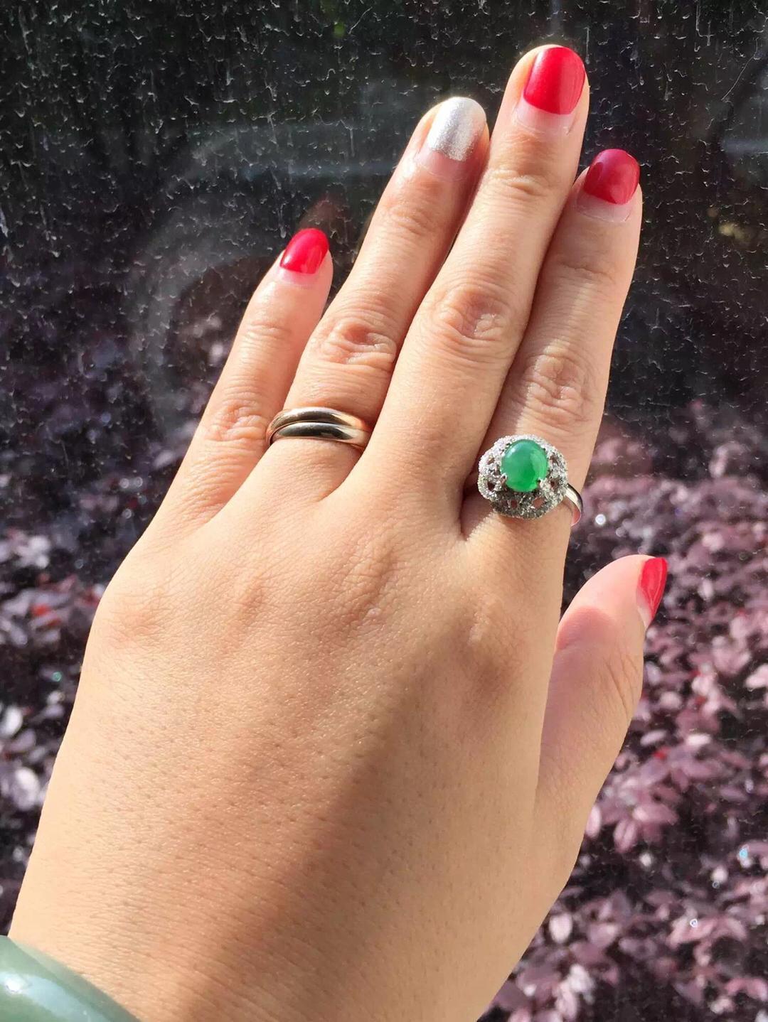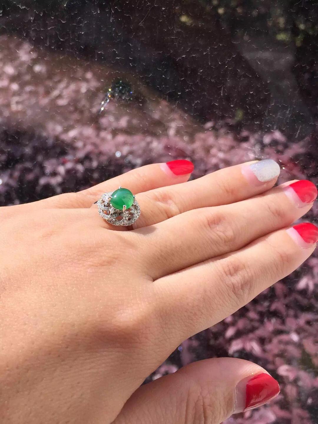 冰种阳绿翡翠蛋面戒指,正气阳,色泽艳丽,种水棒,荧光强烈,阳光下绚丽夺目,18k白金钻石豪华镶嵌,单单镶嵌就2000多了,漂亮的花朵款式,璀璨的钻石和绿翡翠蛋面相得益彰,蛋面8.2*7*3.1mm,圈口13可以免费改