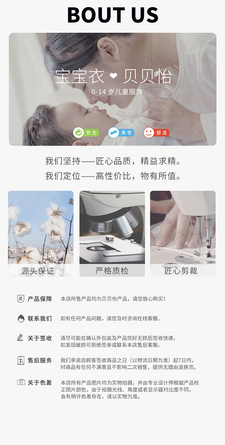 - 贝贝怡专注0-6岁婴幼儿服饰,坚持安全、柔软、舒适的产品理念,为千万中国家庭提供超高品质、安全可靠的婴幼儿服饰产品,妈妈放心,宝宝开心!