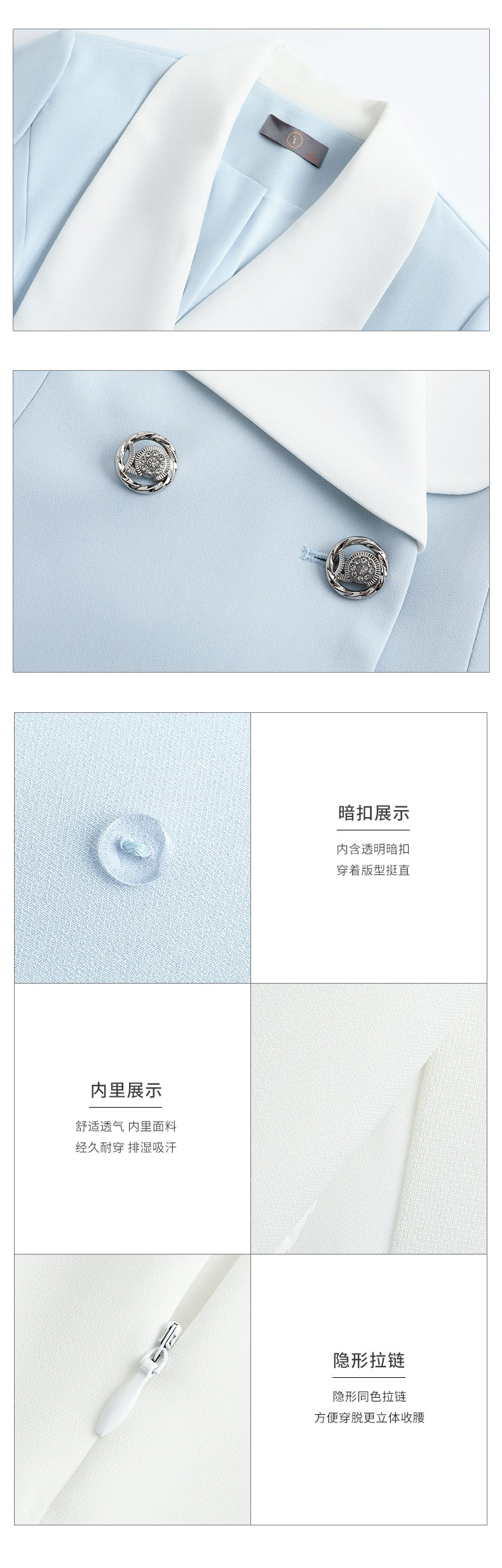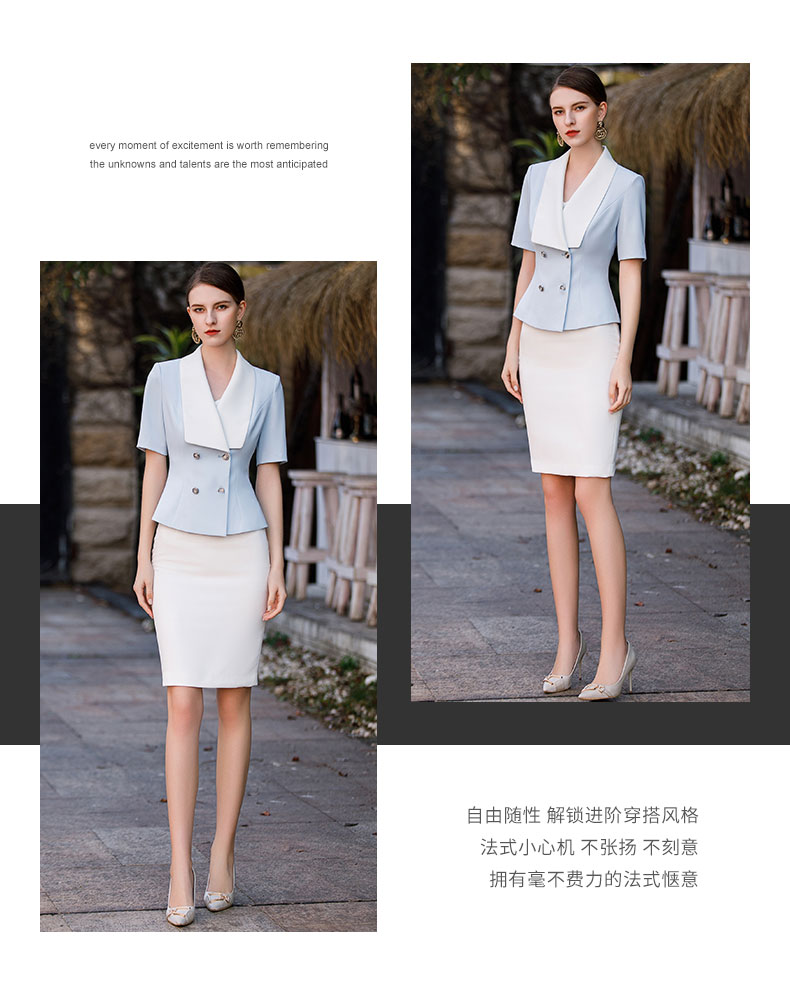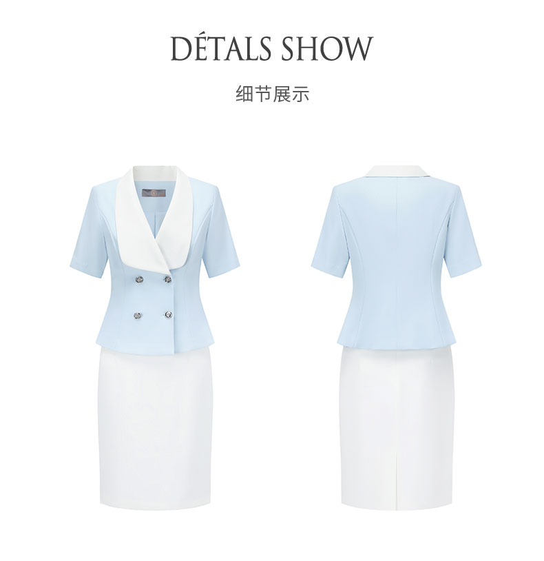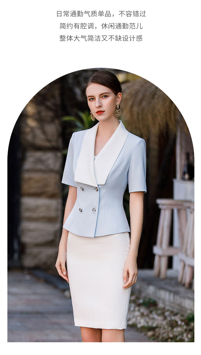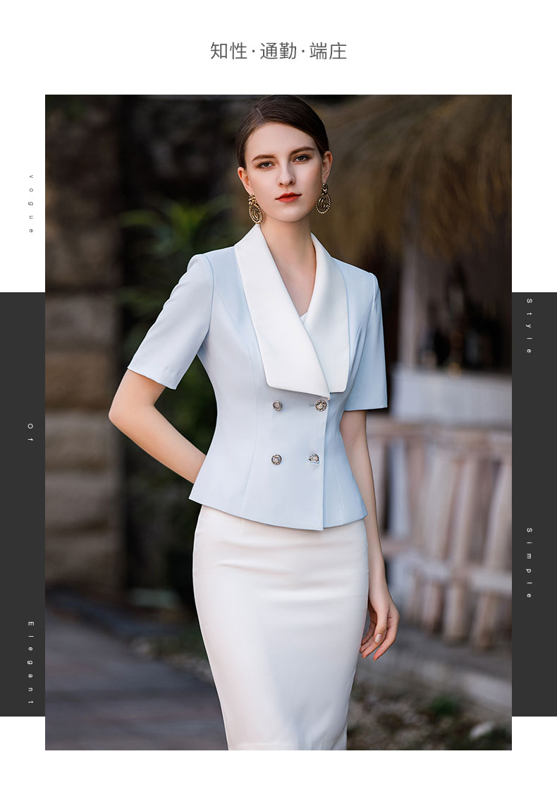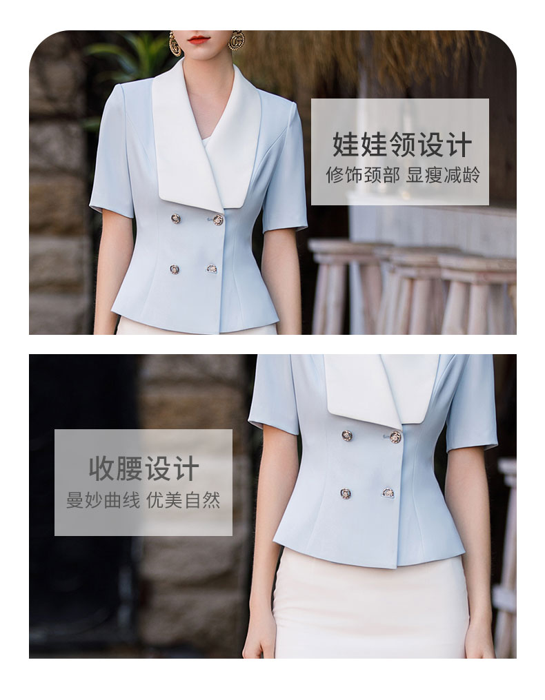 AD夏季2024新款短袖西装套装女蓝色法式大翻领西服外套教师工作服