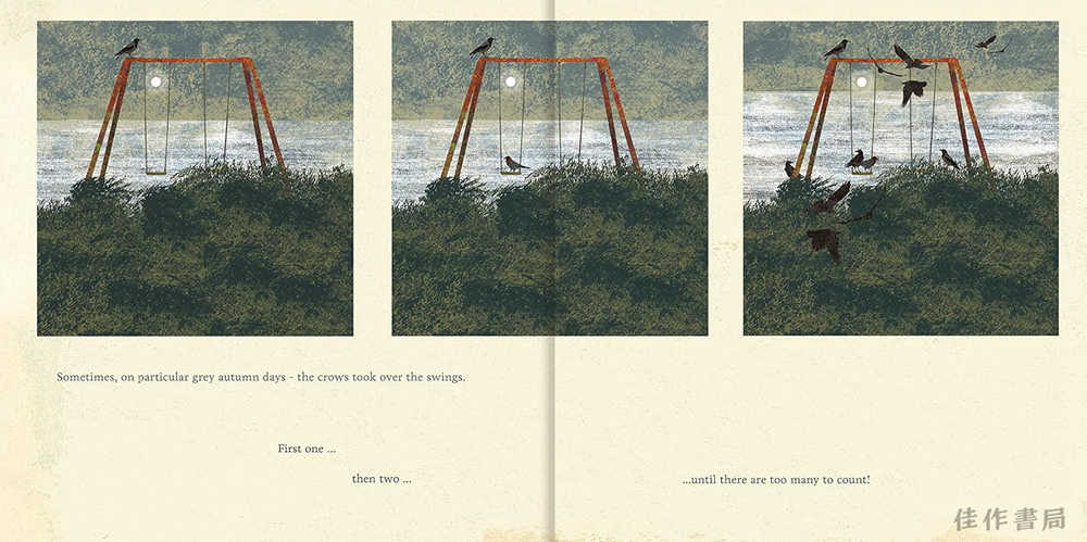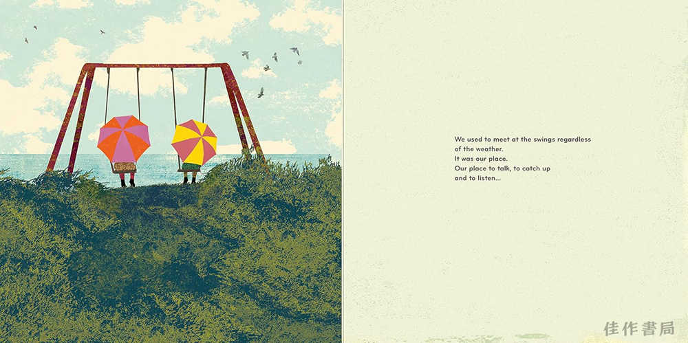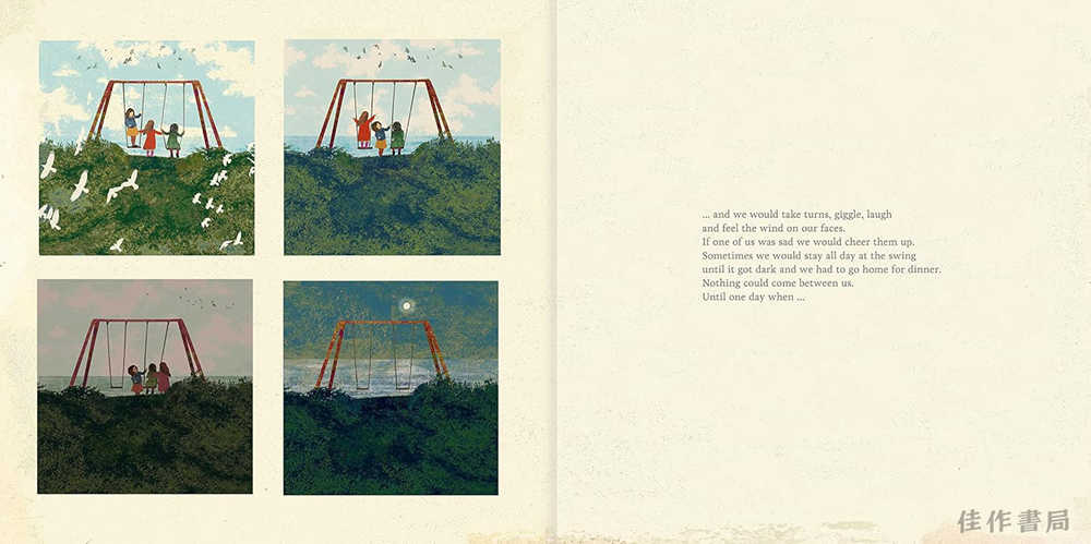 这本书以山丘上俯瞰水面的秋千为中心,深情地冥想了童年、成长、友谊与失去。“从我记事起,这个秋千就一直在这里,”叙述者说道,“我们曾一起站在这里,眺望大海,等待着什么发生改变……等待着新鲜、令人兴奋的事物。但每天都是一样的。”然而,随着季节的更迭和年月的流逝,一切都在变化。朋友来了又去,恋人相遇相拥,春天转为秋天,秋千架也因年久失修而吱嘎作响。特肯特鲁普以其标志性的拼贴画,用柔和而绚烂的色彩以及简约而有力的构图,绝妙地传达了所有这些变化。配上同样引人入胜的文字,各年龄段的读者都将感受到时间作为一种温柔却不可抗拒的力量,带来种种新的体验。随着叙述者的成长与智慧的增长,读者们也将明白,生命中最重要的记忆永远不会消逝。