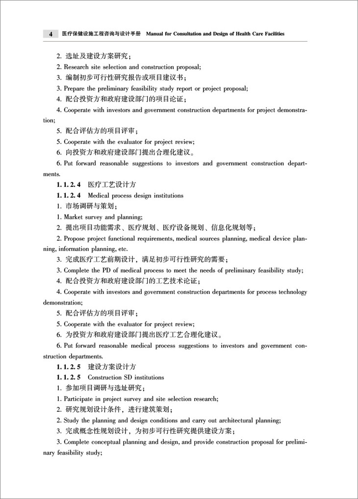 我国许多医疗保健设施的设计做不到位或难以做到投资方和业主所想象的那样, 其原因: 一是业主没有提出具体的设计要求, 由设计师按自己假想的要求生造, 没有明确设计任务书或只有简单设计要求的项目比比皆是; 二是许多投资方不了解咨询和设计全过程的程序和工作内容, 既没有前期研究也没有策划; 三是长期习惯的“脑体倒挂”观念, 把前期研究创造性技术工作及相应费用延后积压到施工阶段, 导致施工后期无图可用, 迫使施工机构用二次设计的形式为前期设计买单, 甚至胁迫设计变更; 违背了建筑工程也是科学创造的规律。