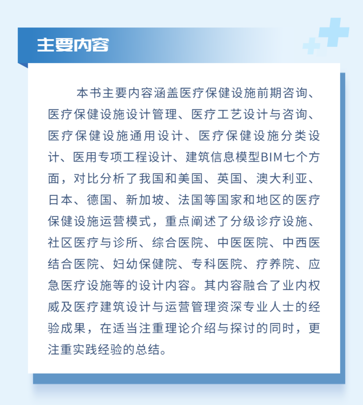 本书适合从事医疗保健设施的投资、咨询、设计、管理人员阅读, 也可作为高等院校建筑及其相关学科的辅助教学资料。