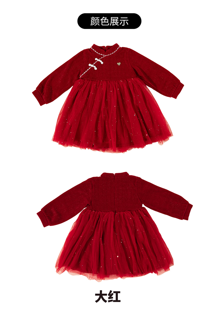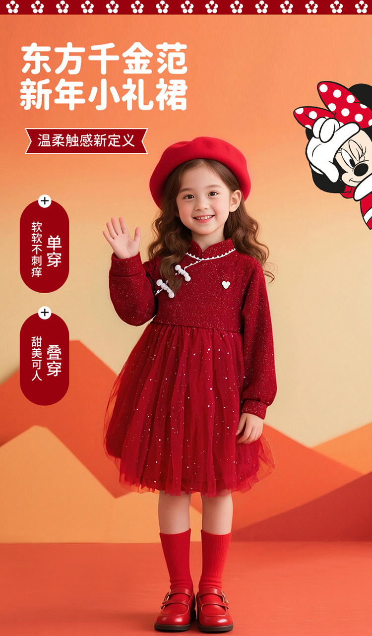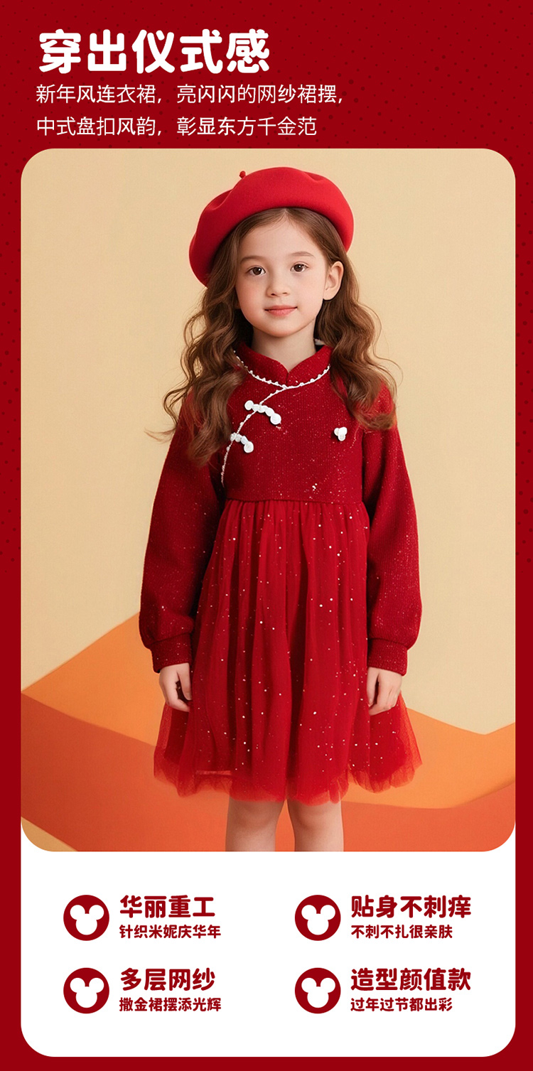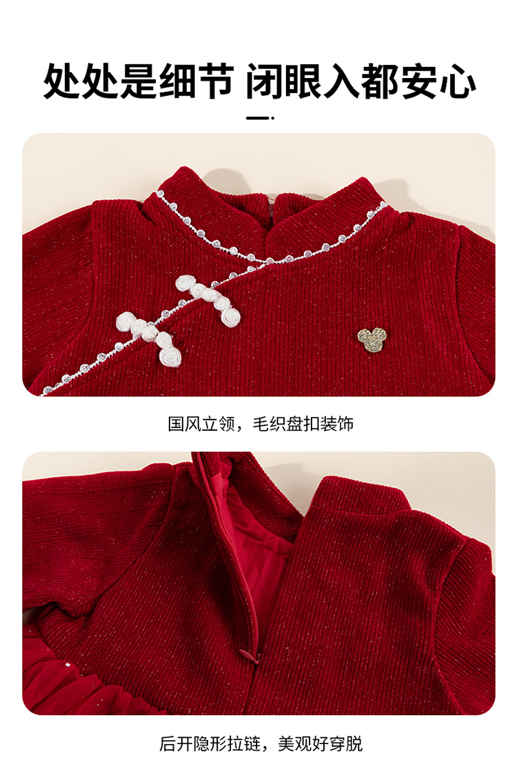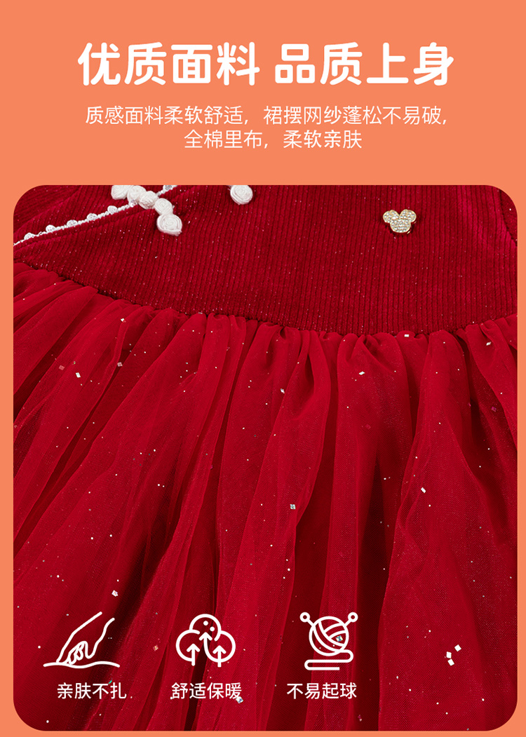 迪士尼春秋新款女童国风长袖连衣裙国潮大红洋气公主裙XD1EQ001