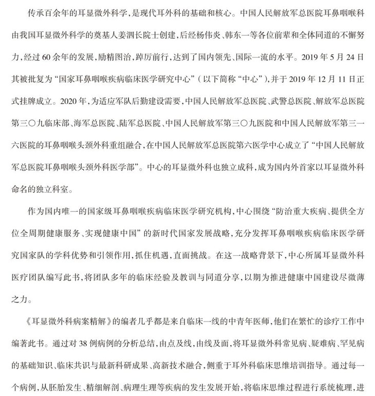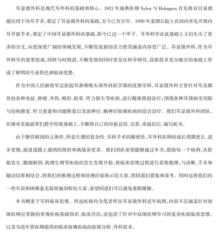 全书通过对38例病例的分析总结,由点及线,由线及面,将耳显微外科常见病、疑难病、罕见病的基础知识、临床共识与最新科研成果、高新技术融合,侧重于耳外科临床思维培训指导。通过每一个病例,从胚胎发生、精细解剖、病理生理等疾病的发生发展开始,将临床思维过程进行系统梳理,进而与辅助检查、手术要点和随访结果相结合,层层递进,充分展示推理过程、处理经验,甚至包括失误和困难。