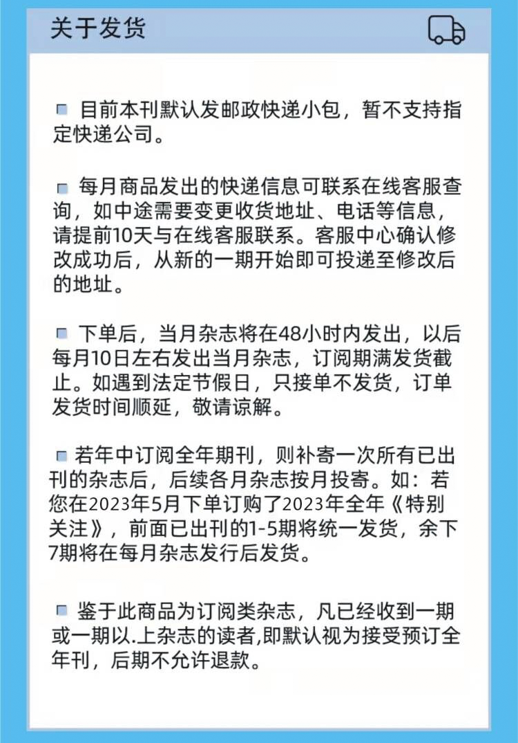 温馨提示:2025年上半月刊的上半年订阅会一次发出1-6期。2025年上半月刊的下半年订阅是7-12期,会依次寄出新刊。7期会在6月10日左右寄出,直至11月的12期为止。杂志志以邮政速递的形式寄出(遇到物流管控及法定节假日将有所延迟)。如需中途改地址,请与客服沟通留言。