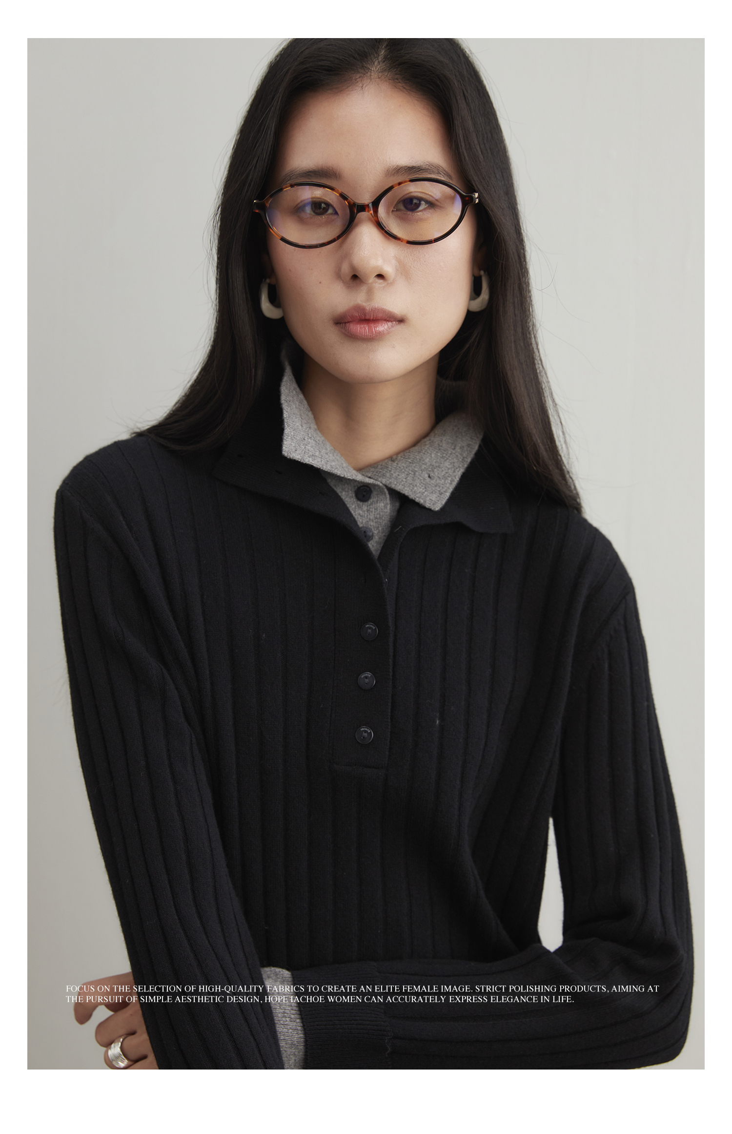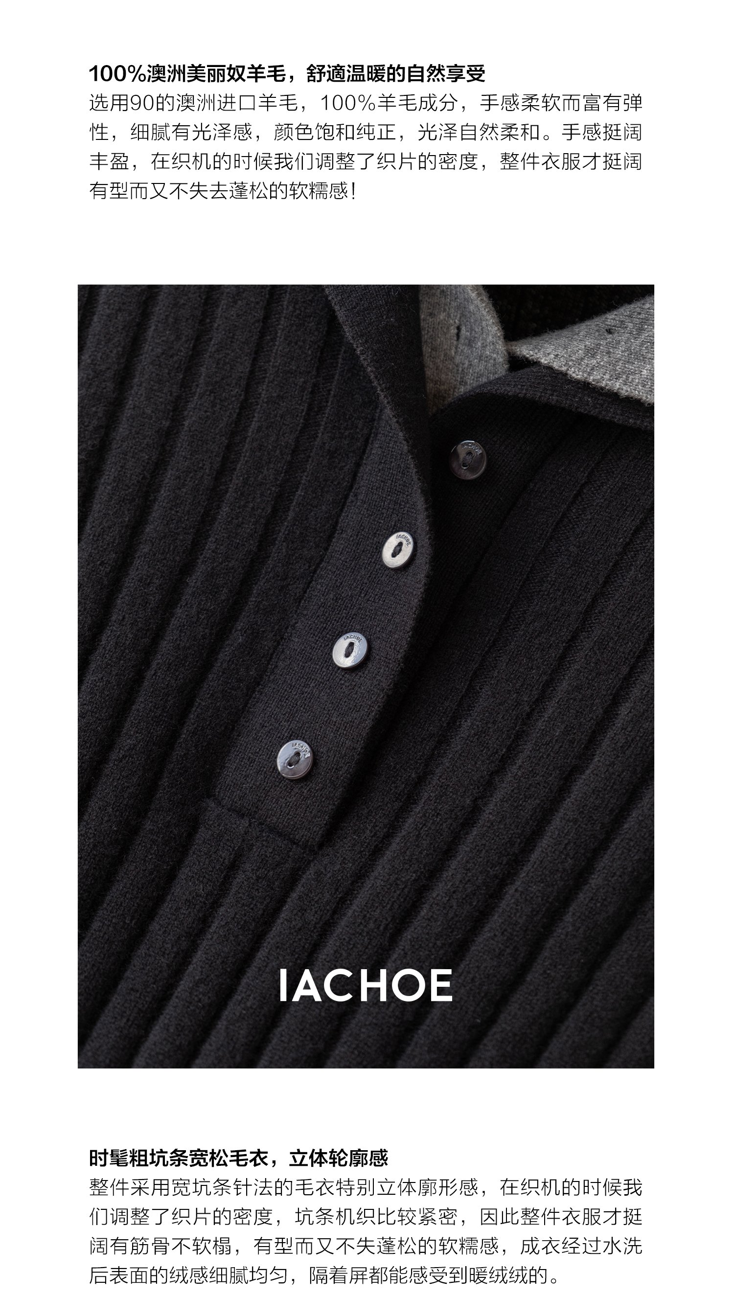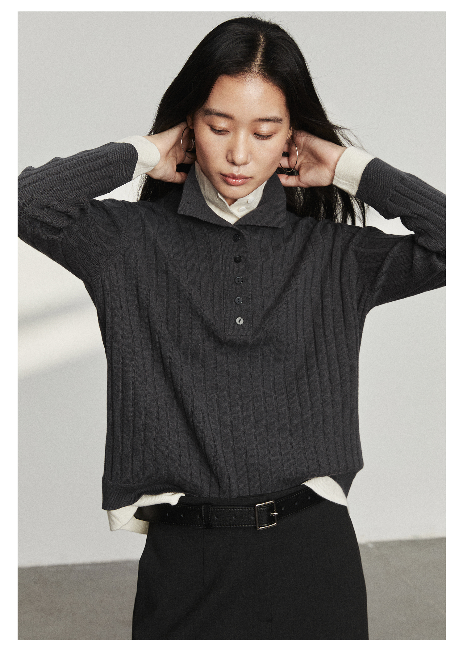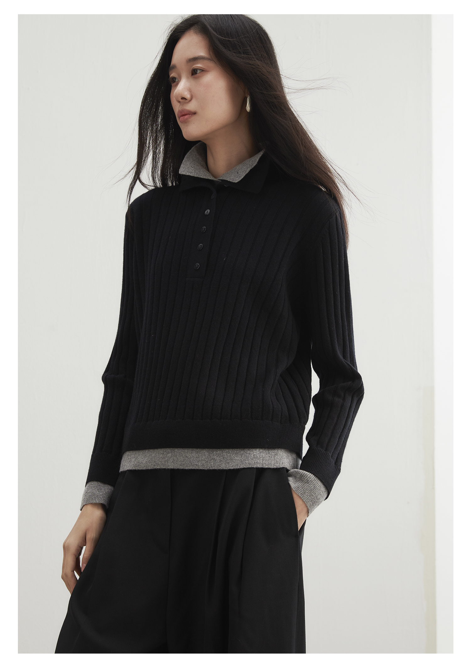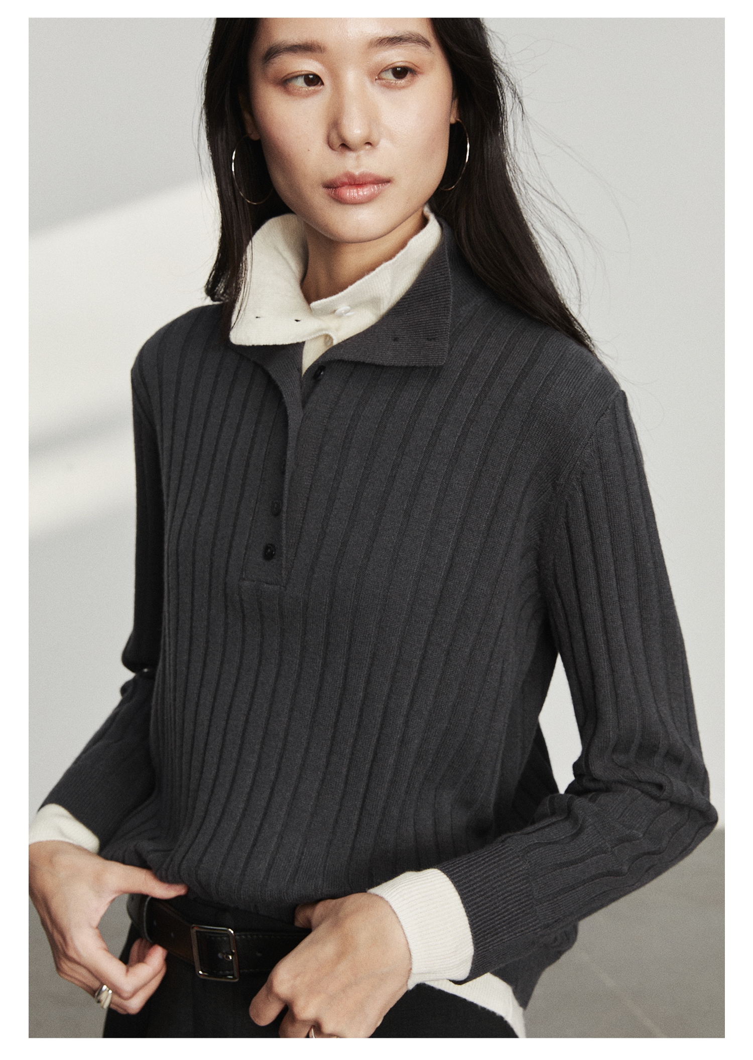 棉仓3561505007-秋季时髦粗坑条毛衣 松弛宽松叠叠乐假两件翻领羊毛衫