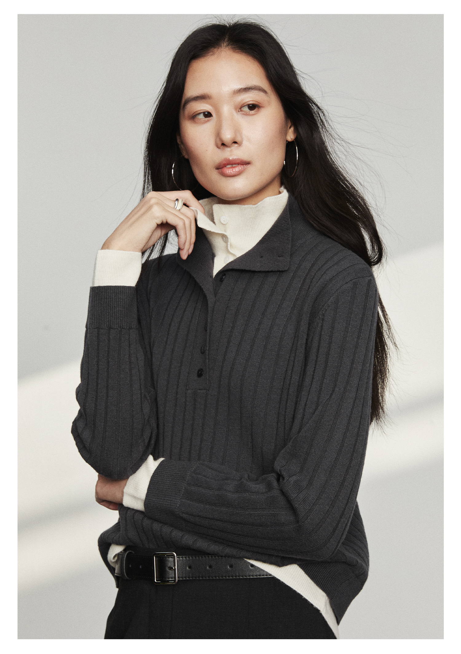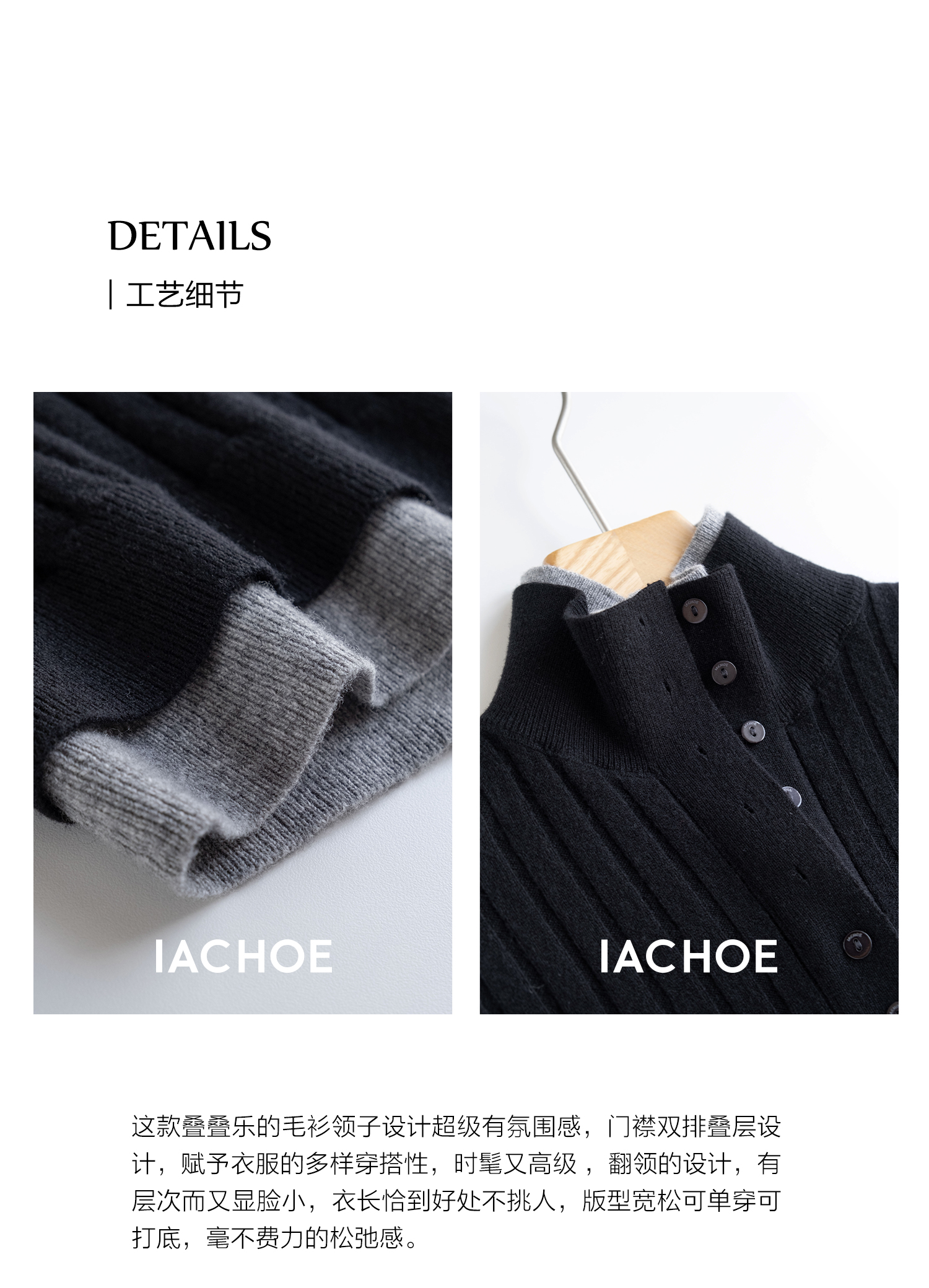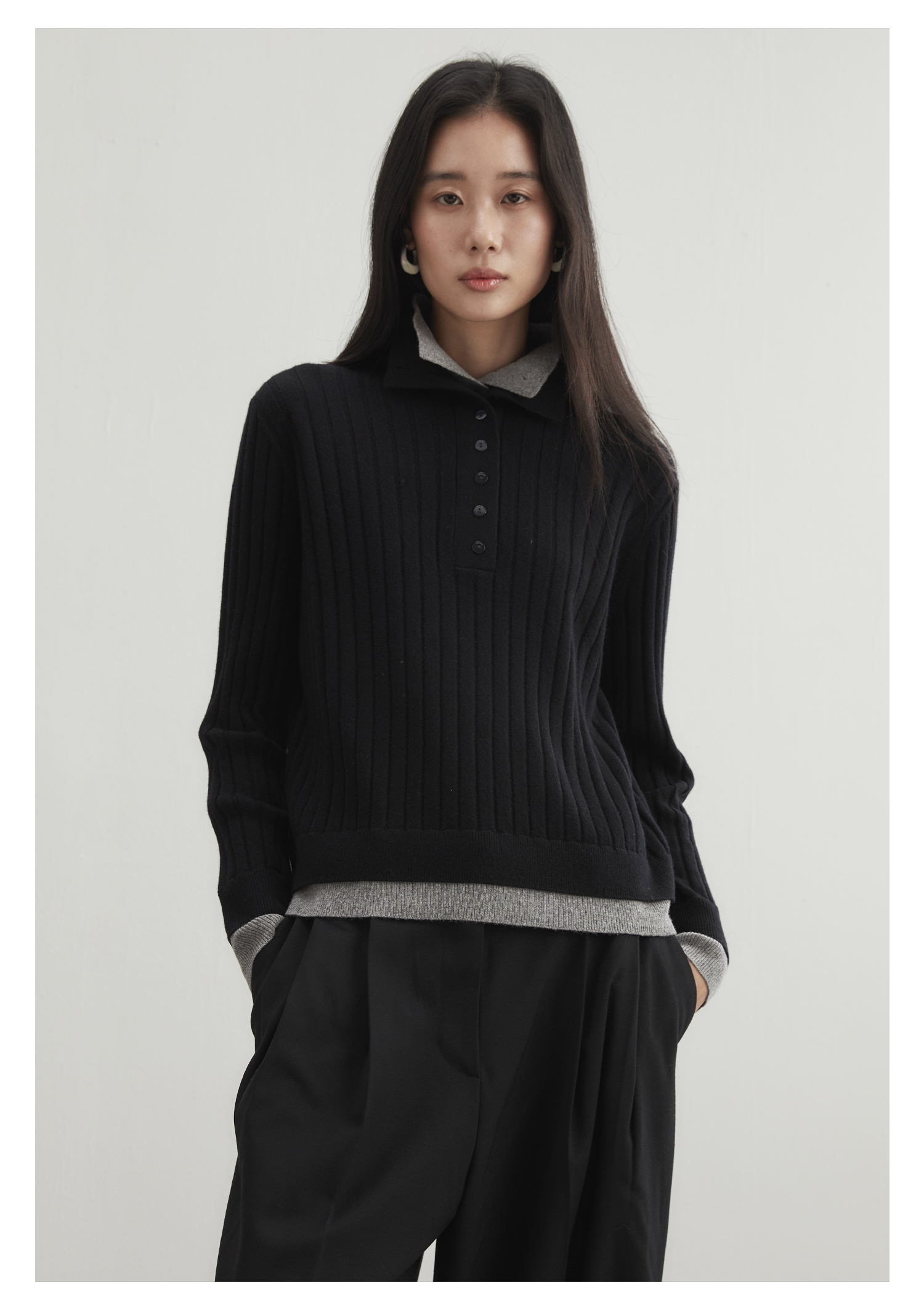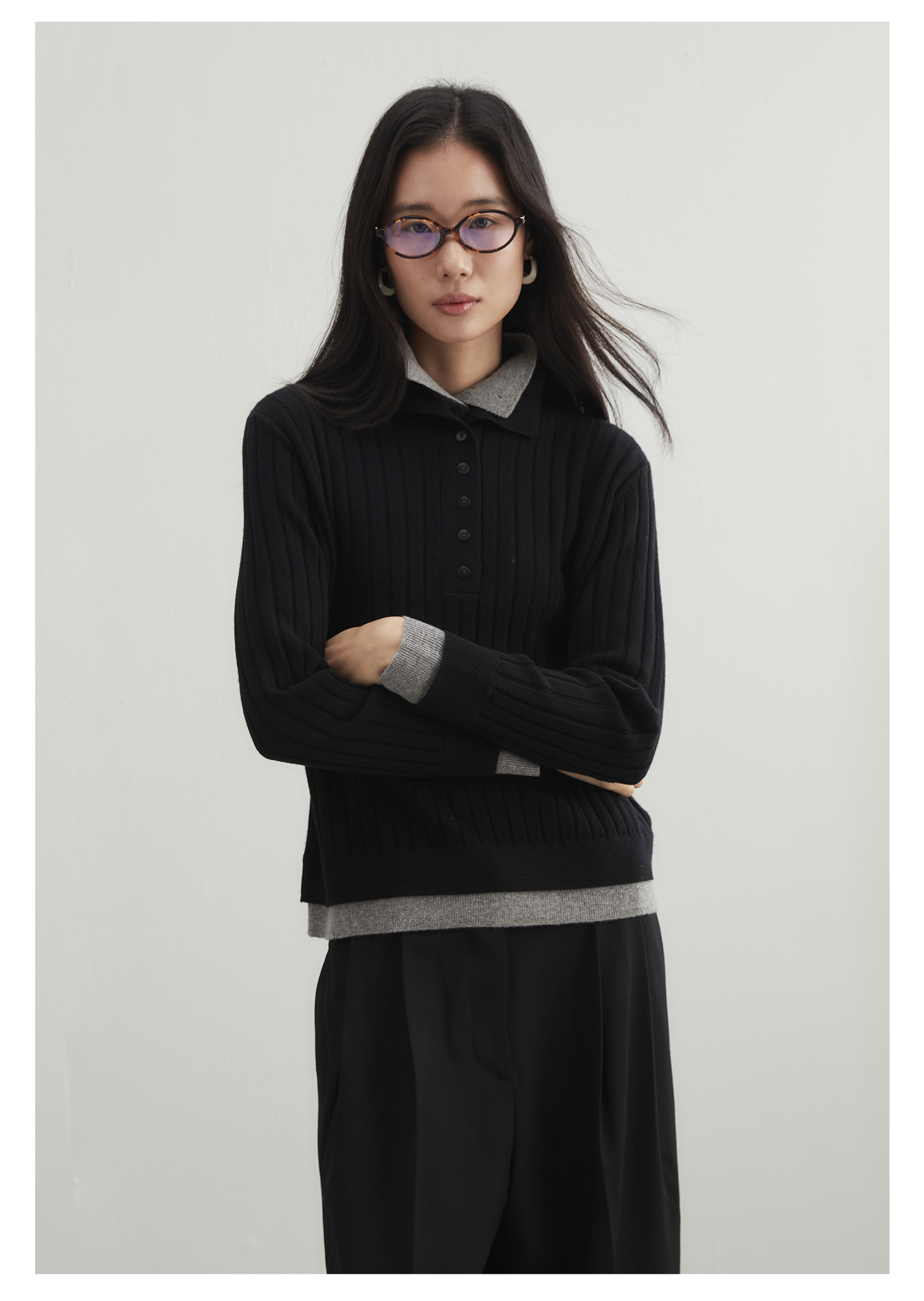 棉仓3561505007-秋季时髦粗坑条毛衣 松弛宽松叠叠乐假两件翻领羊毛衫