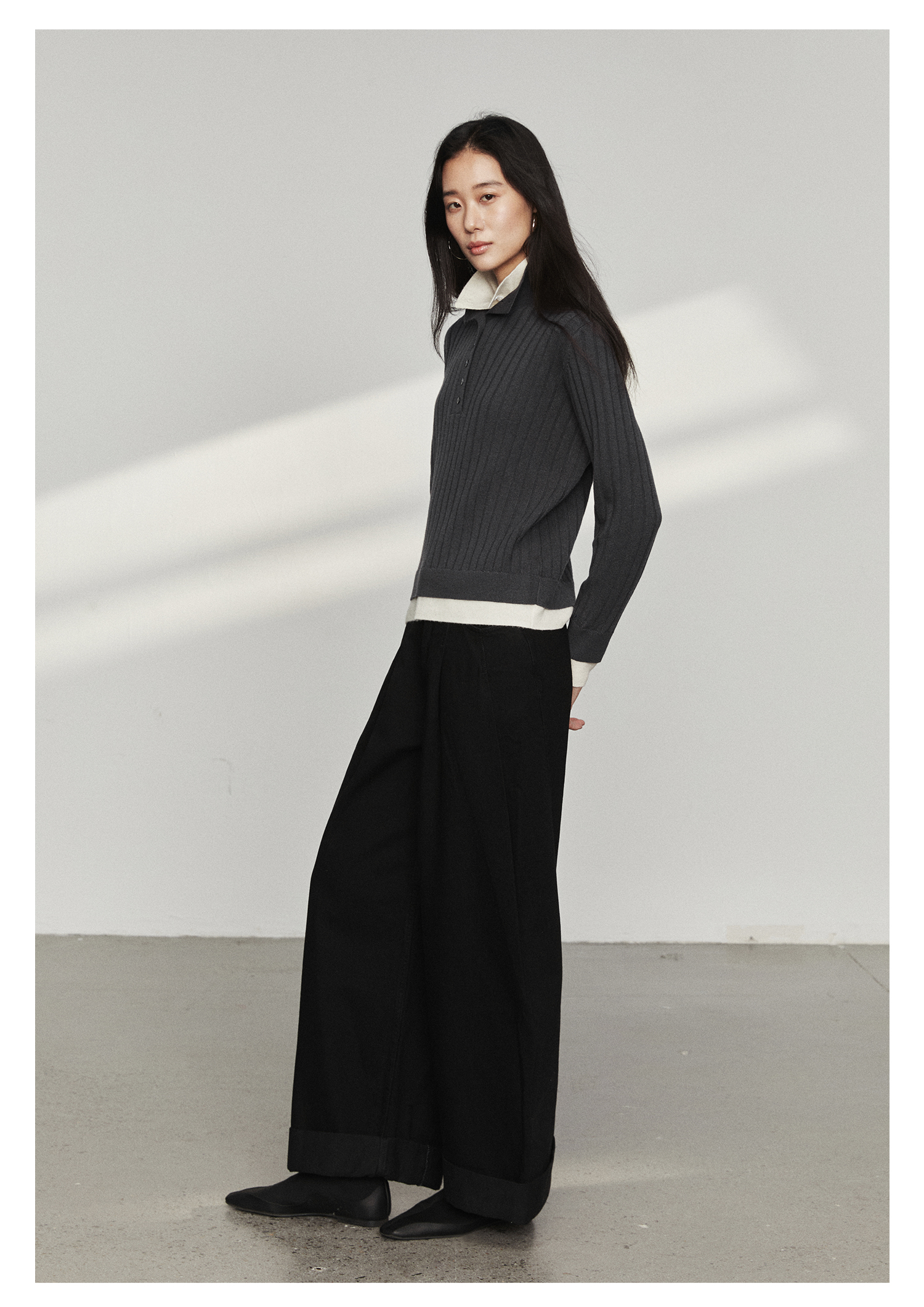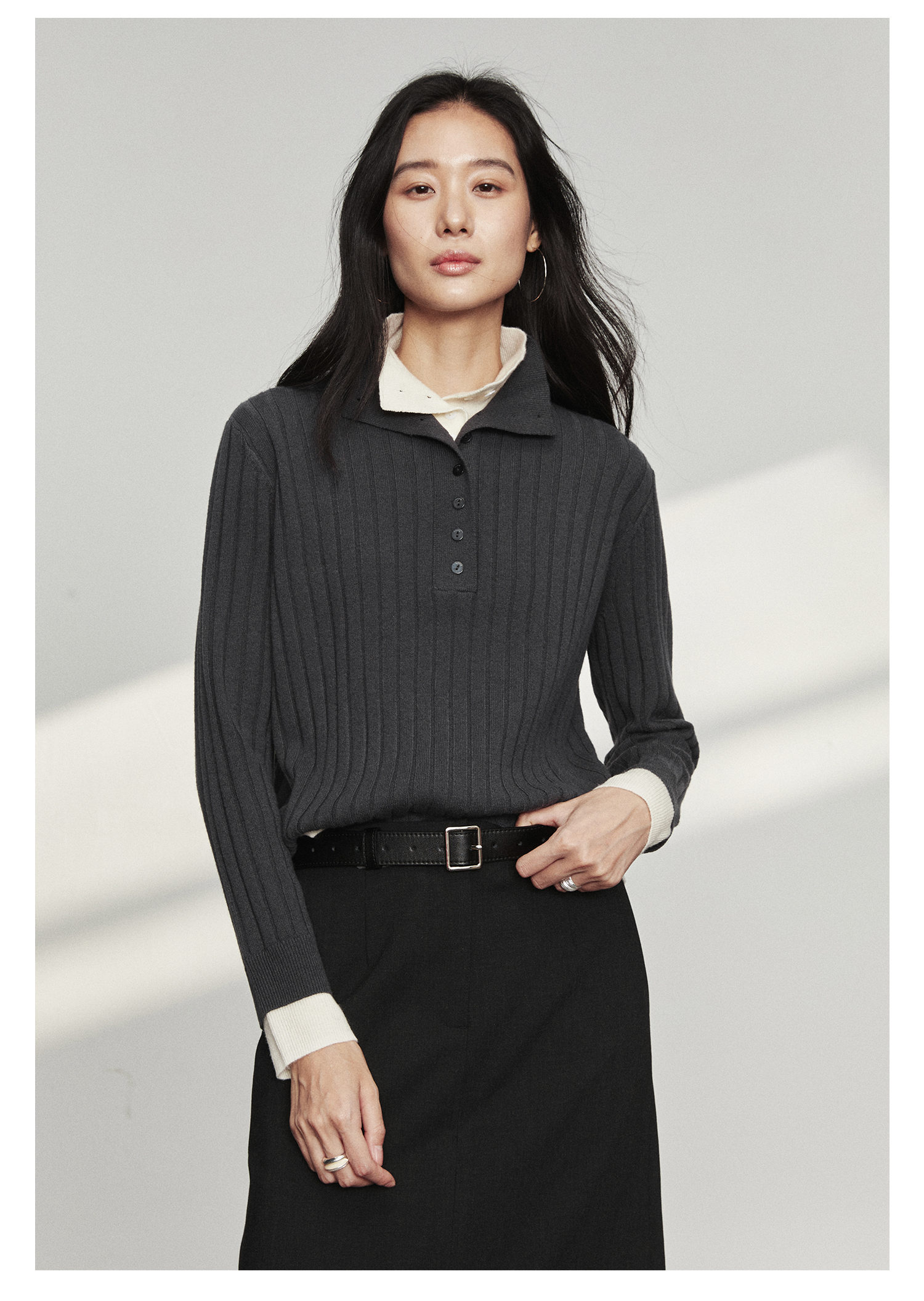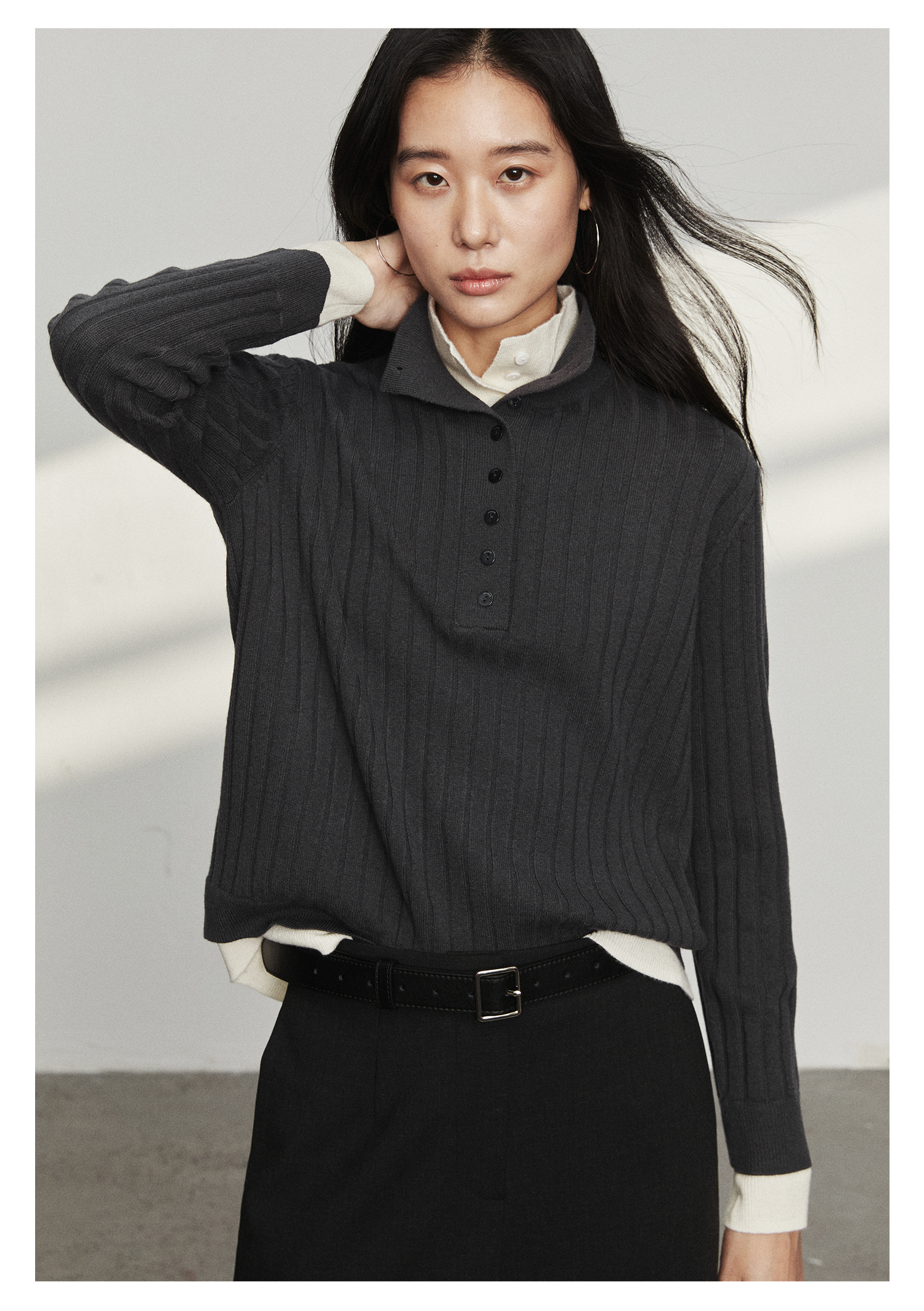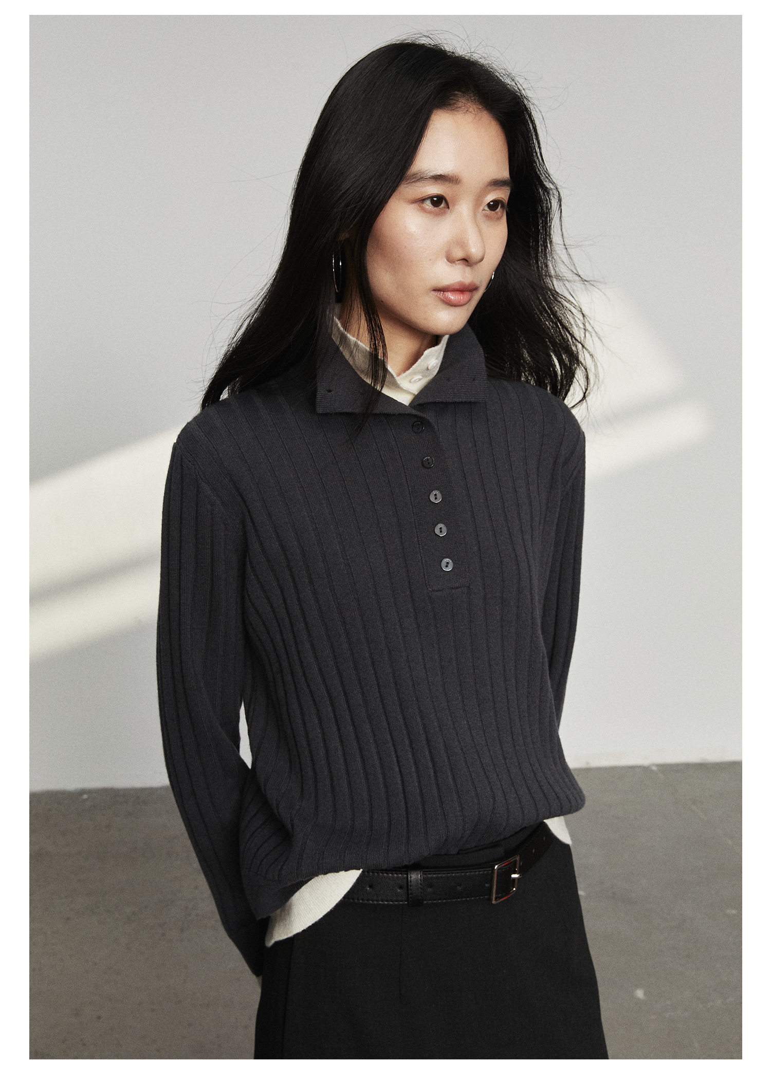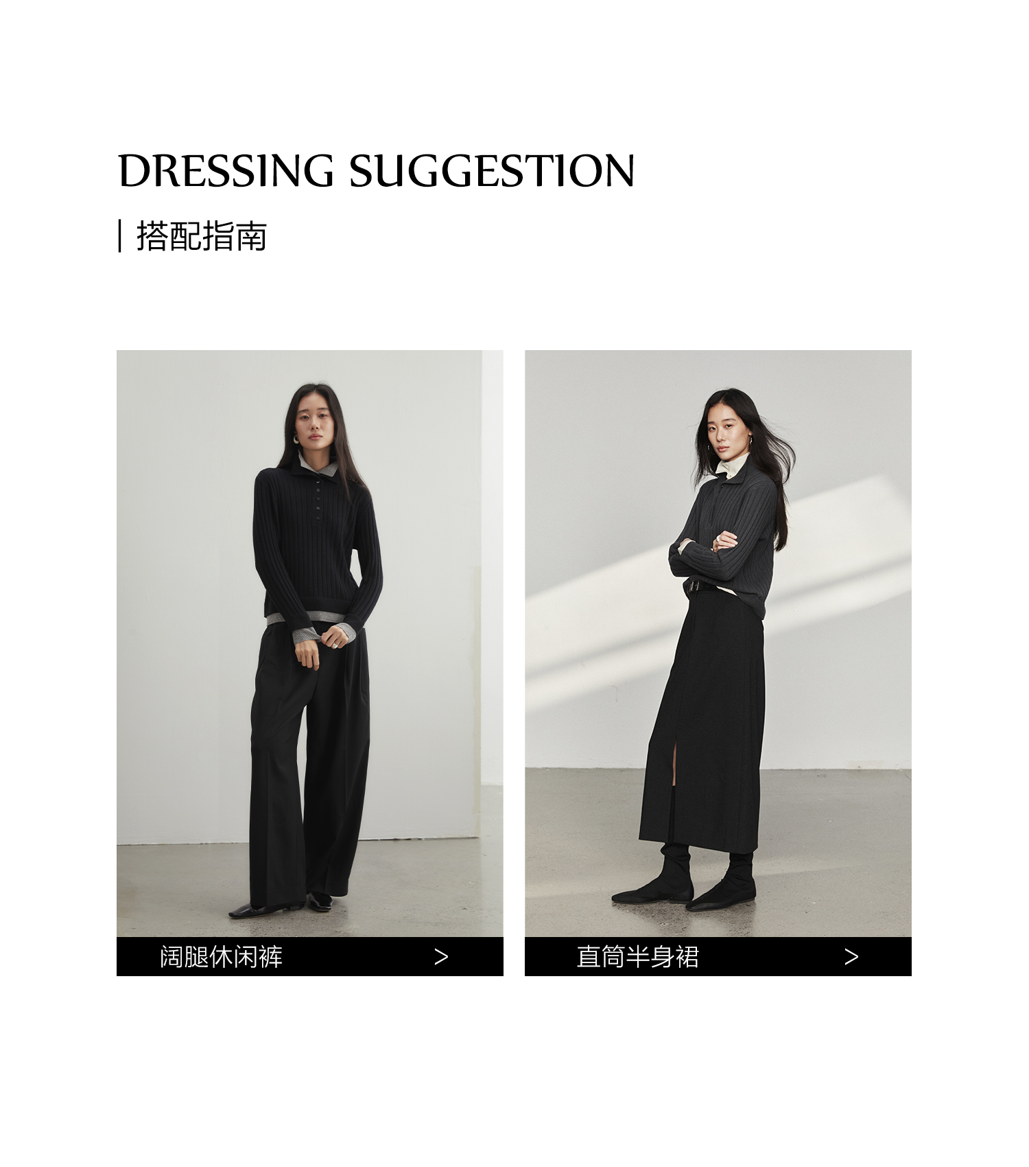 棉仓3561505007-秋季时髦粗坑条毛衣 松弛宽松叠叠乐假两件翻领羊毛衫
