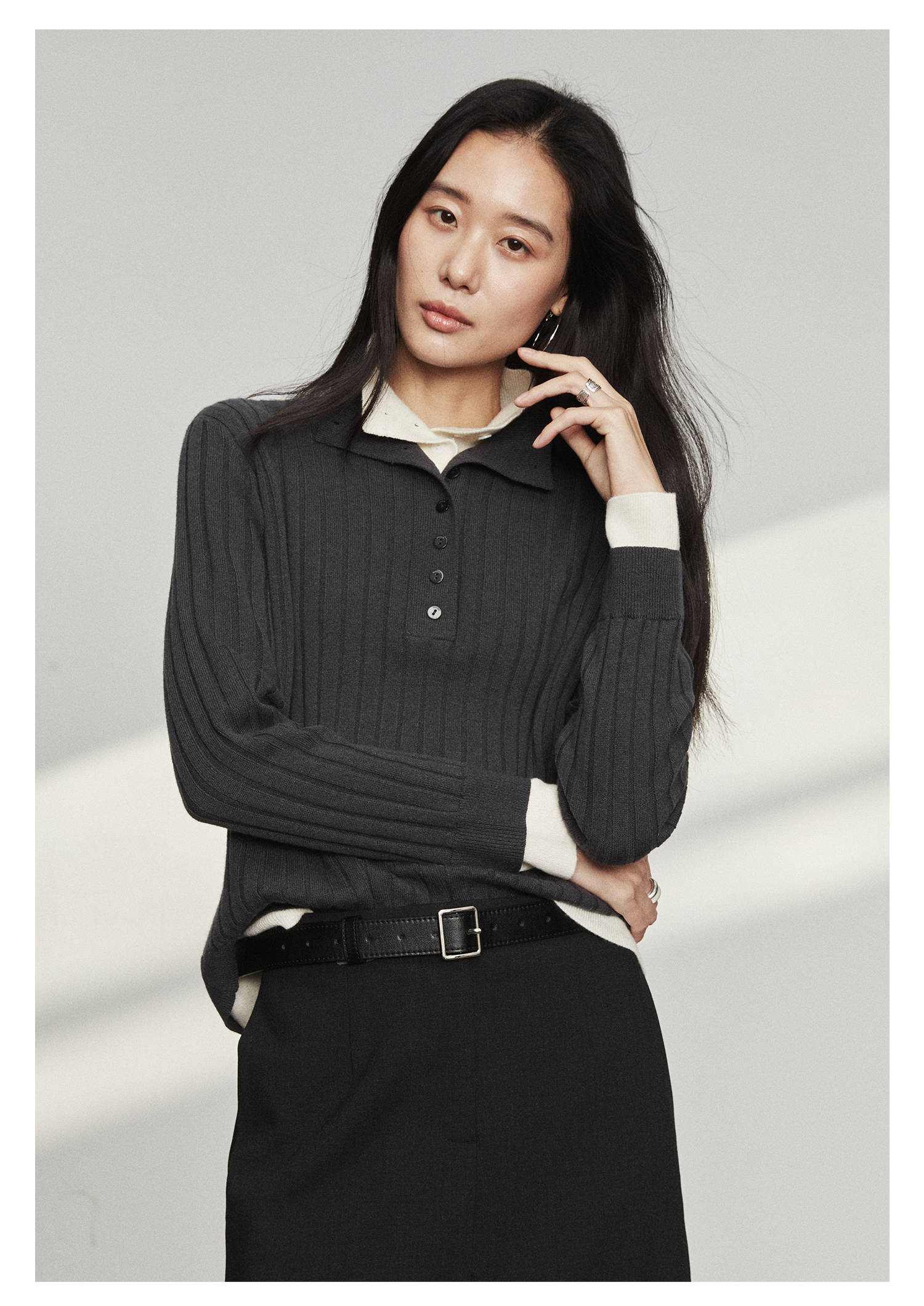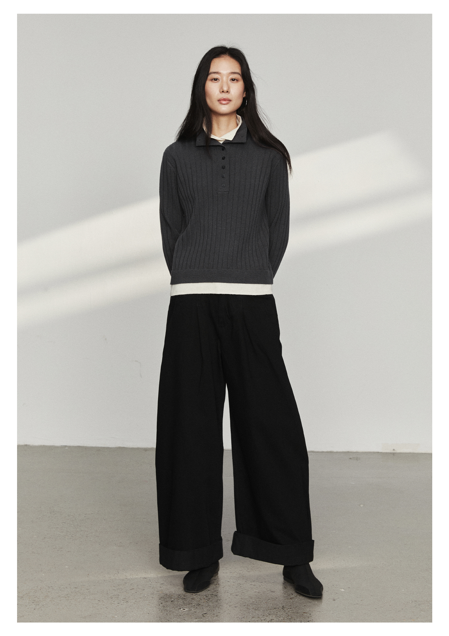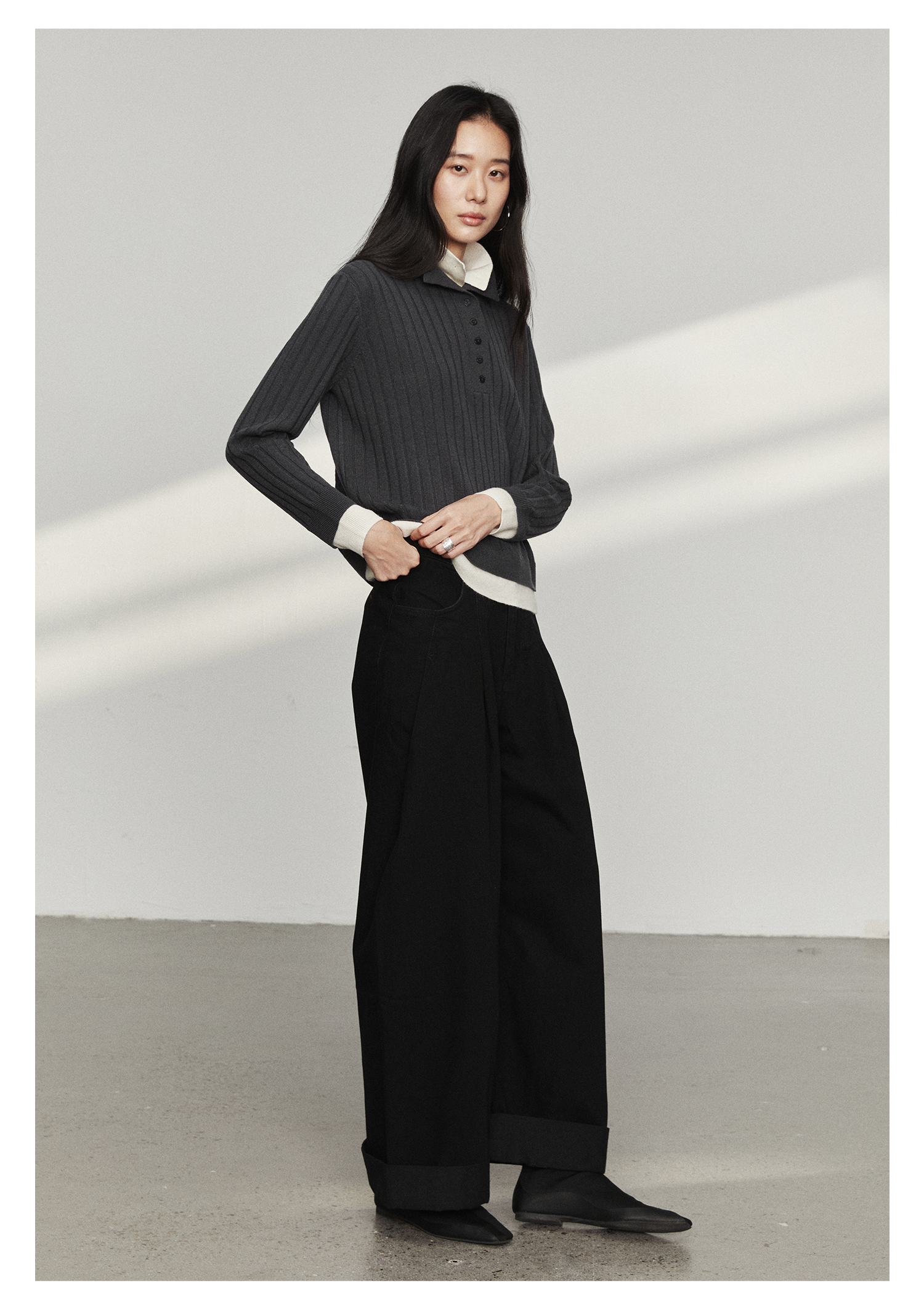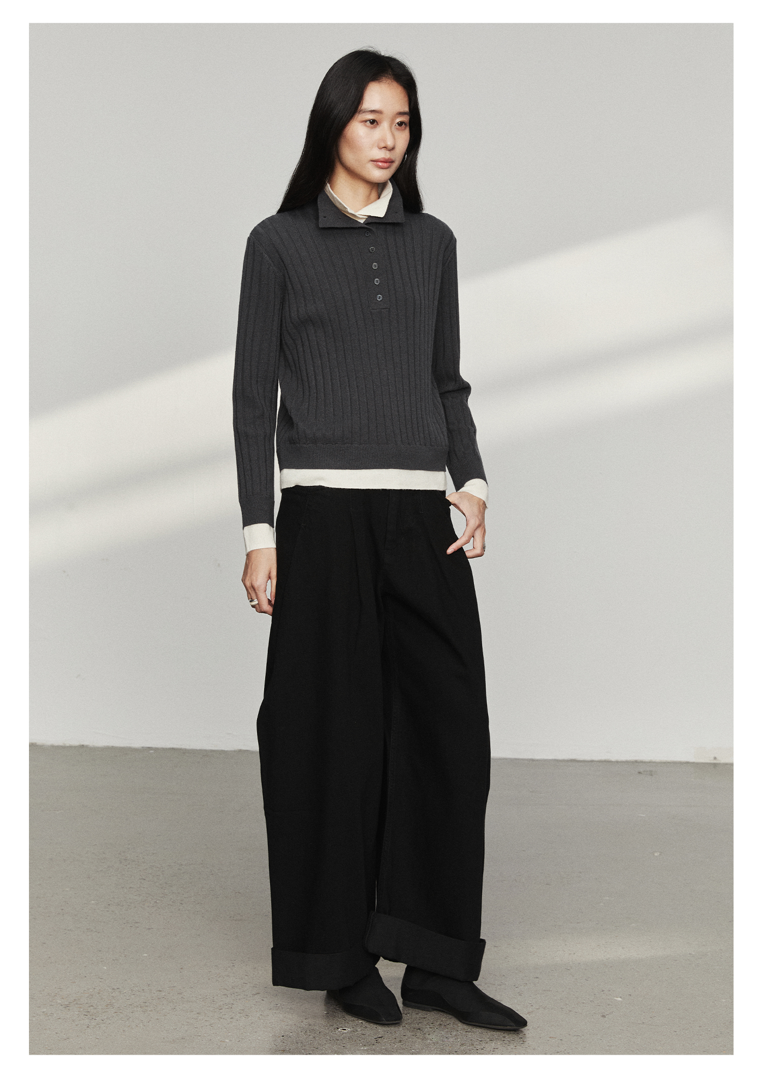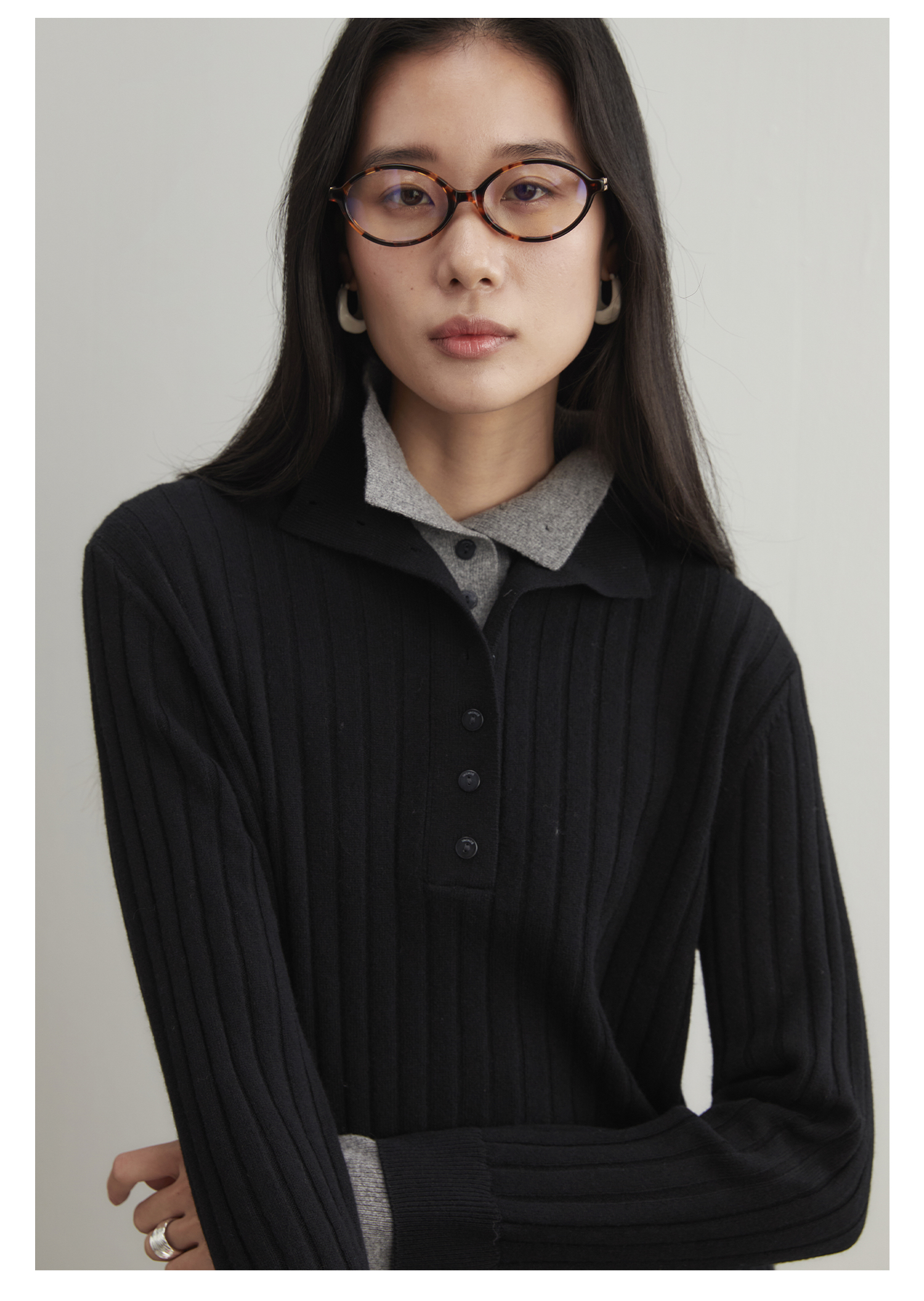 棉仓3561505007-秋季时髦粗坑条毛衣 松弛宽松叠叠乐假两件翻领羊毛衫