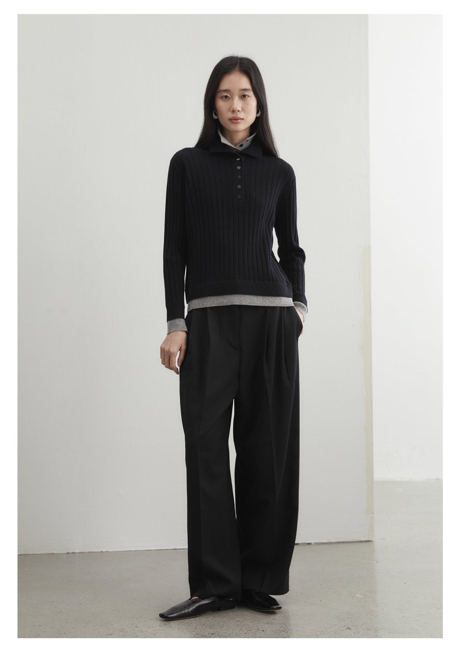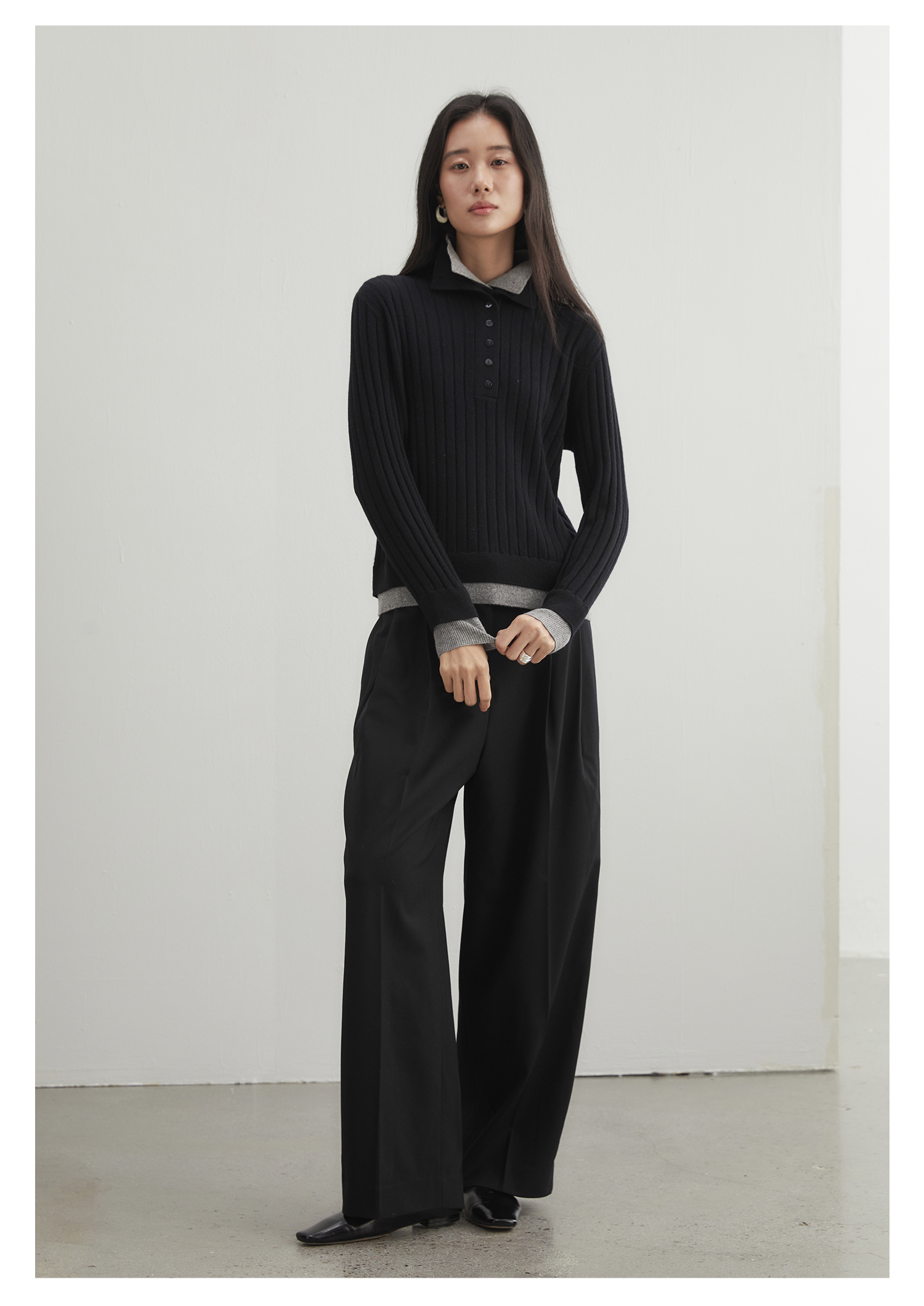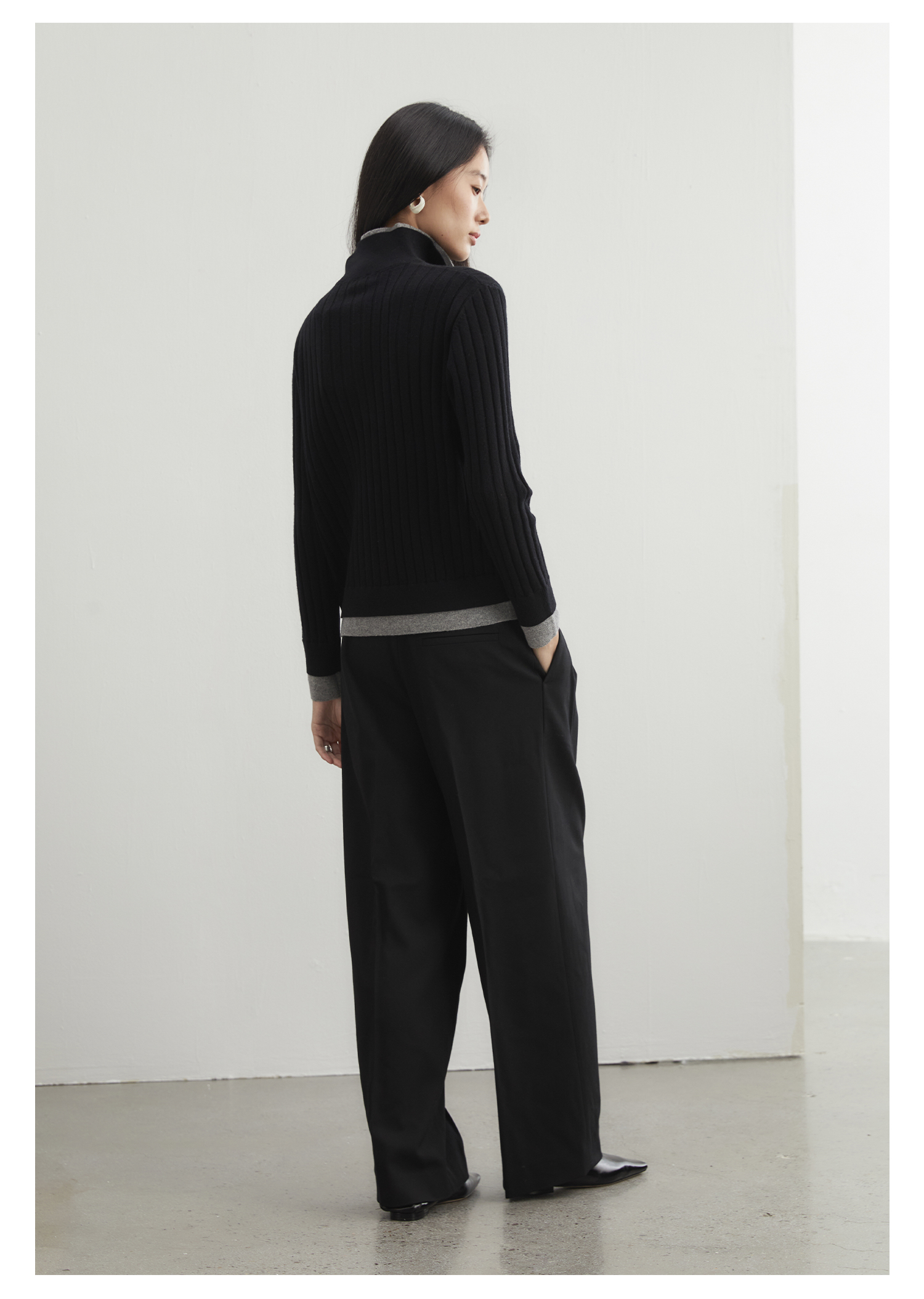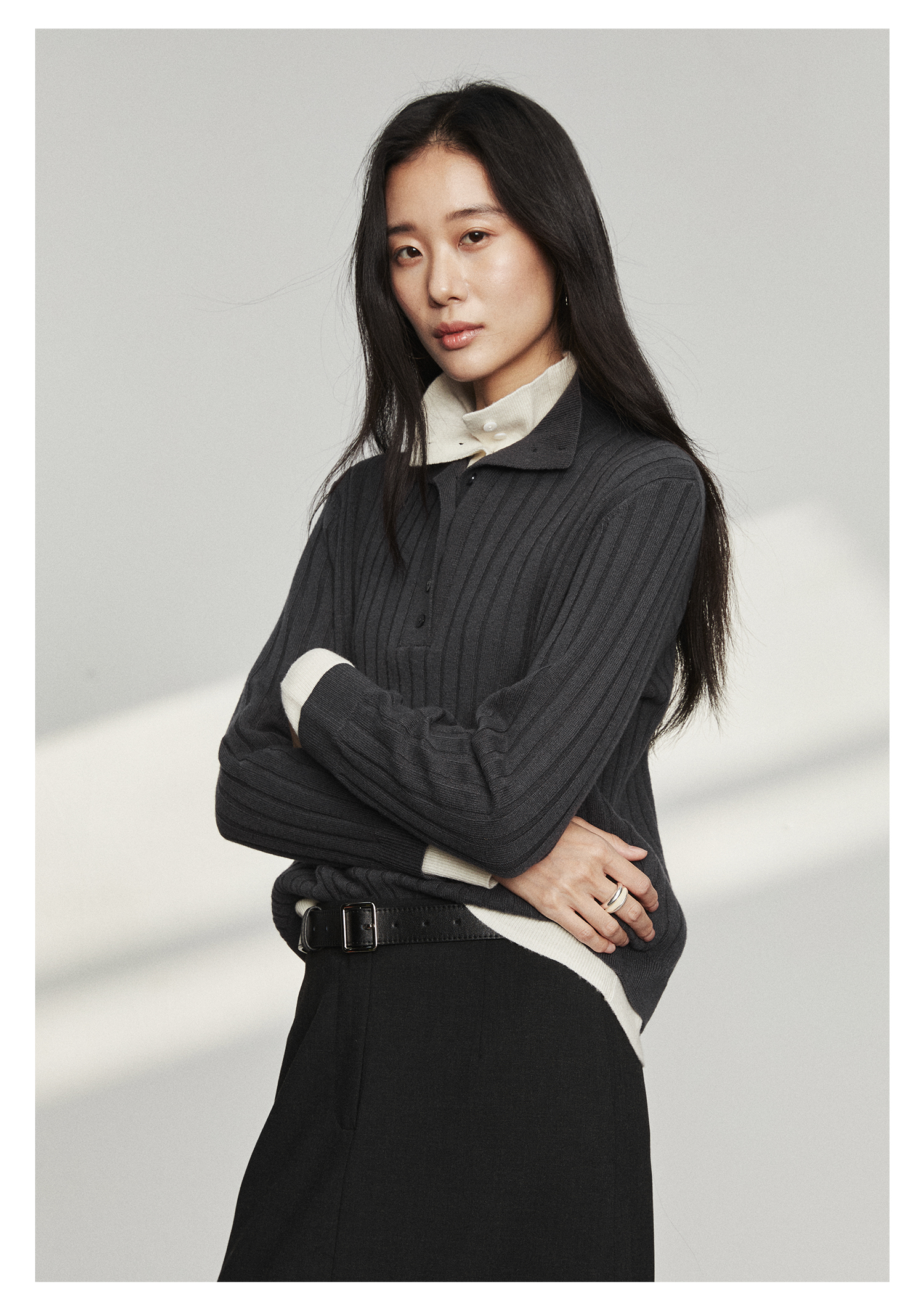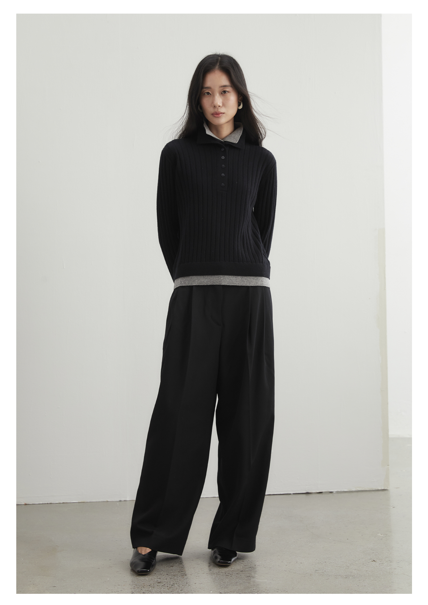 棉仓3561505007-秋季时髦粗坑条毛衣 松弛宽松叠叠乐假两件翻领羊毛衫