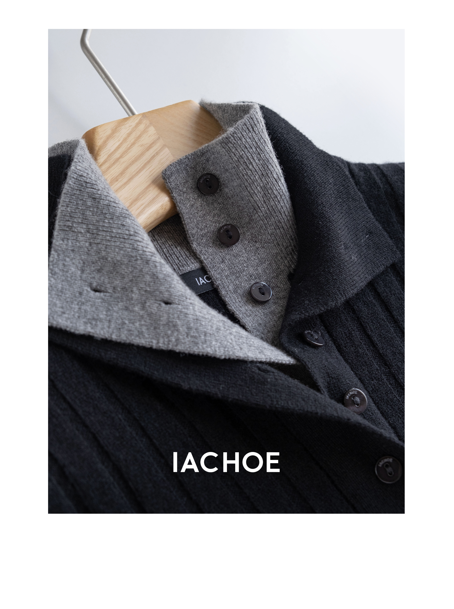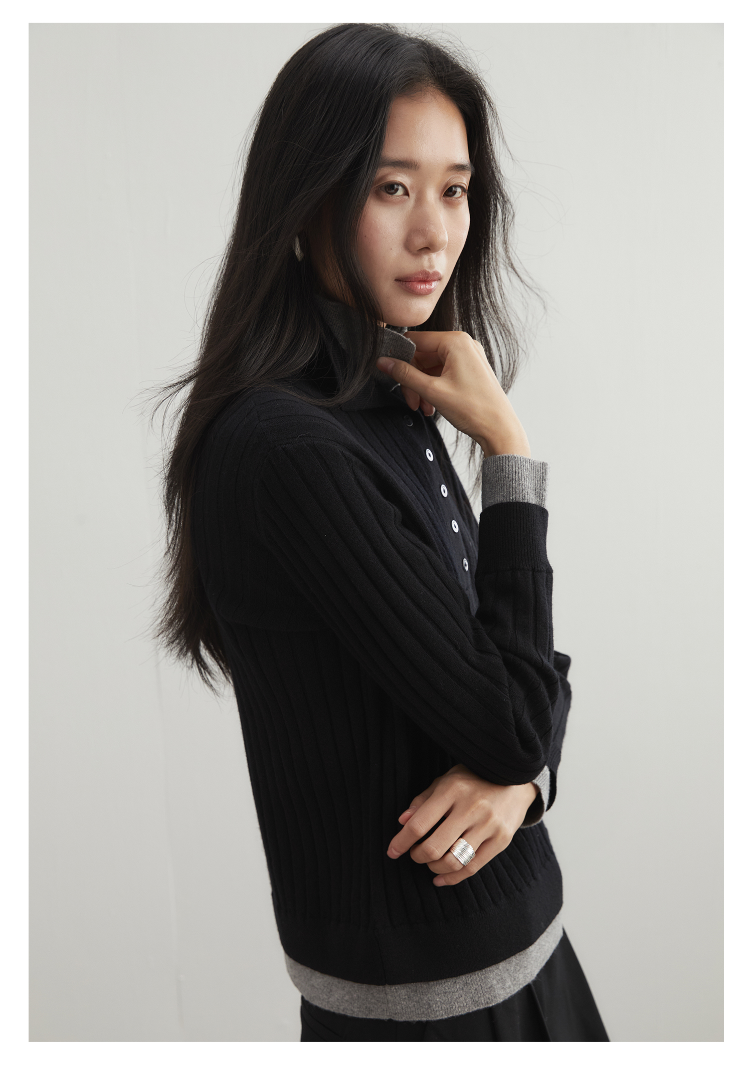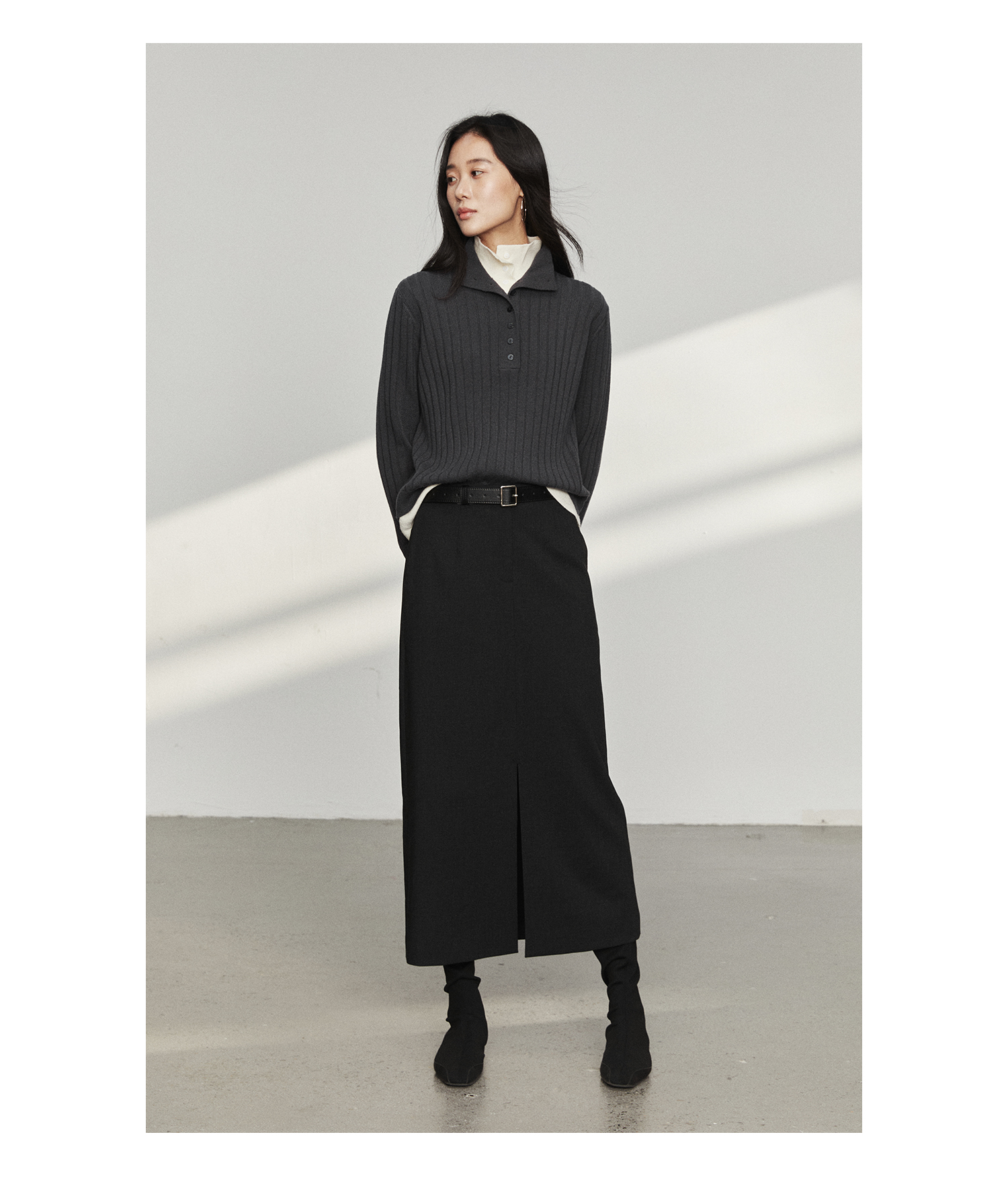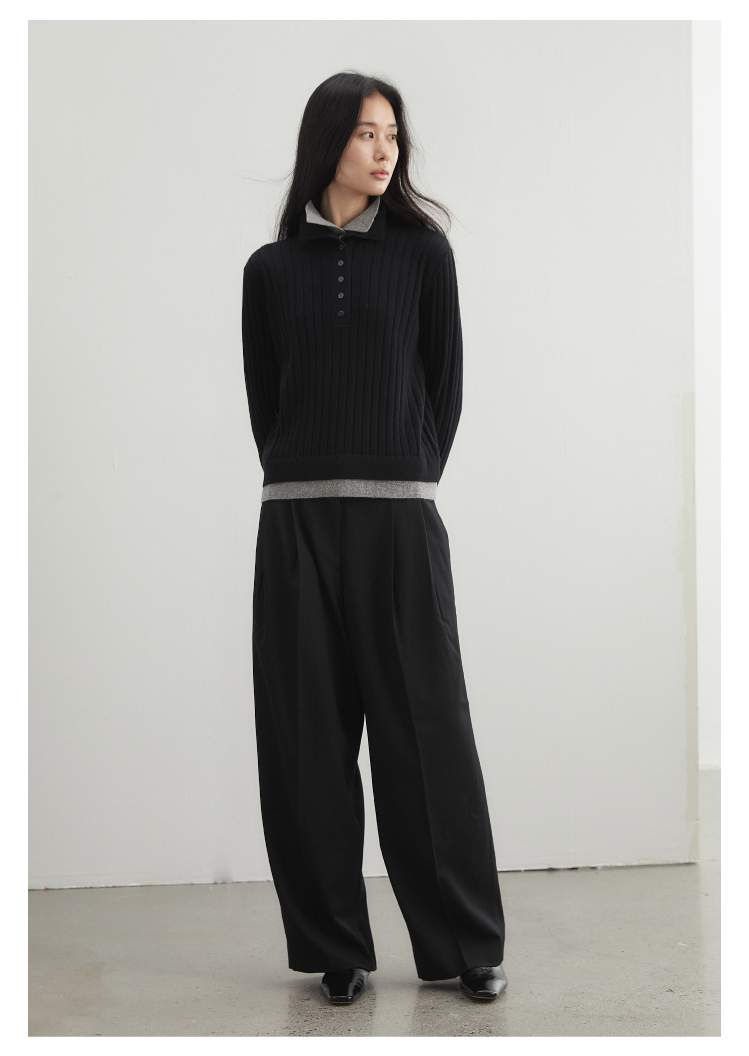 棉仓3561505007-秋季时髦粗坑条毛衣 松弛宽松叠叠乐假两件翻领羊毛衫