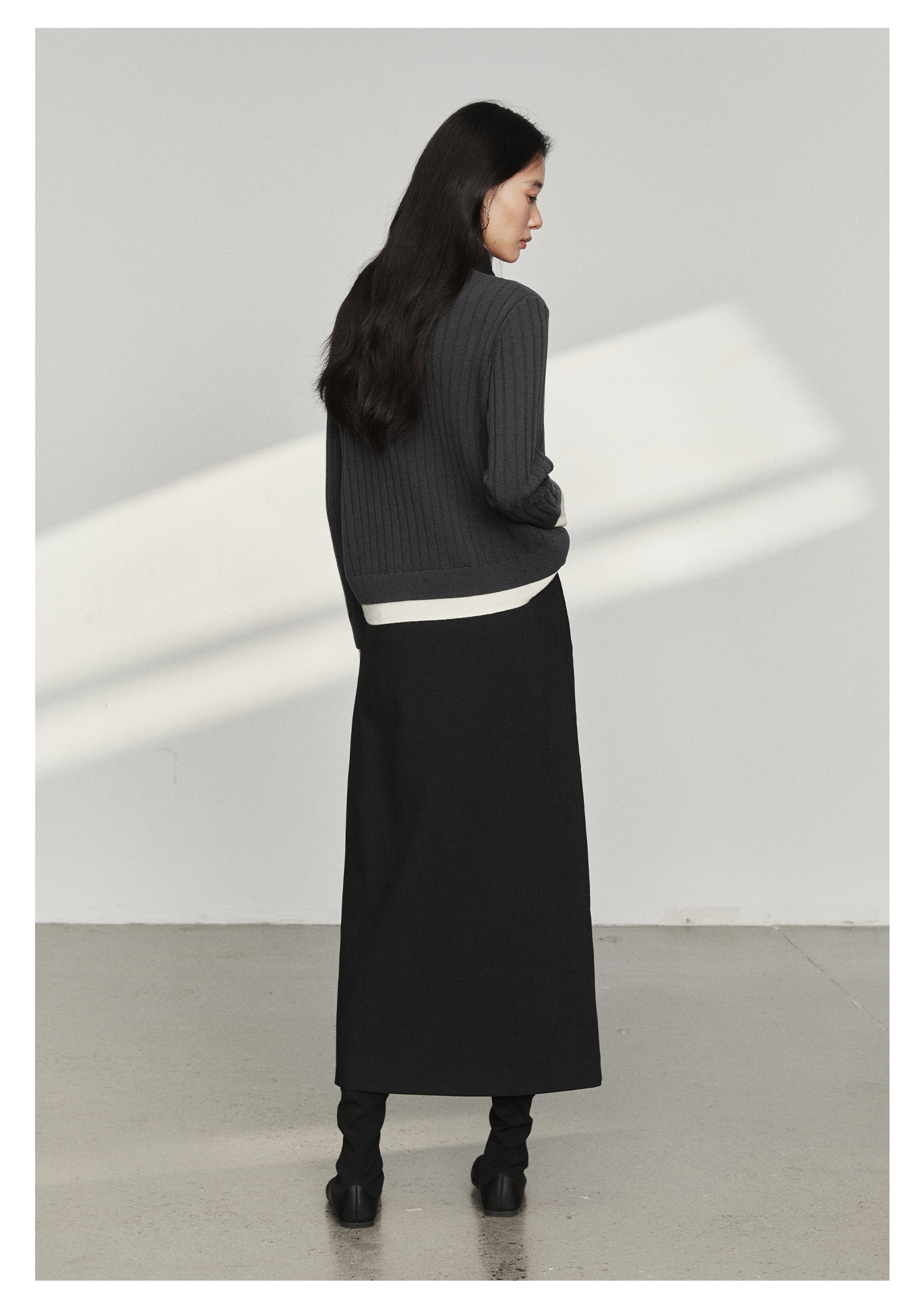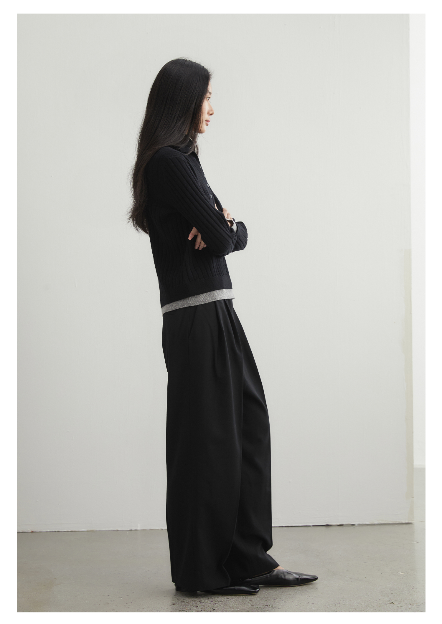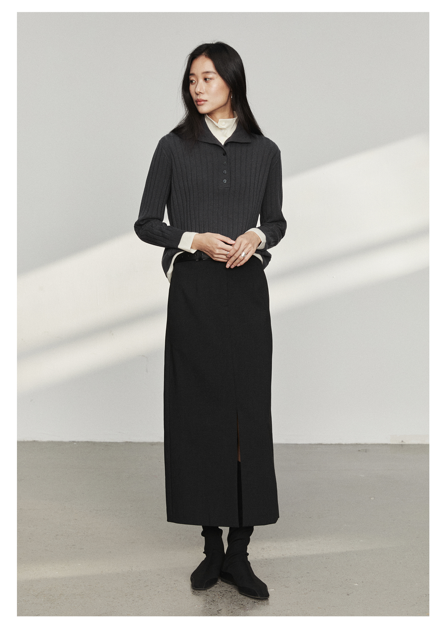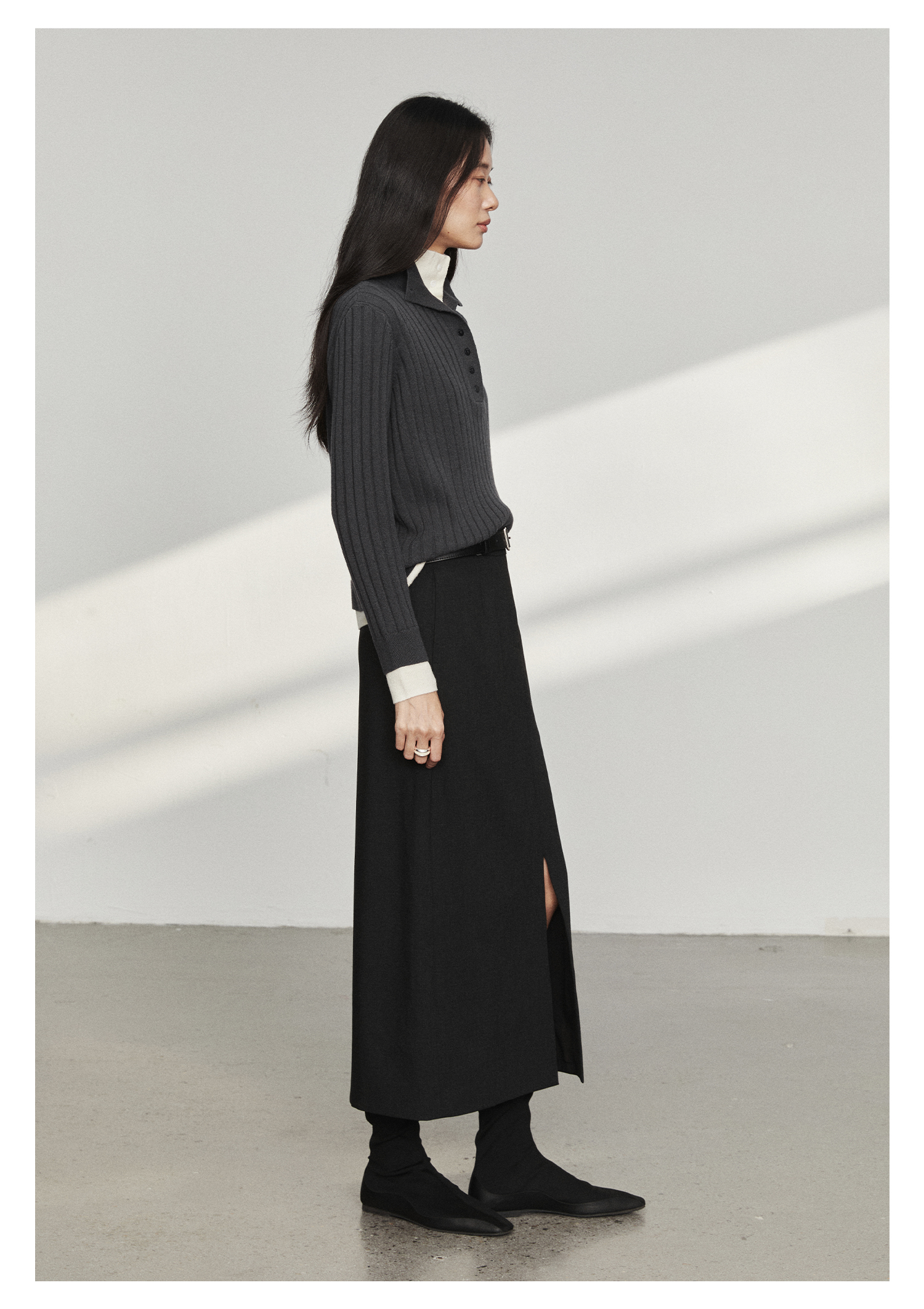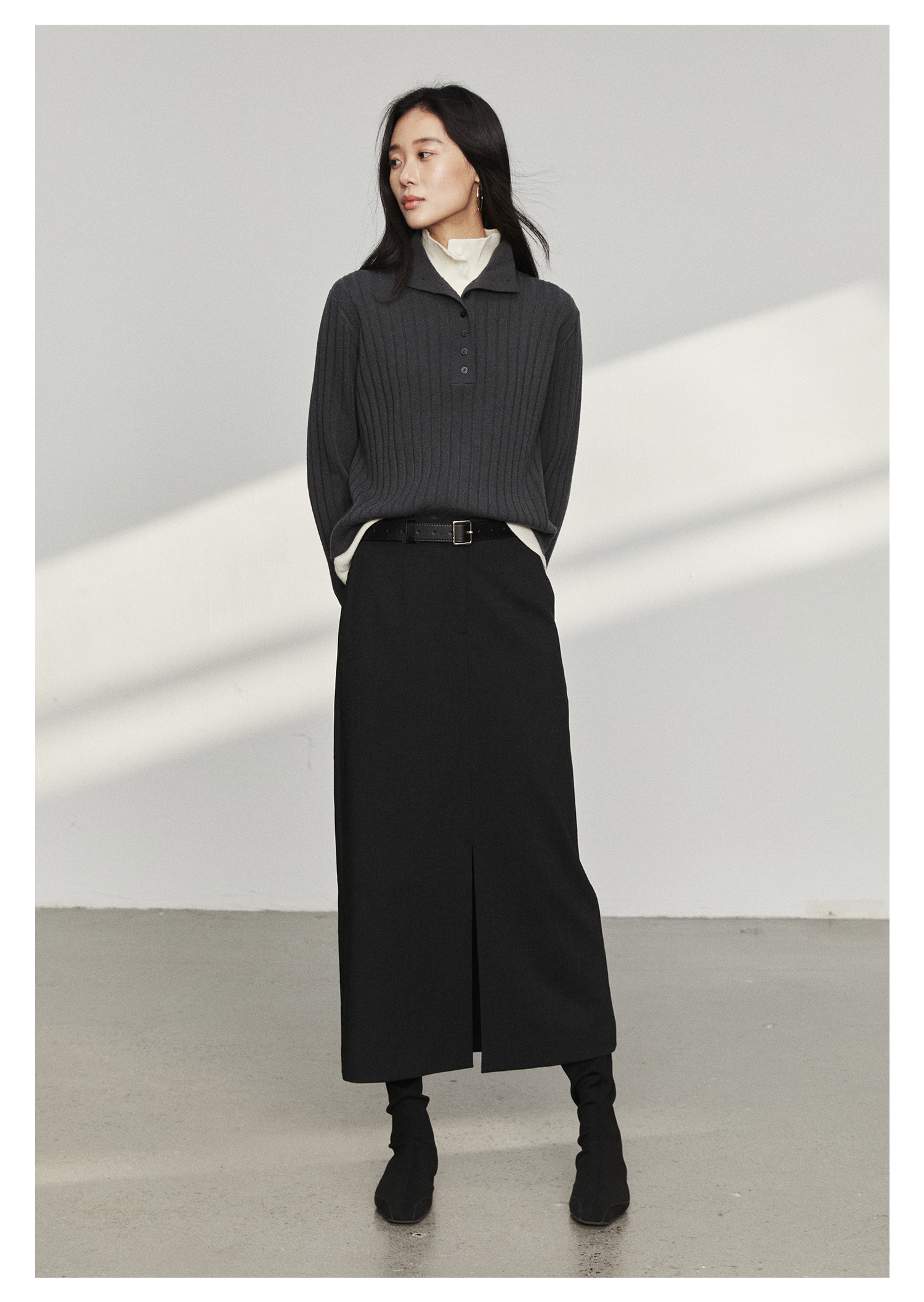 棉仓3561505007-秋季时髦粗坑条毛衣 松弛宽松叠叠乐假两件翻领羊毛衫