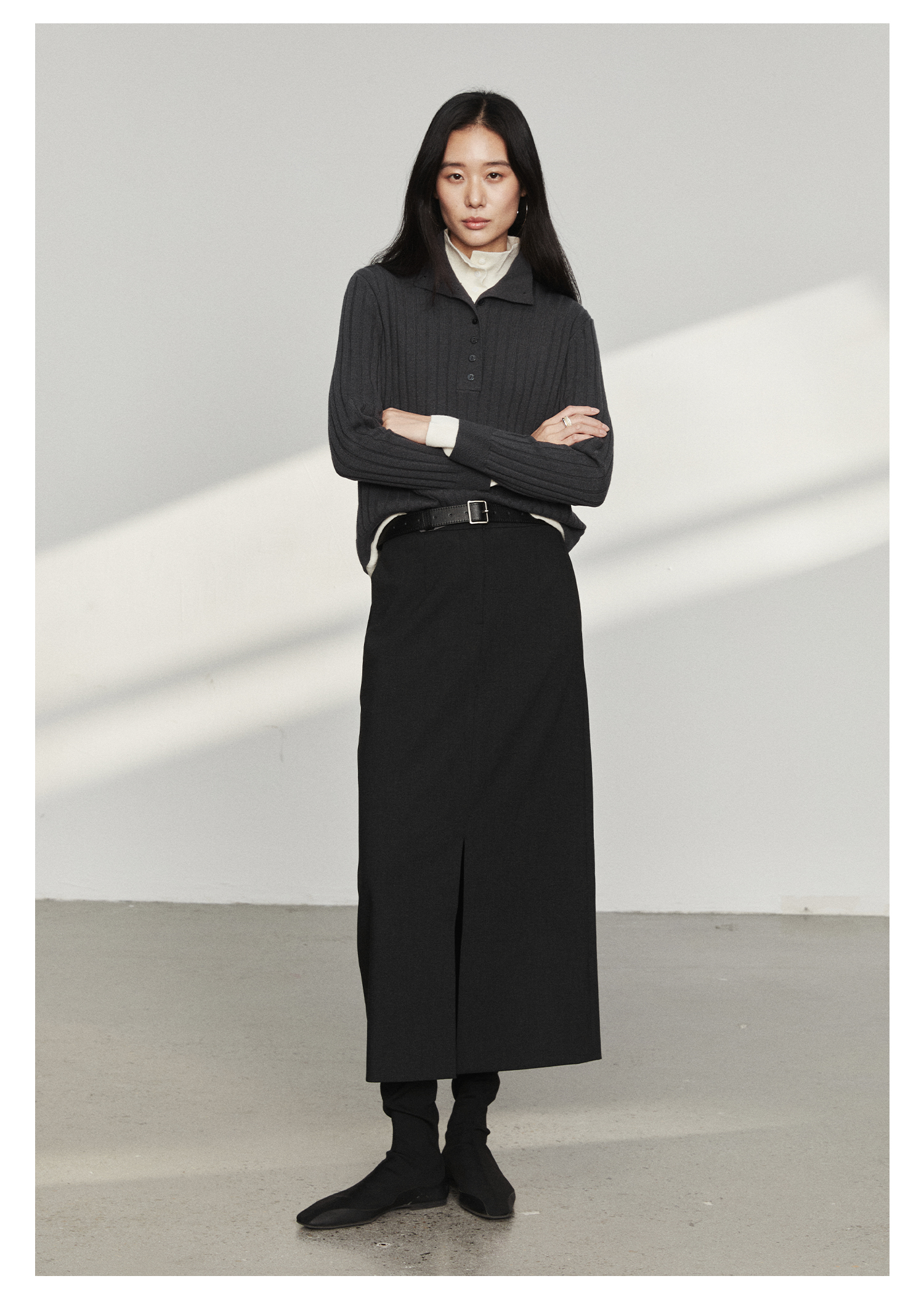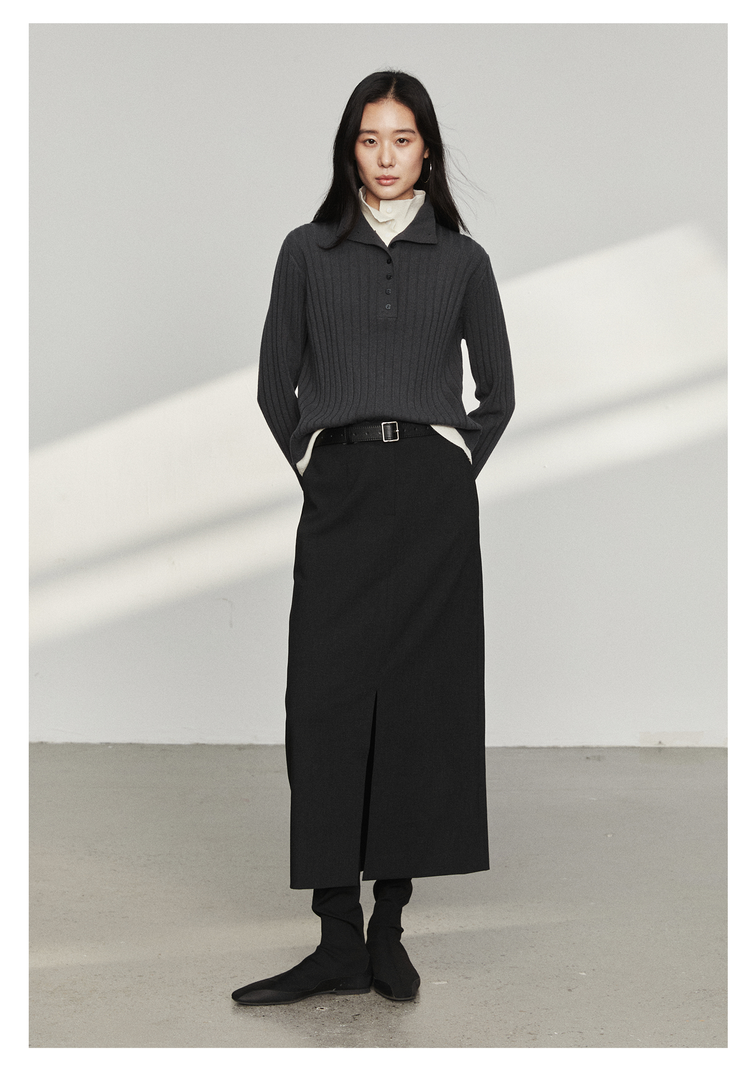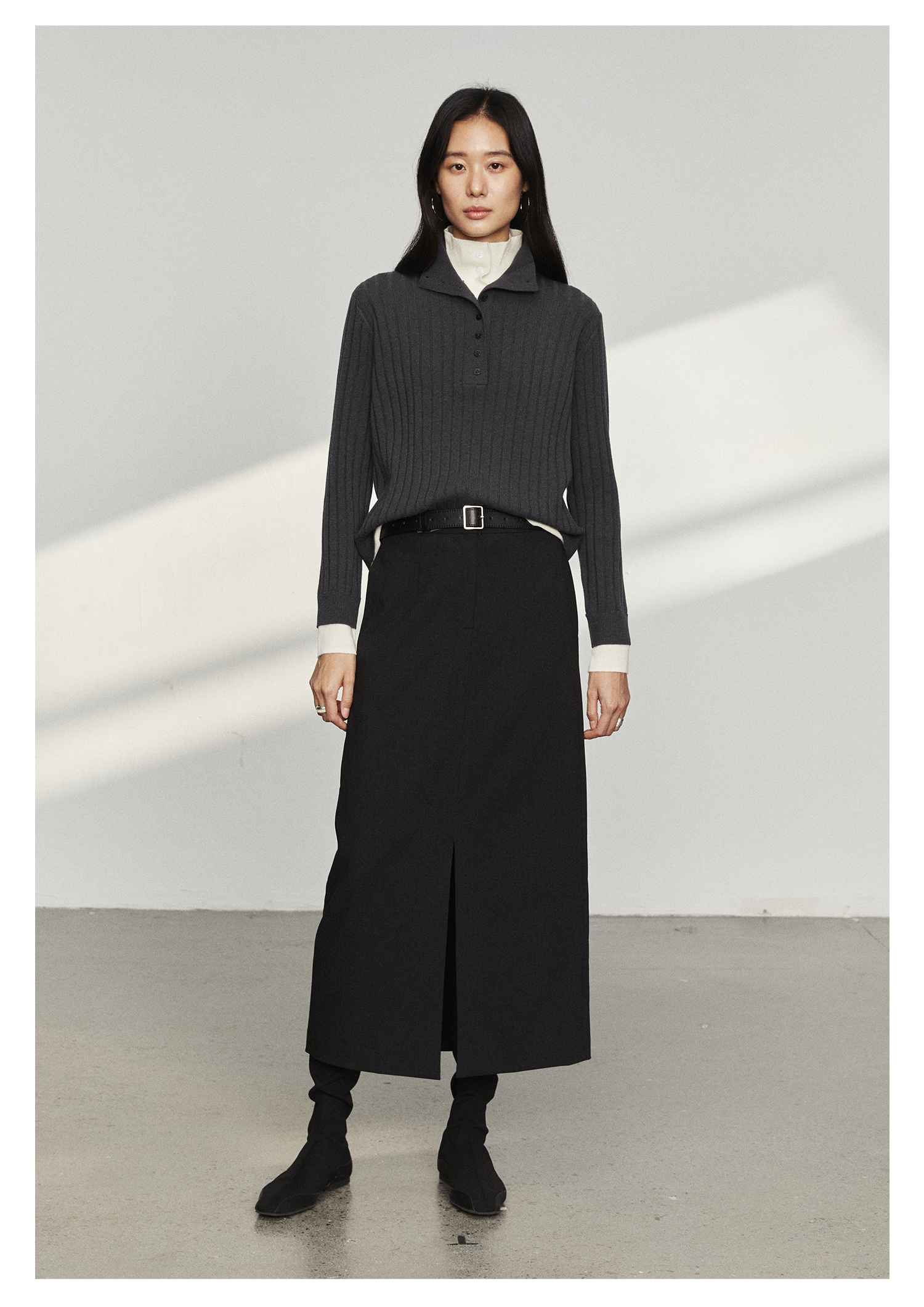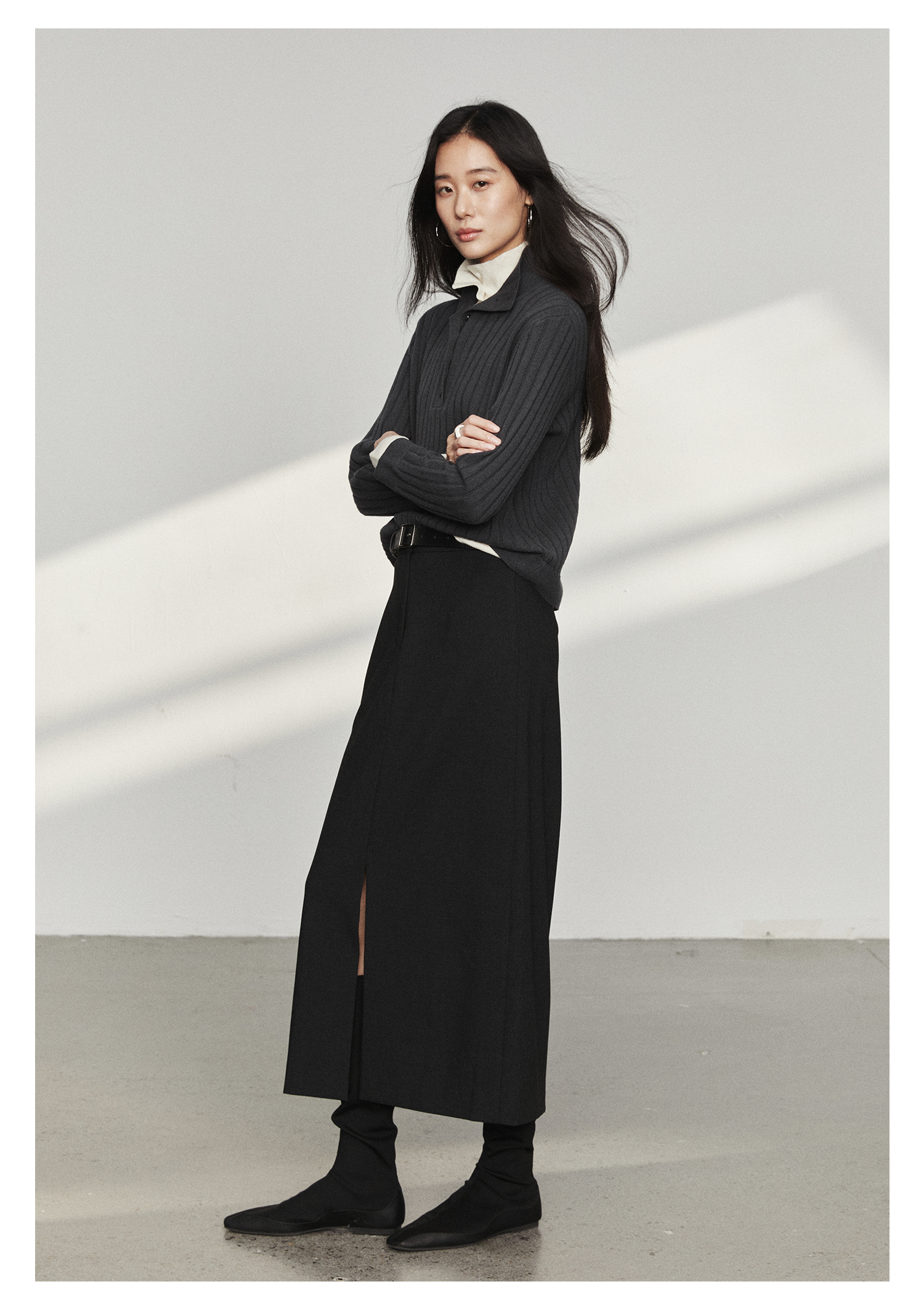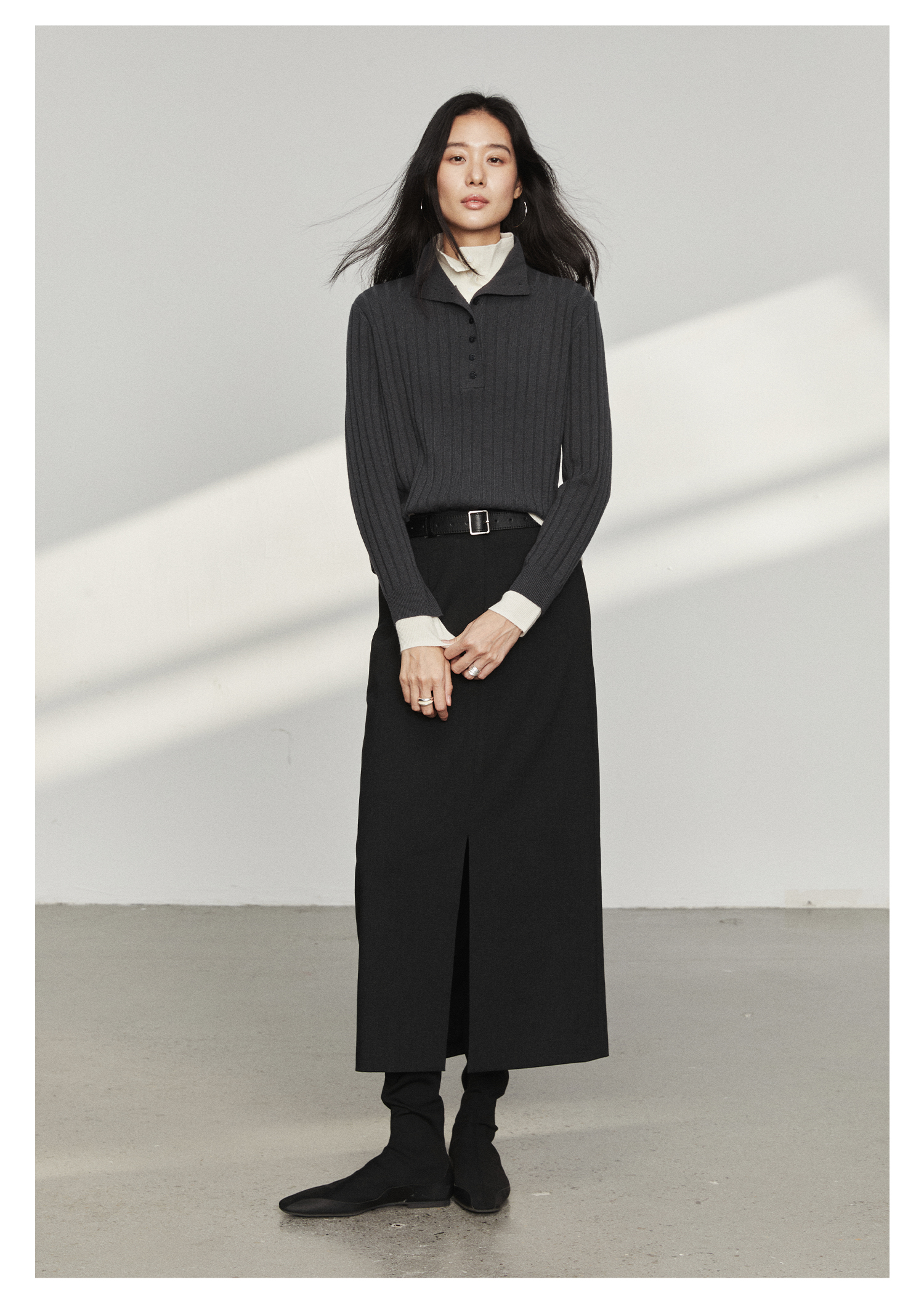 棉仓3561505007-秋季时髦粗坑条毛衣 松弛宽松叠叠乐假两件翻领羊毛衫