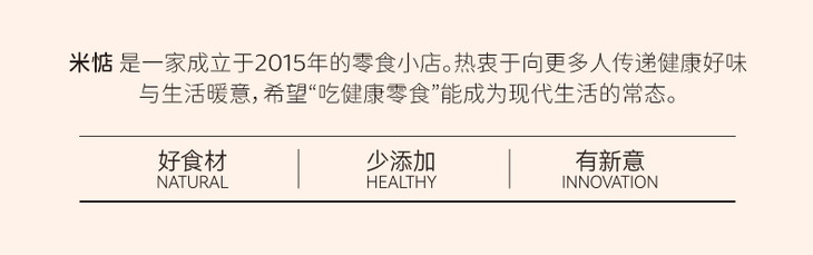 米惦,以找寻和分享健康零食而来,秉持着低添加甚至无添加的产品理念,致力于为更多人提供安心的美味,为打破“零食是不健康的”固有认知而来,在坚持健康零食上,不止步于好吃,而是研发更有趣好玩,更高品质高颜值的产品,为每个人带来好吃好玩的零食生活体验。