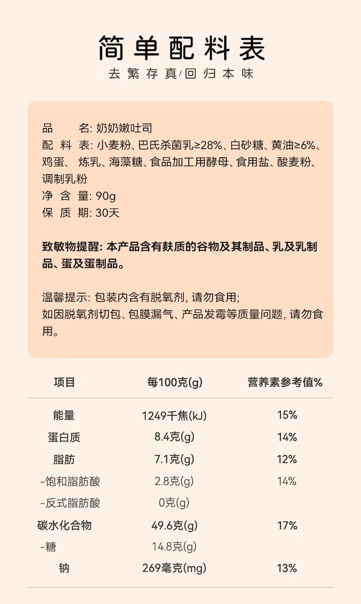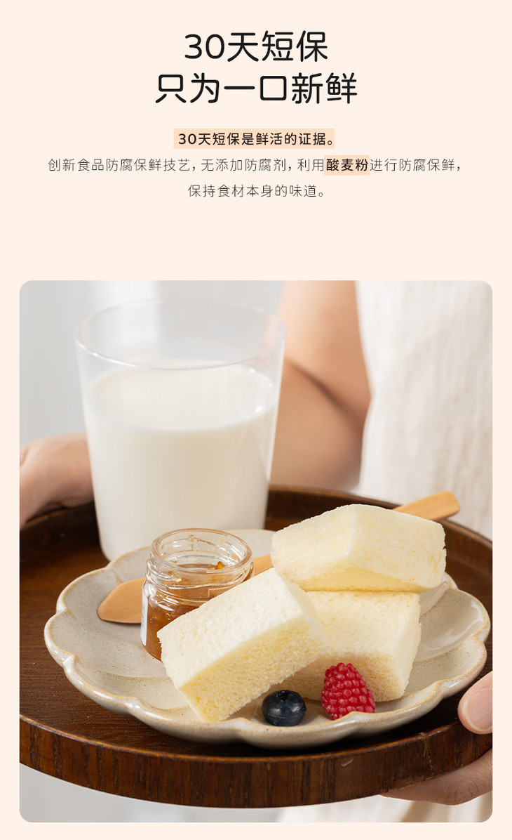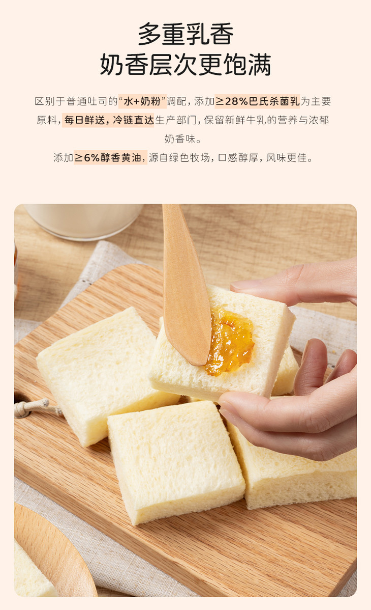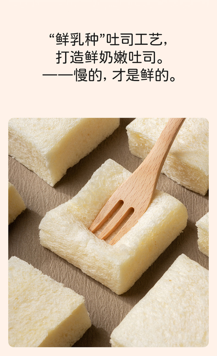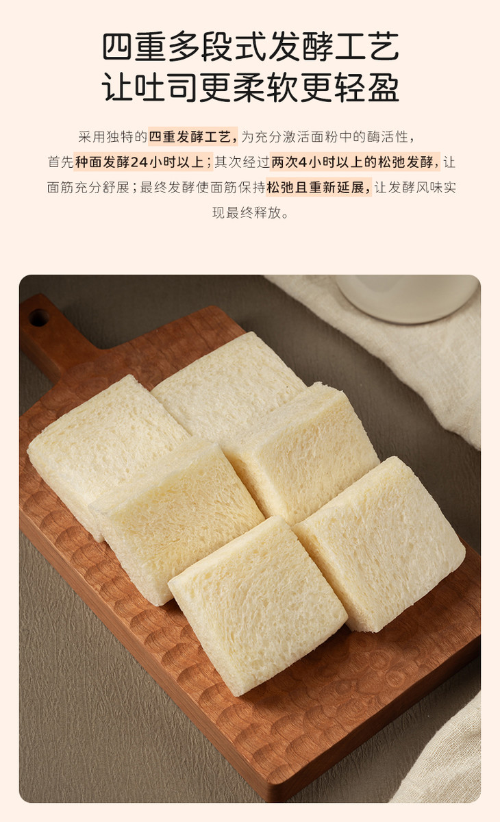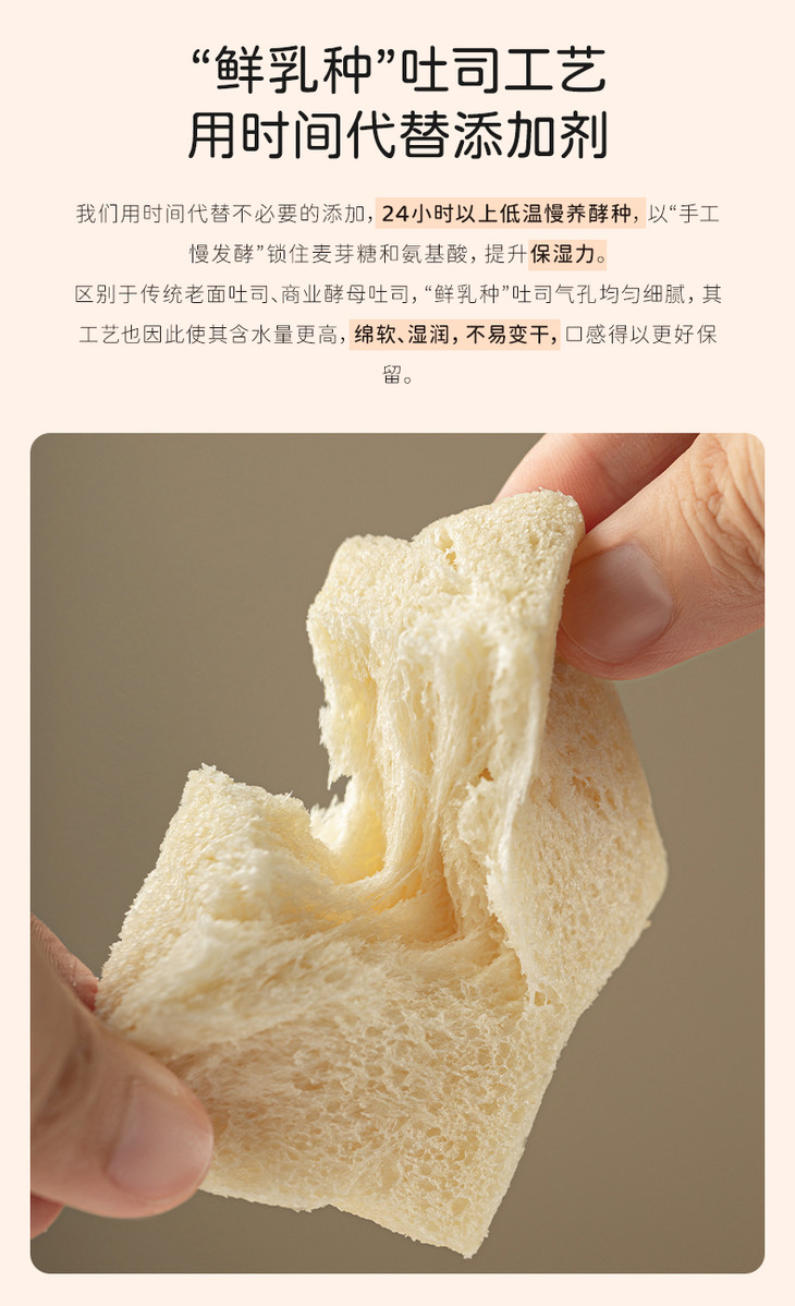 奶奶嫩吐司,原料上就满是诚意,添加不低于28%的伊利巴氏杀菌乳,每日新鲜送达,自带天然活性营养,全程只用牛乳和面,一滴水都不添加;同时融入不低于6%的新西兰安佳黄油,0反式脂肪酸的配方,让每一口都醇厚不腻,奶香直钻鼻腔。同时还采用特色鲜乳种工艺,坚持不低于24小时手工慢发酵,用充足的时间替代各类添加剂,让吐司的组织愈发细腻,口感绵密又湿润。尤为特别的是,它还采用了复杂繁琐的四重多段式发酵工艺,依次经过酵种、中种、主面团、最终四轮发酵,相当于把面团叫醒四次,让吐司不易变干变硬,始终保持着软香好口感。