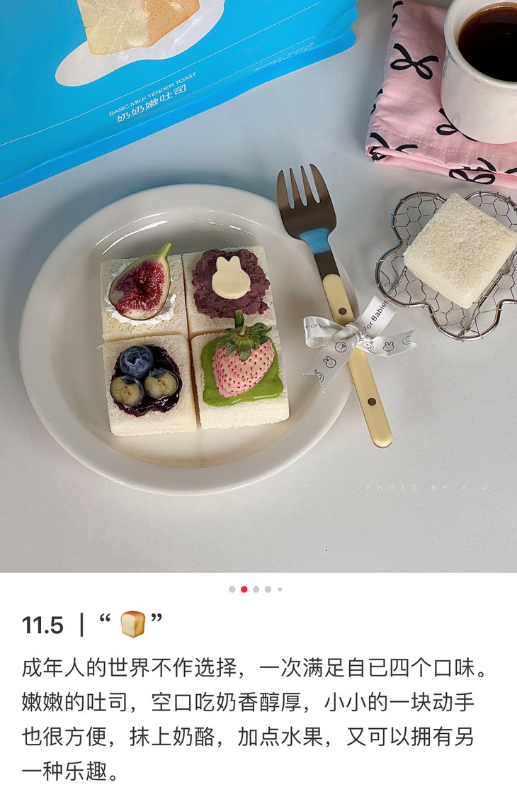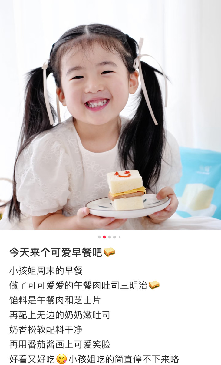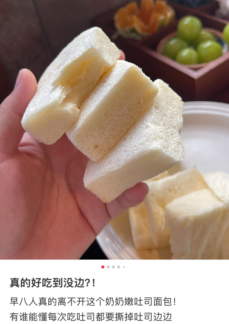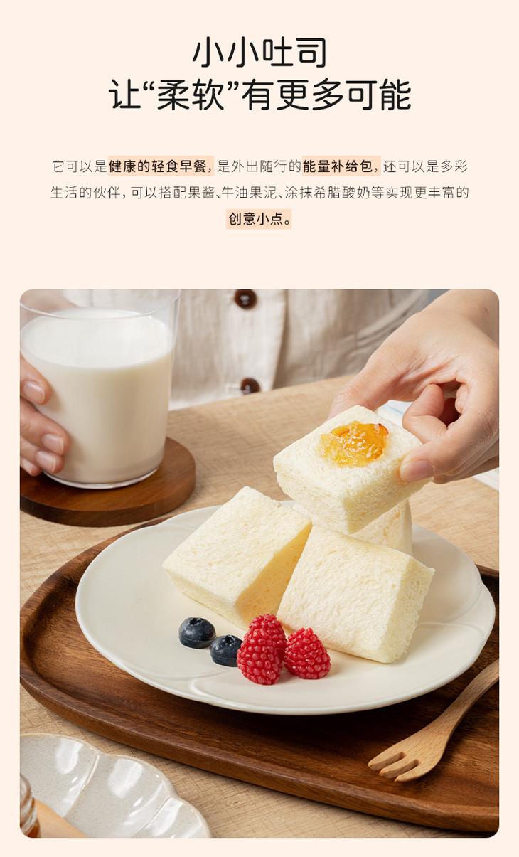 奶奶嫩吐司还是独立小包装,一袋约20个,随手揣进包里,随时随地都能解锁小美味。每一片吐司都松软得像云朵一般,从边角到中心都润泽柔软,入口即润完全不干噎,奶香浓郁,吃法也超灵活!直接吃是纯粹的软香享受,搭配水果、牛奶、酸奶,又能解锁N种花样,每天换着夹各种!我自己肯定是最爱花生酱+香蕉啦,其貌不扬,但真的,巨好吃!
