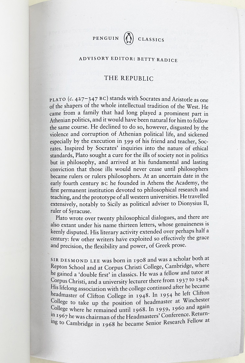 Desmond Lee's translation of The Republic has come to be regarded as a classic in its own right. His introduction discusses contextual themes such as Plato's disillusionment with Athenian politics and the trial of Socrates. The new introduction by Melissa Lane discusses Plato's aims in writing The Republic, its major arguments and its perspective on politics in ancient Greece, and its significance through the ages and today.