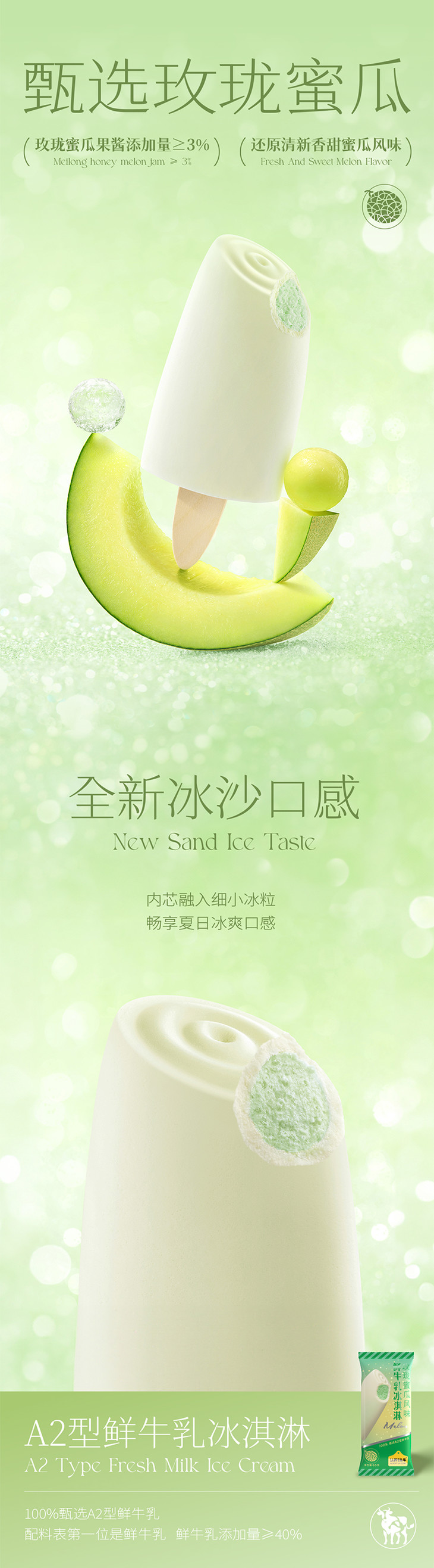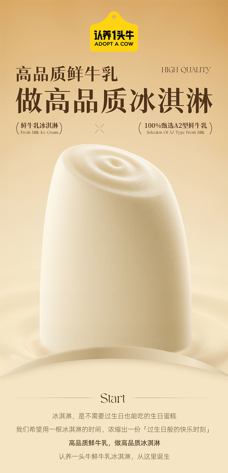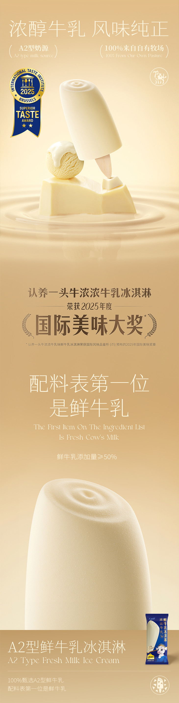 雪糕用的都是A2β-酪蛋白鲜牛乳,100%来自自有牧场奶源。在那片广袤的绿色草场上,奶牛们悠然漫步,吃着鲜嫩的青草,呼吸着清新的空气,产出的牛奶自然也更加优质纯净。A2β-酪蛋白是一种更亲和人体的蛋白质,相较于普通牛奶蛋白,易于消化,不会给肠胃带来负担,让大家在享受美食的同时,也能兼顾健康。雪糕的制作工艺精湛,长得好看,细腻绵滑,还不添加任何多余的香精和人工添加剂。