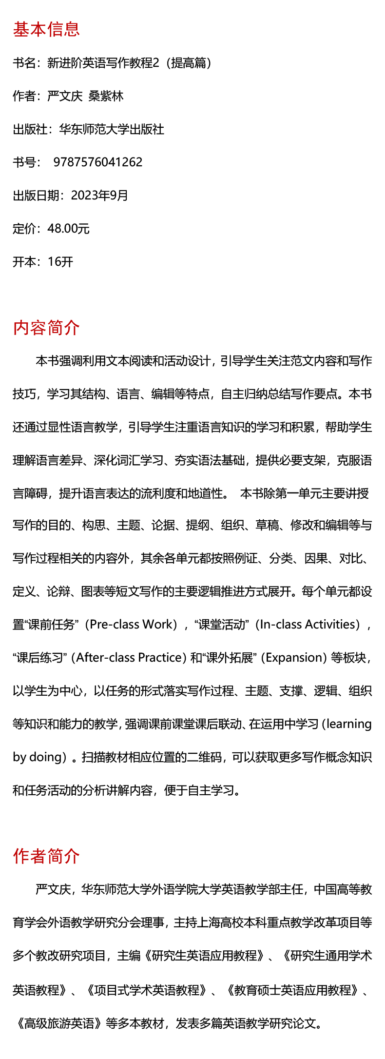 新进阶英语写作教程2 提高篇 新进阶英语写作系列教材 大学英语教材