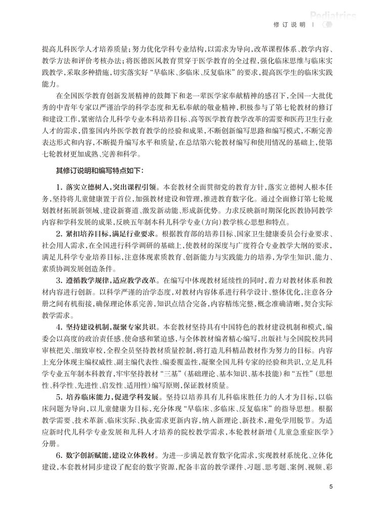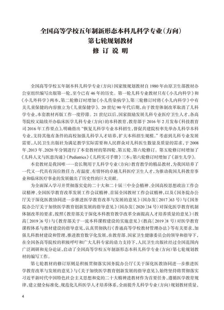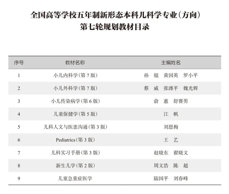 1.全国高等学校五年制本科儿科学专业(方向)国家*规划教材自1980年由原卫生部教材办公室组织编写出版第一轮,至今已有46年的历史。本套教材是我国唯一一套长期用于儿科学专业(方向)教育教学的精品教材,为我国培养了一代又一代具有岗位胜任力、有温度、有情怀的卓越儿科医疗卫生人才,为推动我国儿科教育事业和临床医疗事业的发展做出了历史性的巨大贡献。
