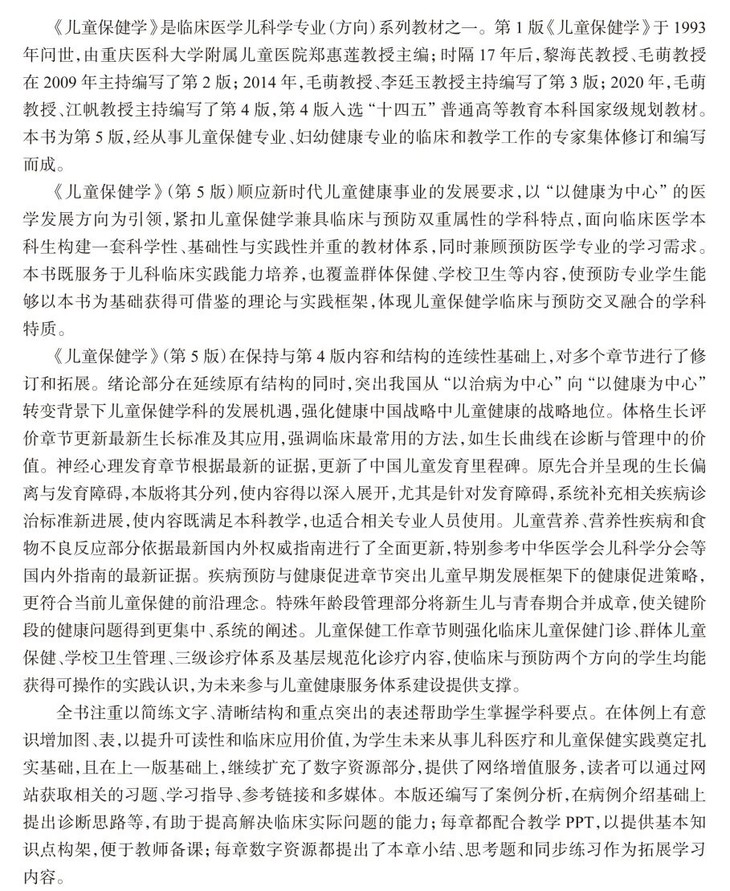 2.顺应新时代儿童健康事业的发展要求,以“以健康为中心”的医学发展方向为引领,紧扣儿童保健学兼具临床与预防双重属性的学科特点,内容方面紧扣本科教学的教学要求,精减扼要,注重"三基",科学性、基础性与实践性并重。