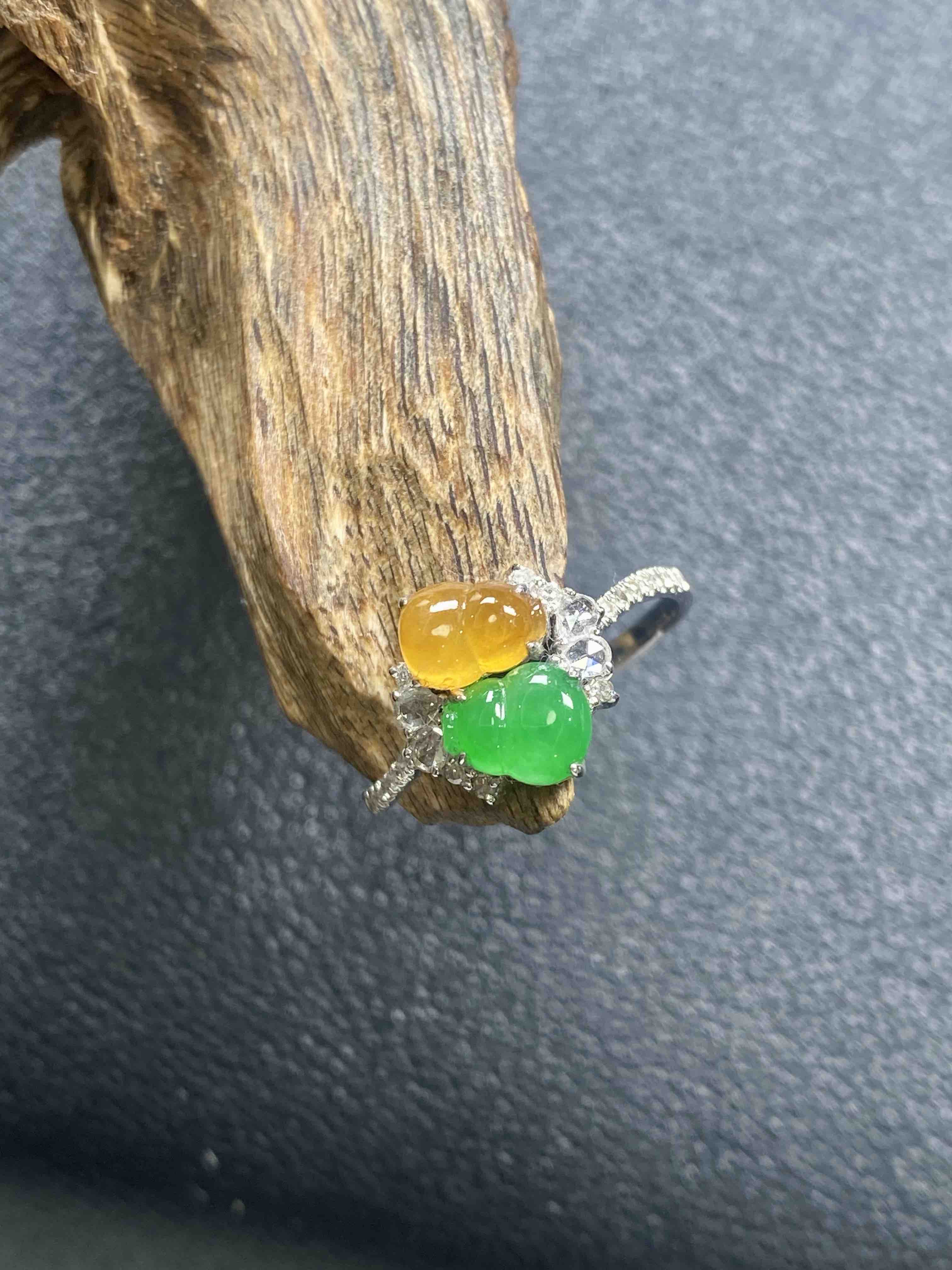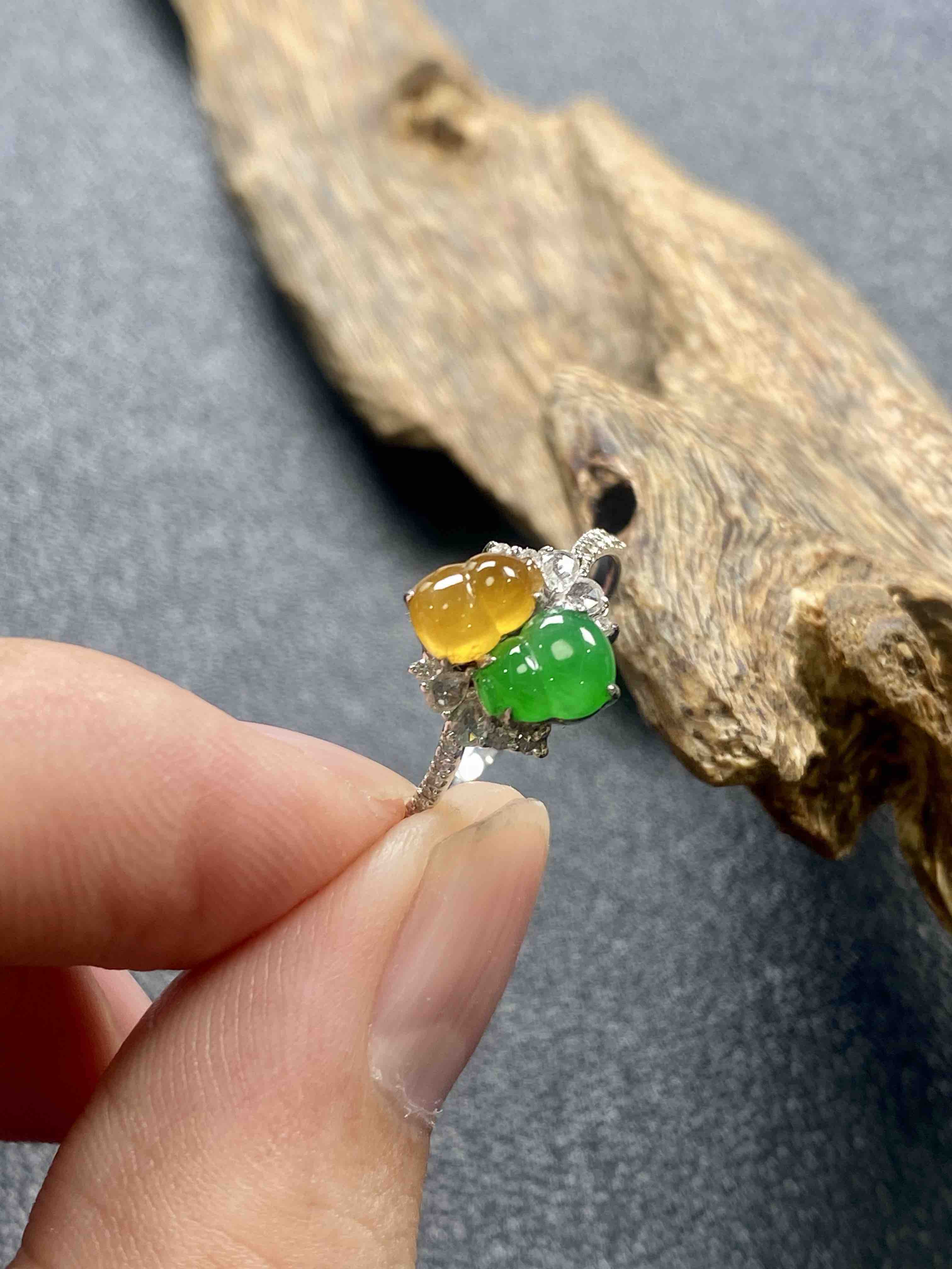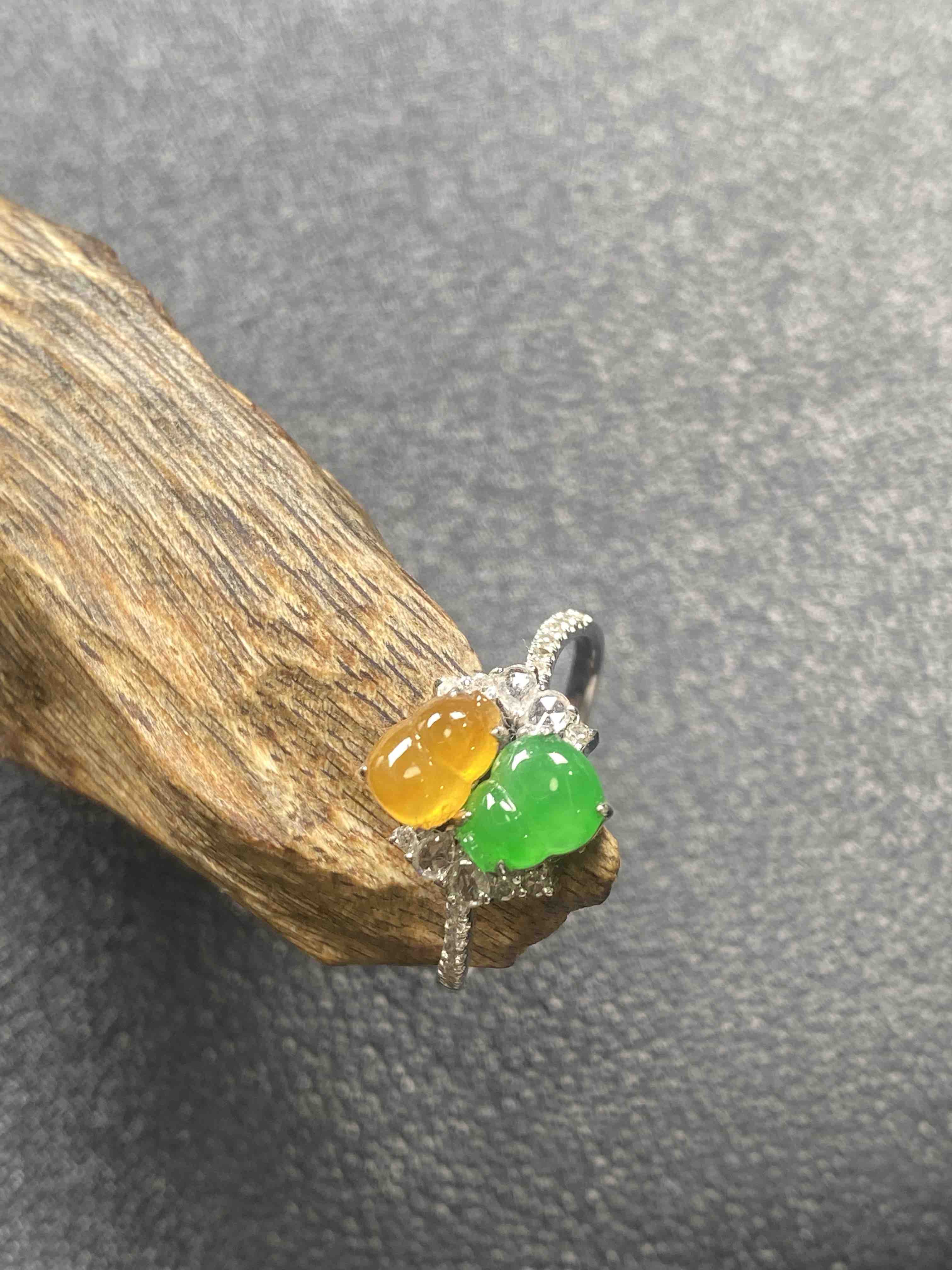 【FC0139】18K镶嵌翡翠阳绿+冰黄葫芦戒指 色泽娇艳 水润起光 款式精美 圈口14