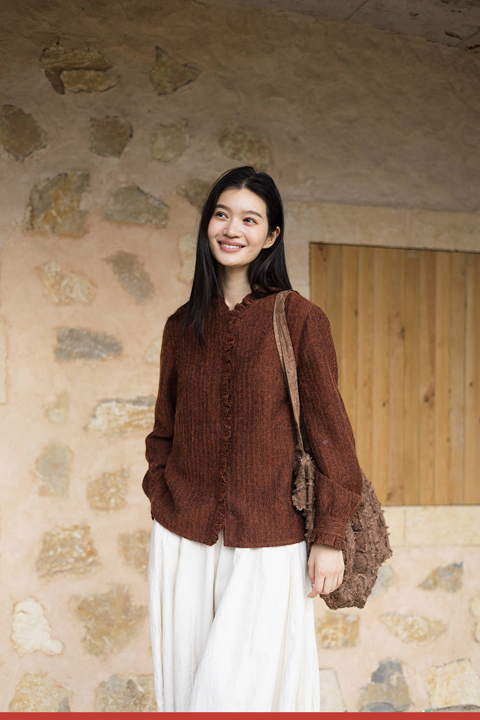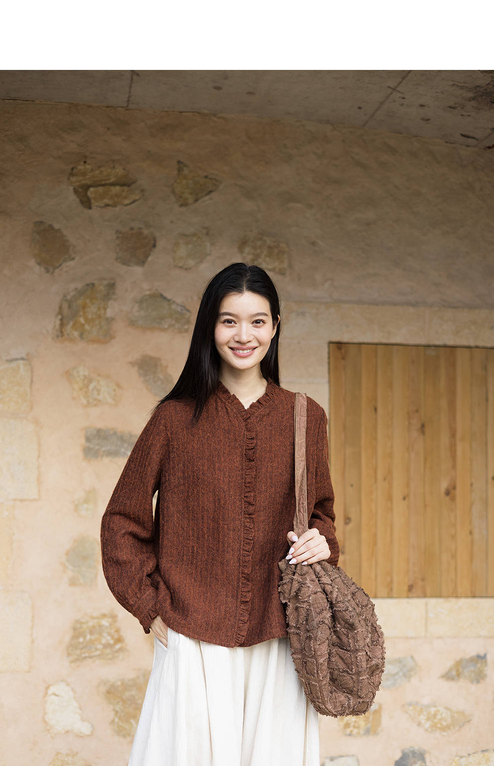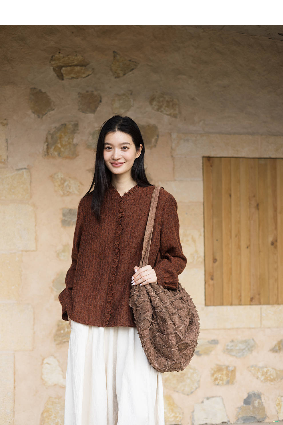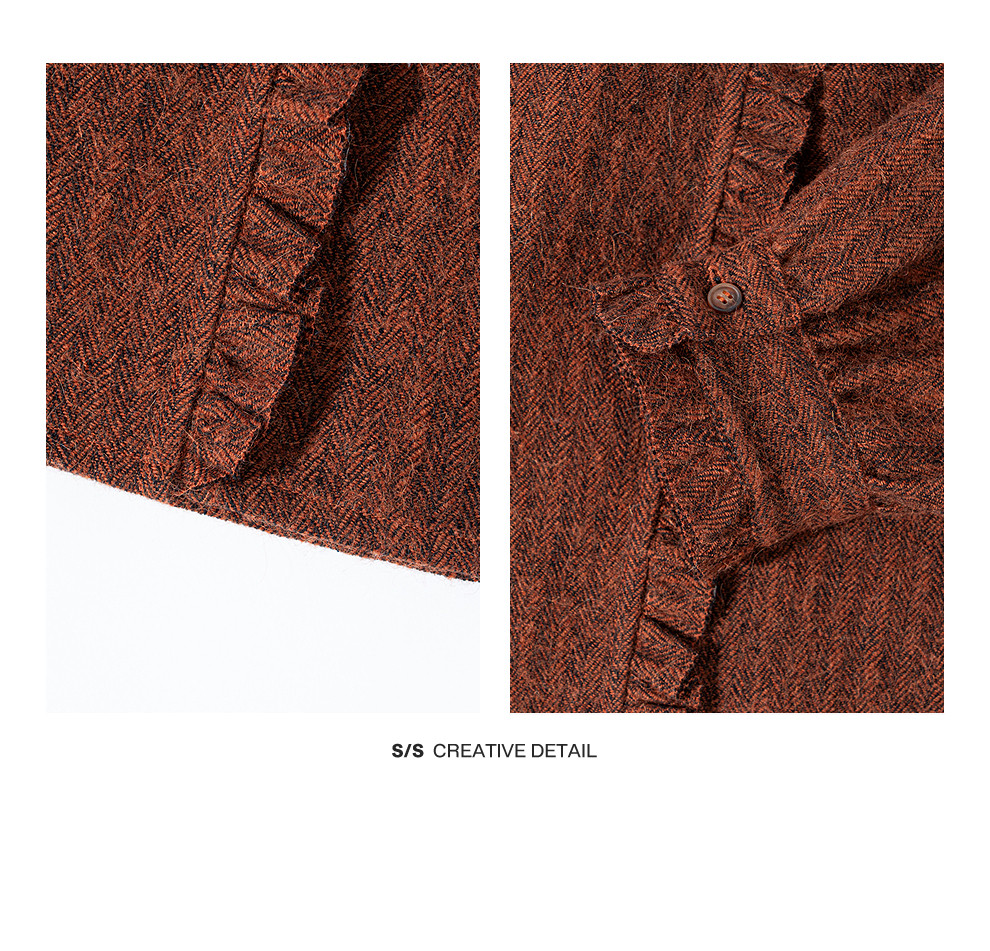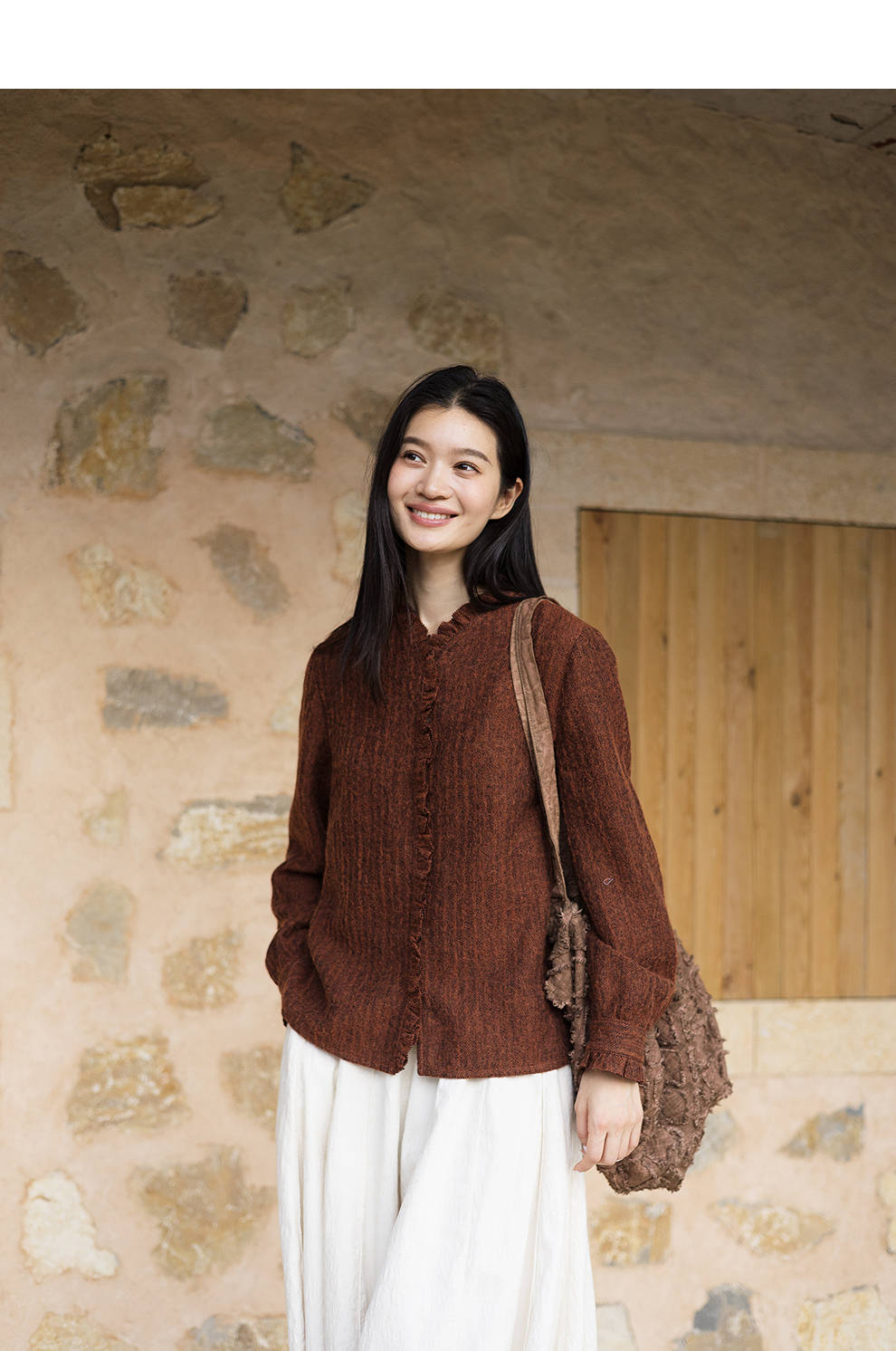 绽放734朵/砖红荷叶衫·羊驼羊毛亚麻棉人字纹肌理荷叶边长袖衬衫