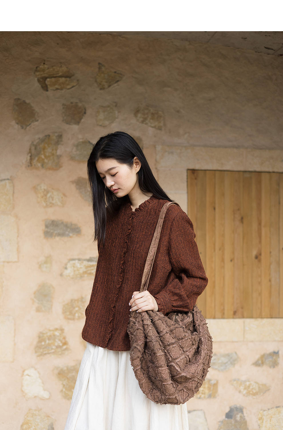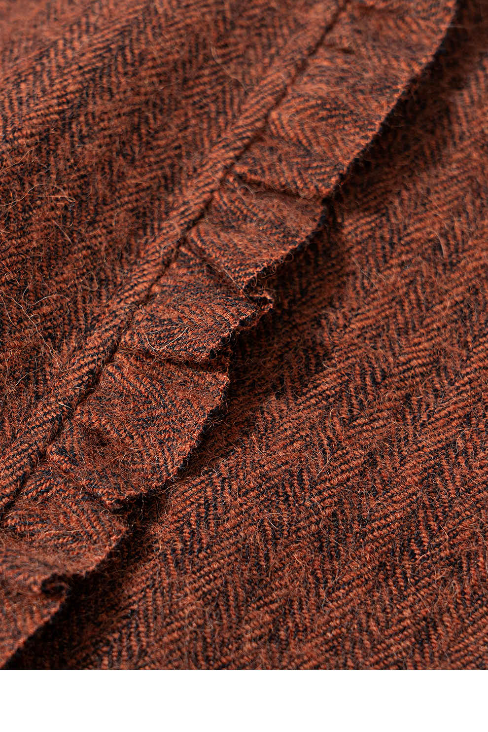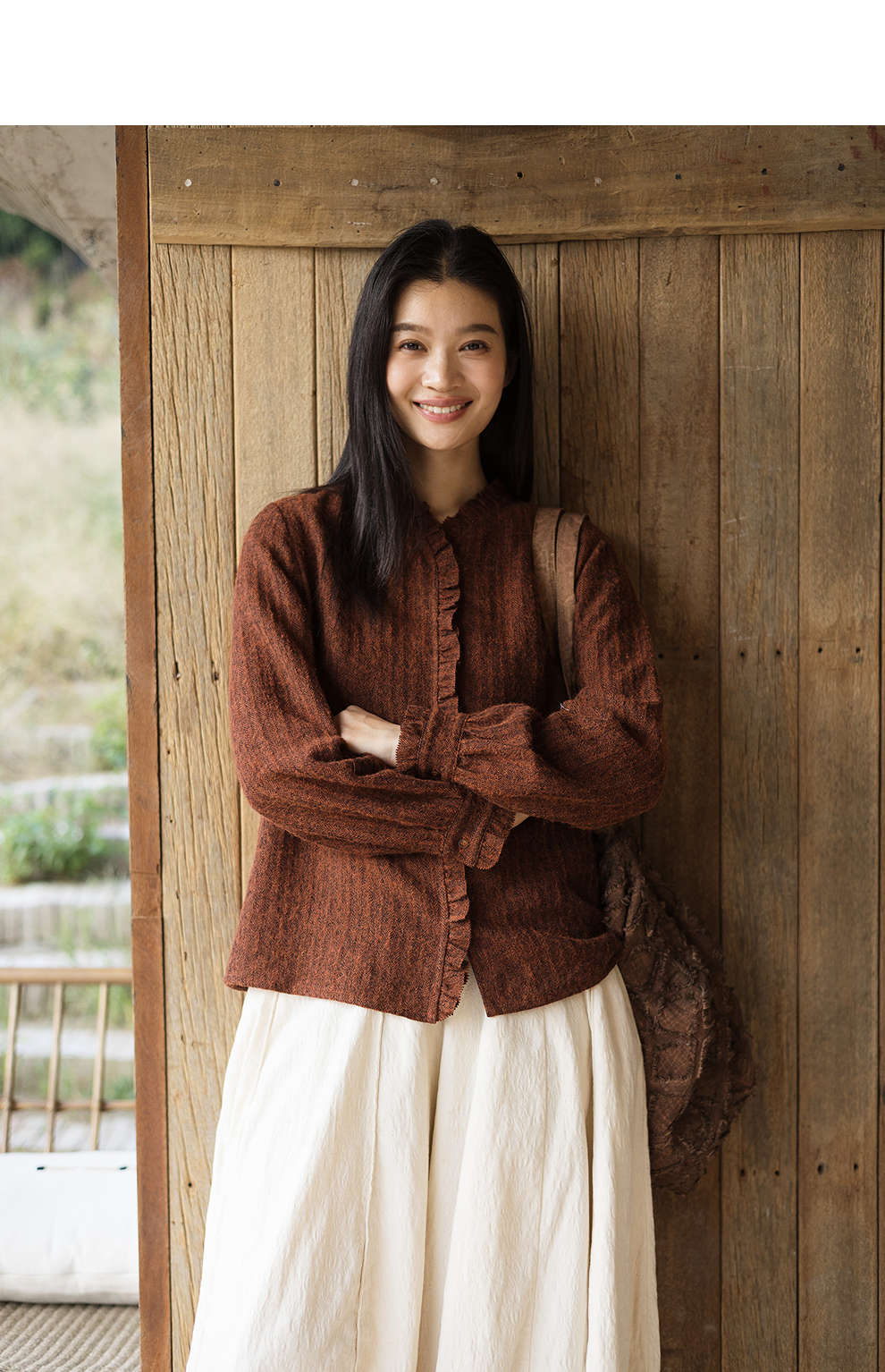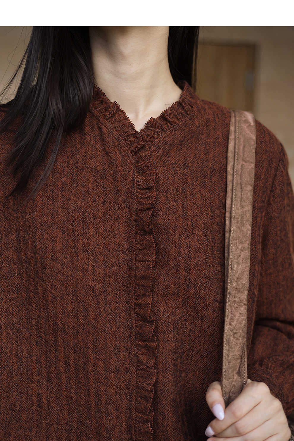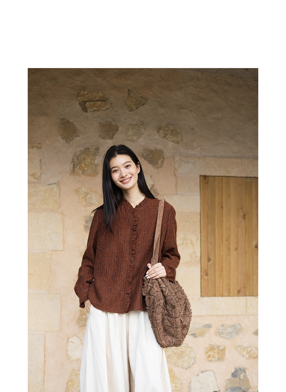 绽放734朵/砖红荷叶衫·羊驼羊毛亚麻棉人字纹肌理荷叶边长袖衬衫