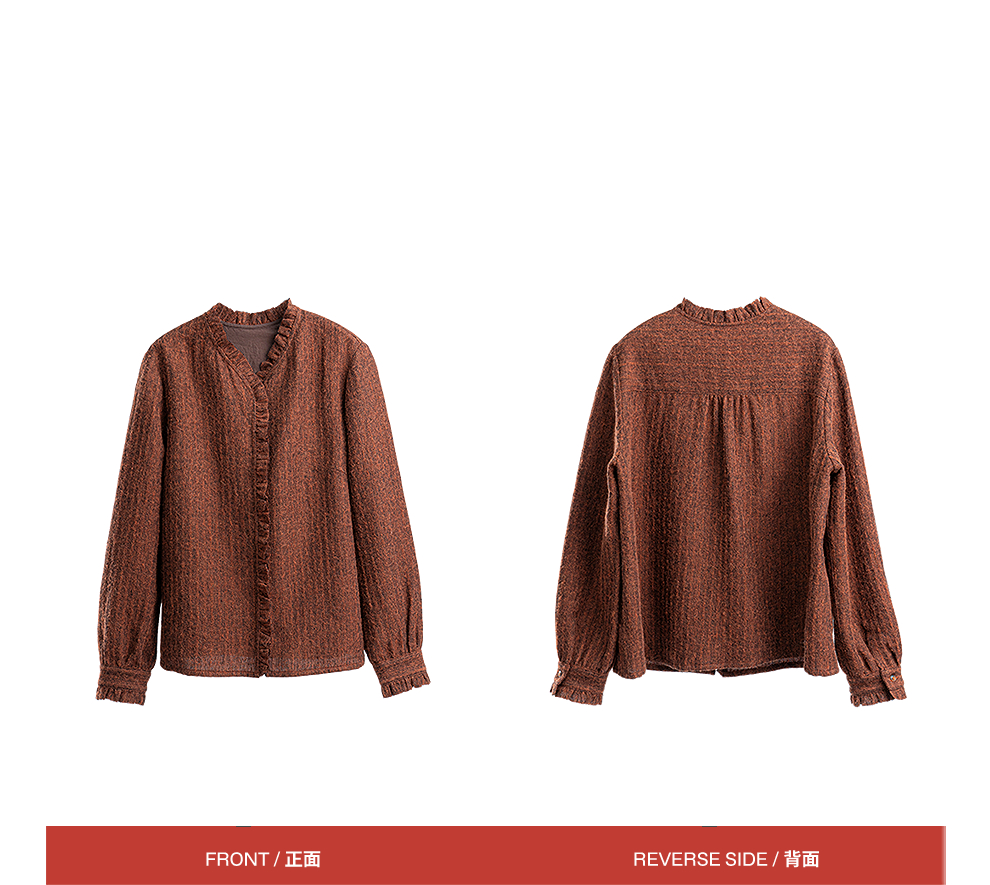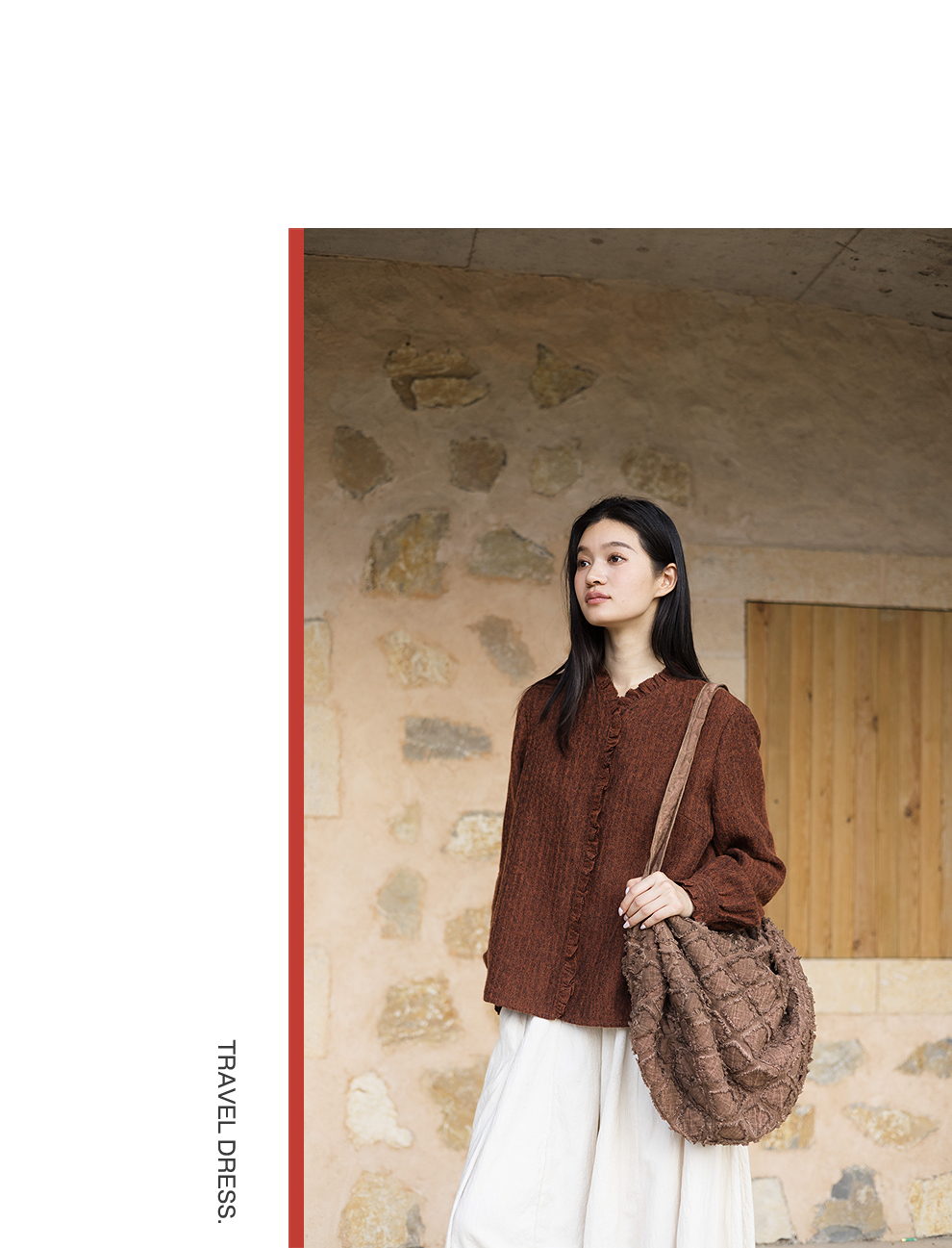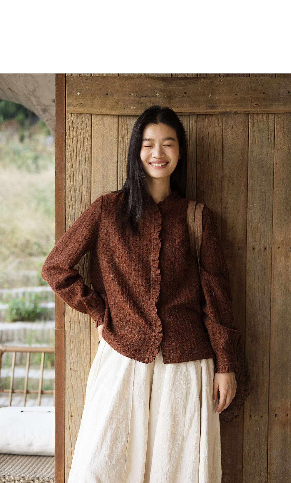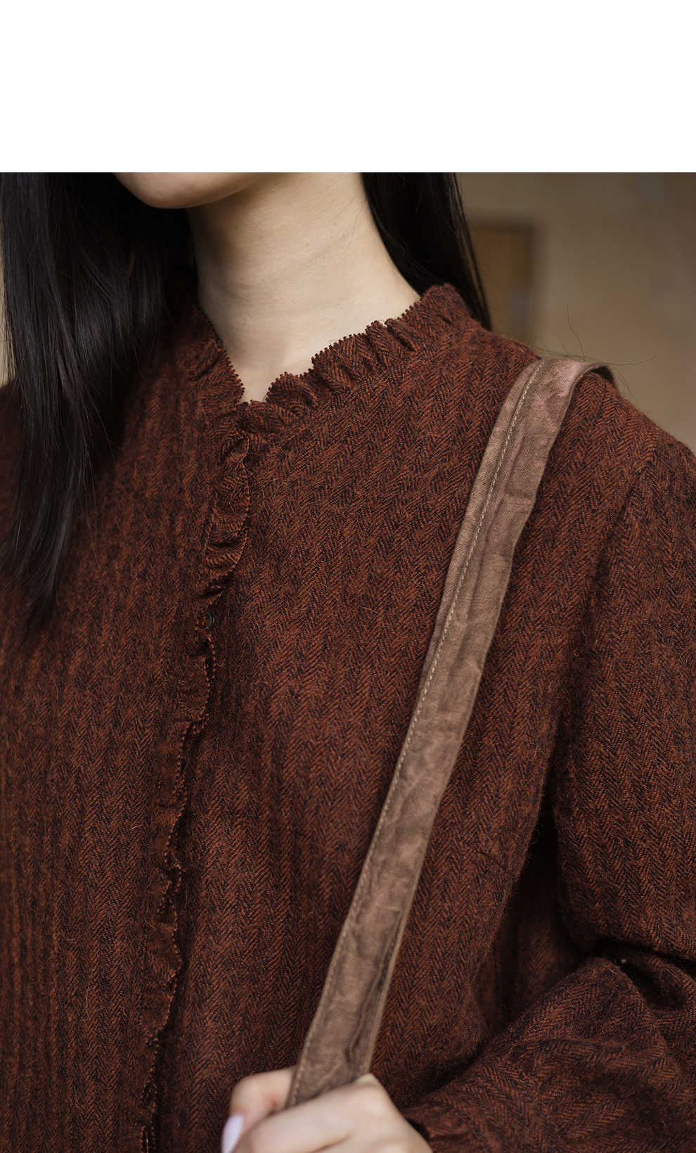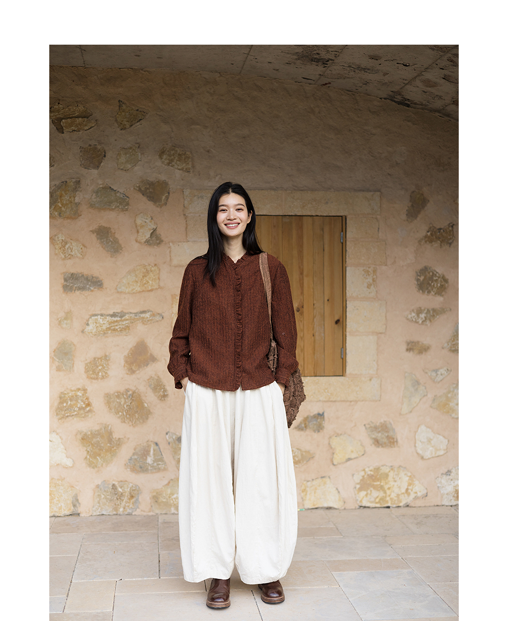 绽放734朵/砖红荷叶衫·羊驼羊毛亚麻棉人字纹肌理荷叶边长袖衬衫