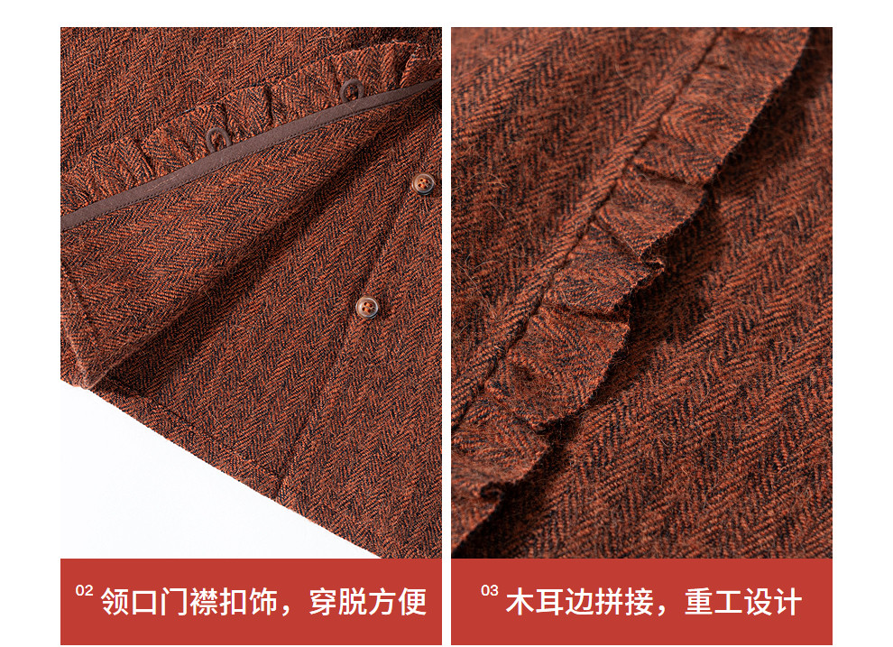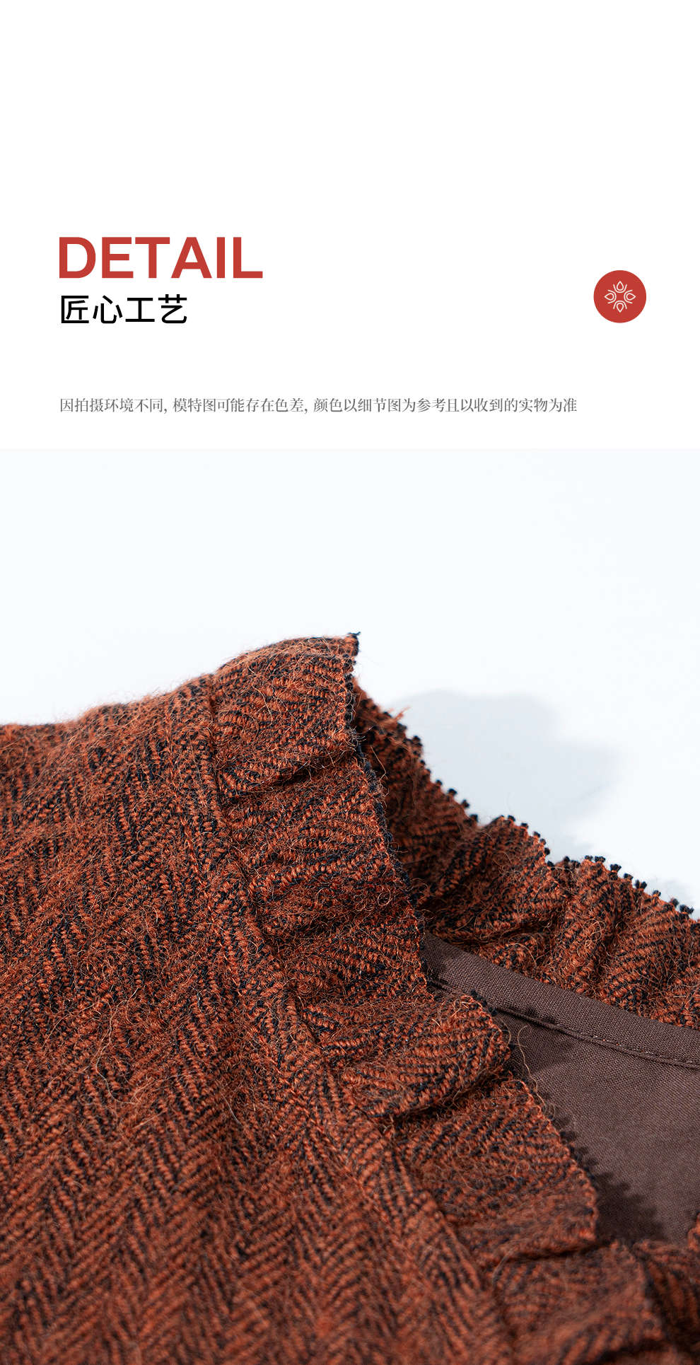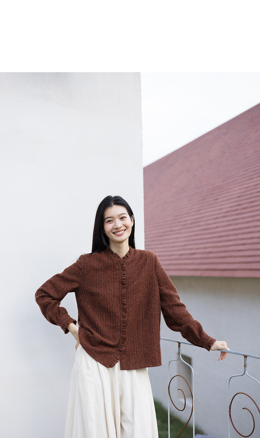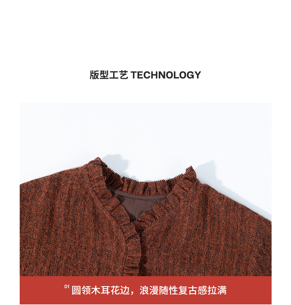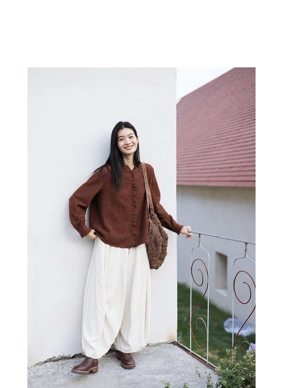 绽放734朵/砖红荷叶衫·羊驼羊毛亚麻棉人字纹肌理荷叶边长袖衬衫