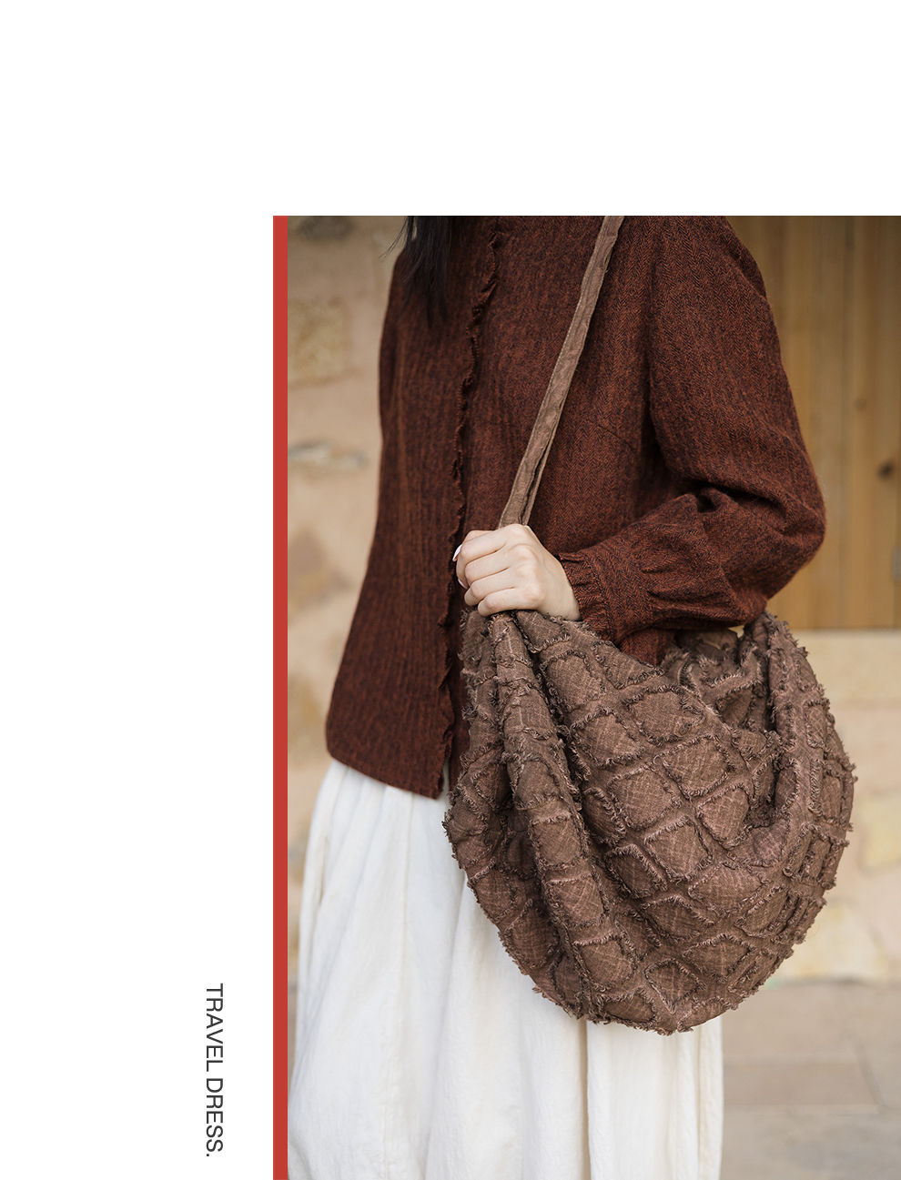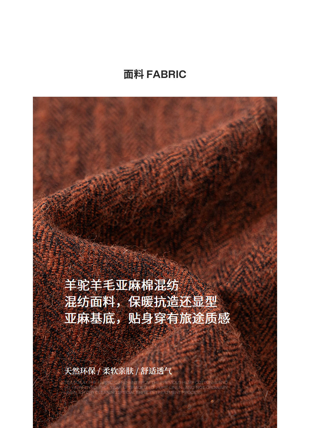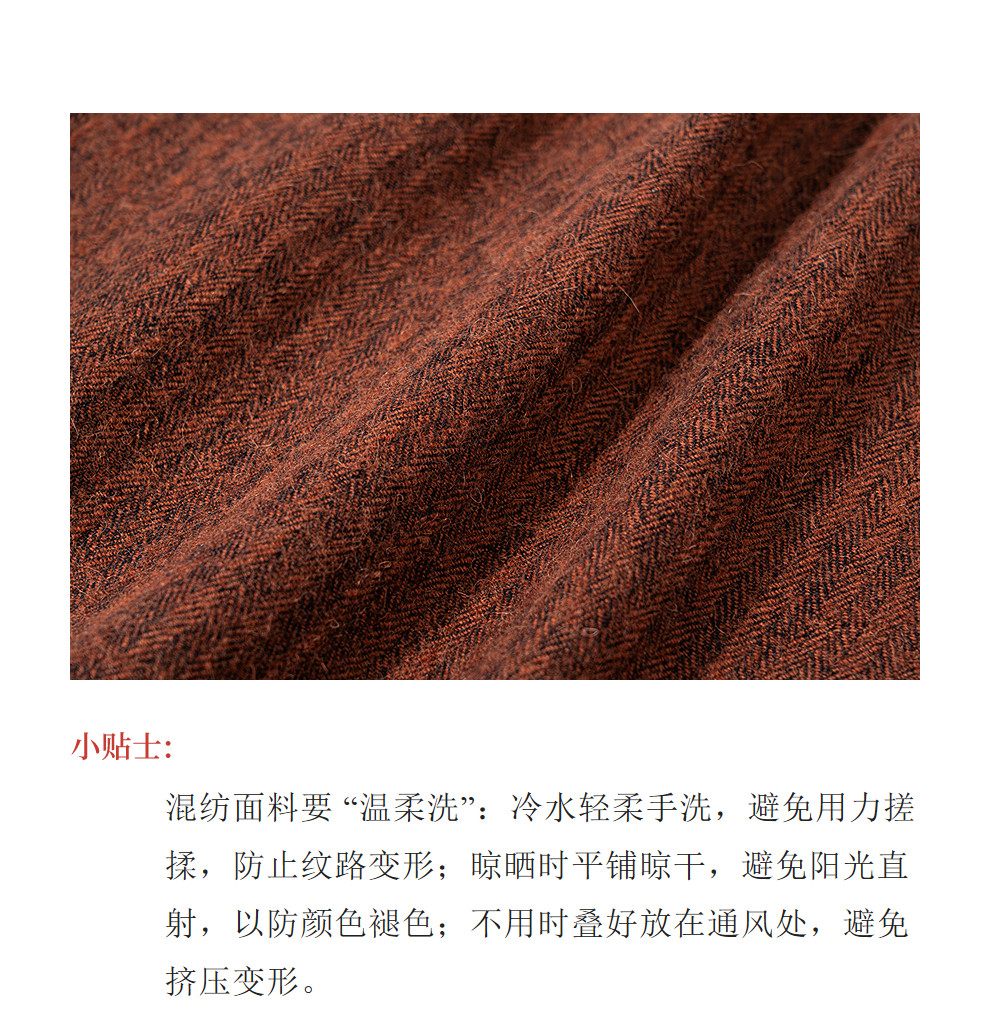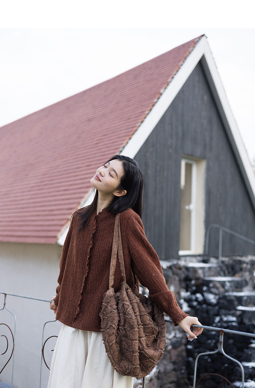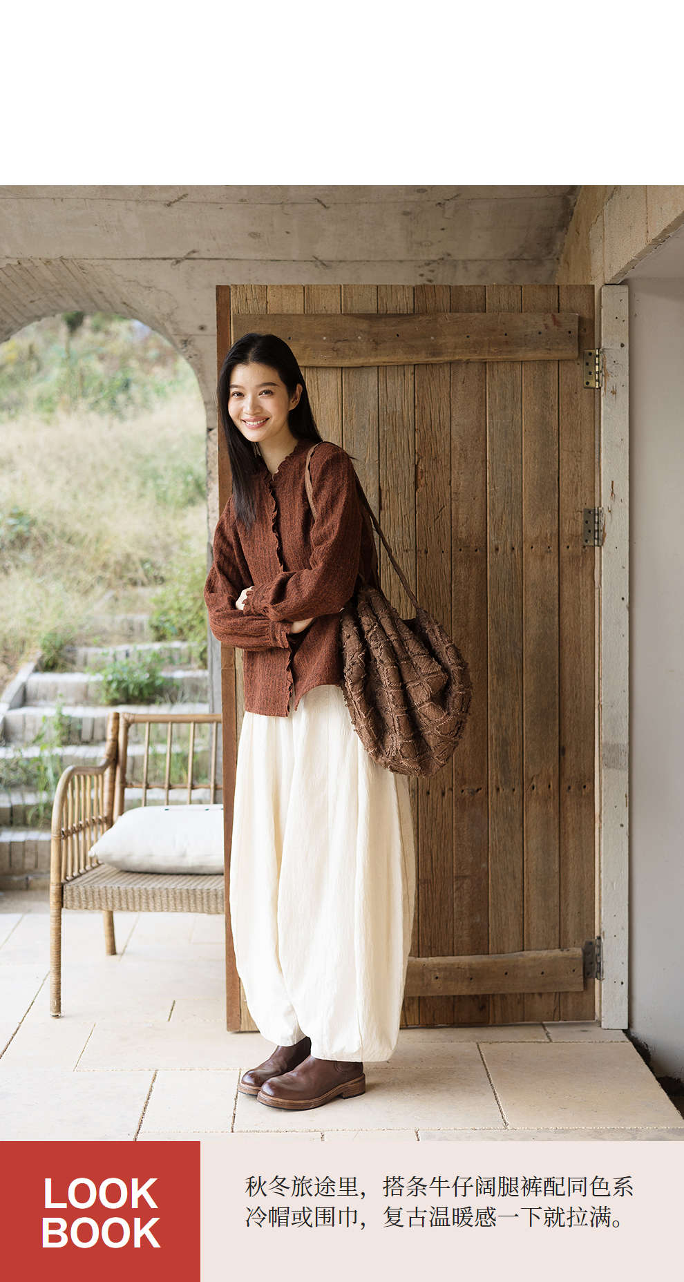 绽放734朵/砖红荷叶衫·羊驼羊毛亚麻棉人字纹肌理荷叶边长袖衬衫