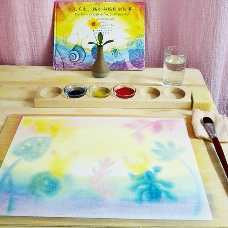 《毛毛虫、蜗牛、蚂蚁的故事》绘本一本、三格木格+水彩瓶3个、进口水彩笔20mm、湿水彩三色套装