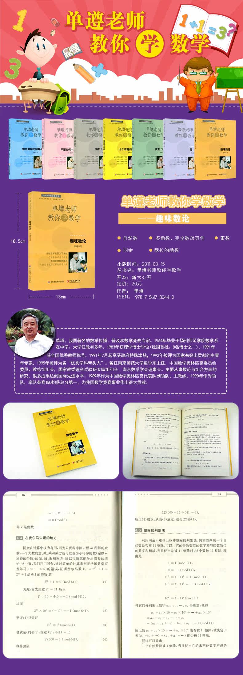 自然数产生于史前时代,人们对它的研究源远流长,古往今来,数学家们提出和解决了数不清的有关自然数性质的问题,在数学中,形成了一个结构严谨、内容丰富多采的分支——数论不少问题的解决,思想的深刻和方法的巧妙,足以使世世代代的数学爱好者赞赏不已,数论中许多问题叙述简明而难度极大,是富有魅力的,以华罗庚教授为代表的中国数学家在数论研究中令人瞩目的工作,也引起人们对数论更大的兴趣,我们经常与自然数打交道,对自然数的一些简单性质应该有所了解,一个中学生,如果不知道什么是欧儿里得算法是二件遗憾的事,青少年朋友们,无论你将来想做什么,学一点数论的基本知识和方法是会有用的,因此,写一本数论普及读物,让更多的人了解数论的基本内容,是很有必要的。