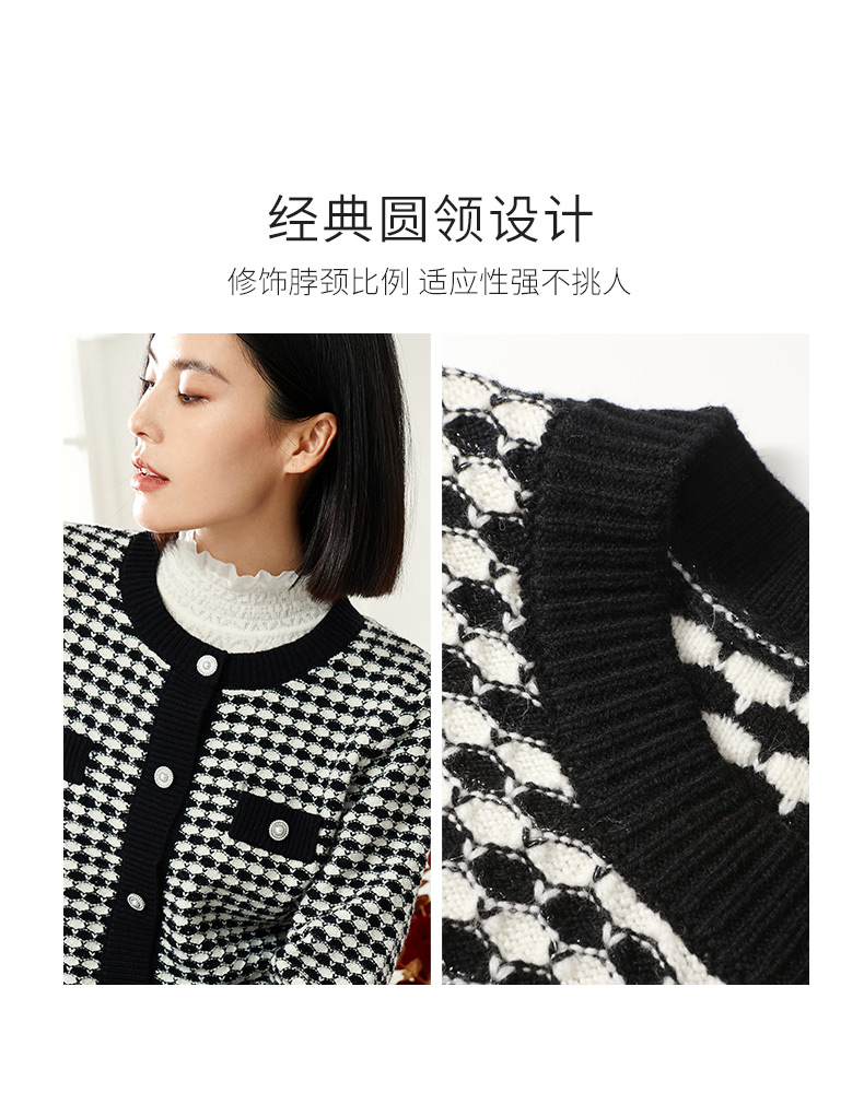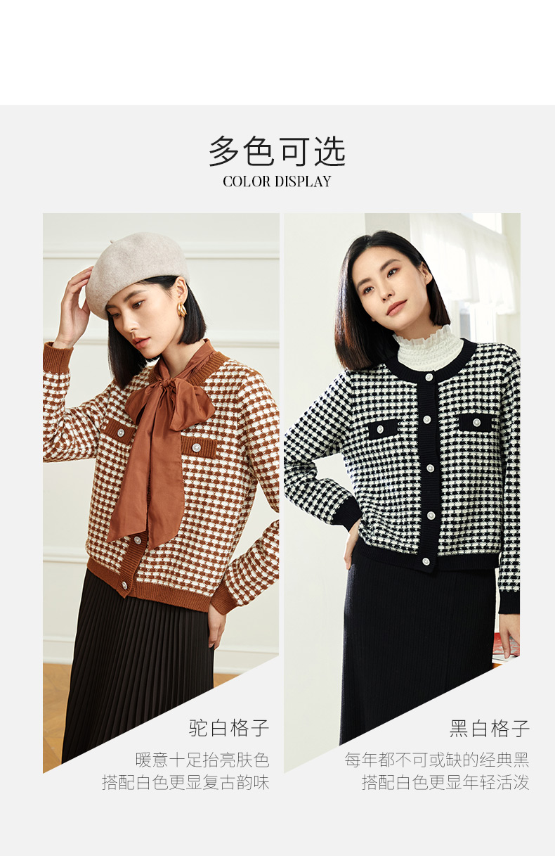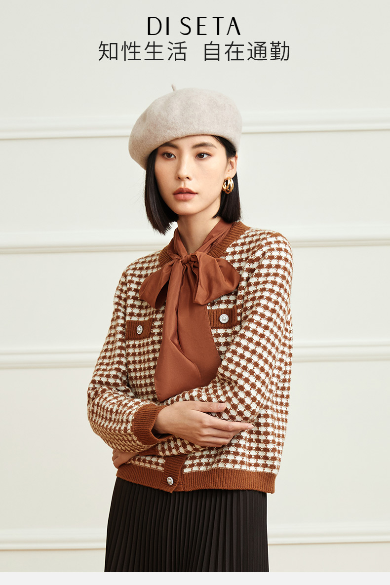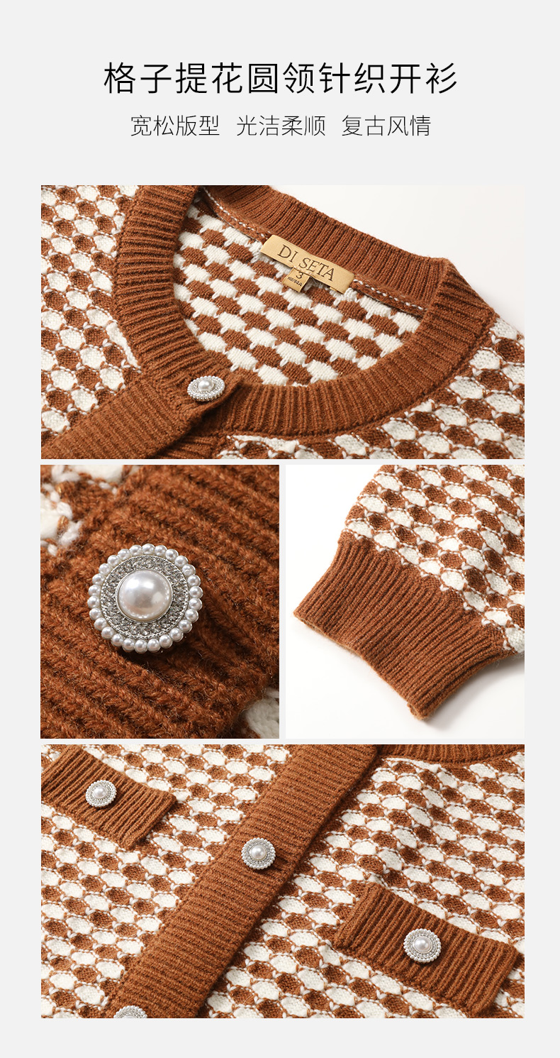 玳莎女装格子提花针织开衫秋冬新款小香风复古圆领毛衣外套 DD33315