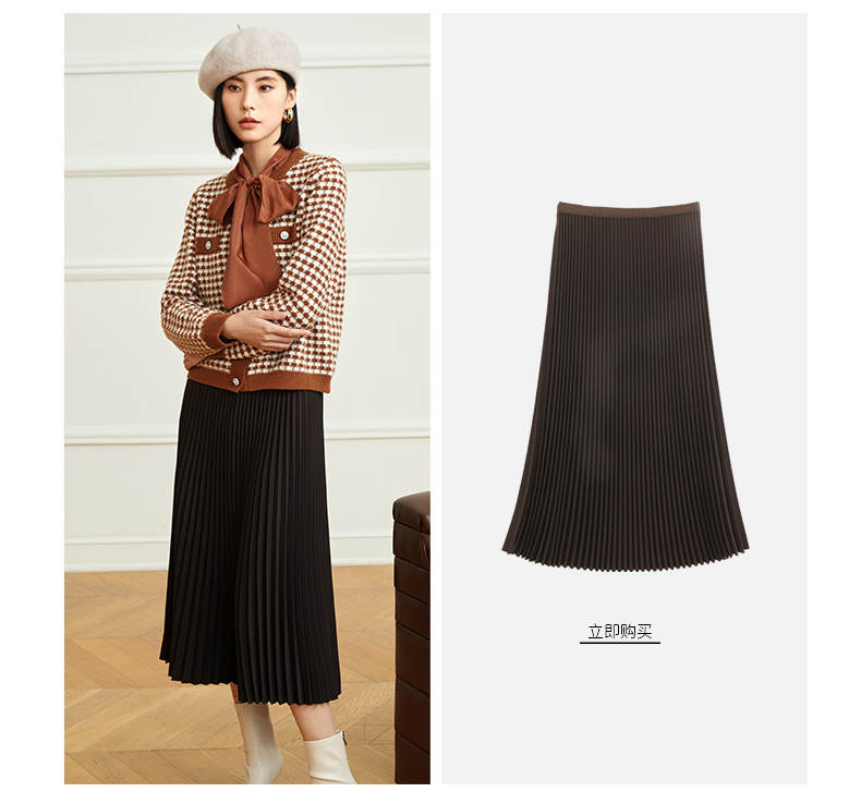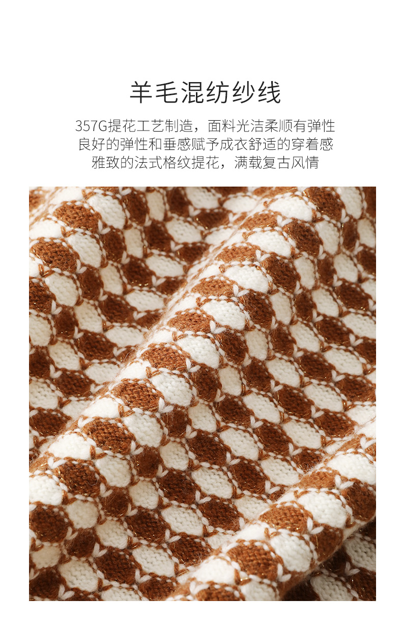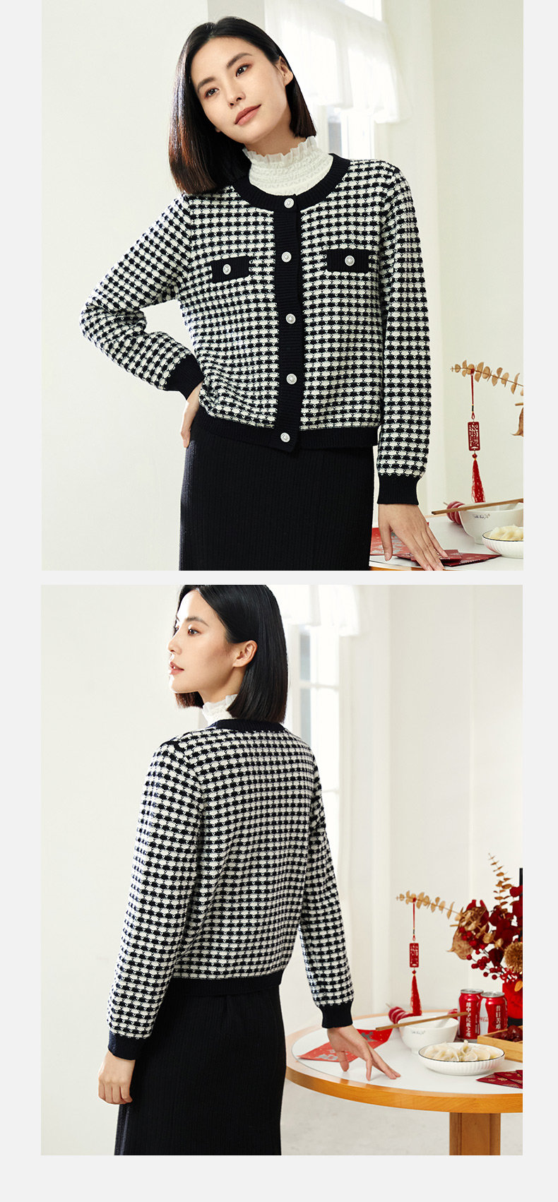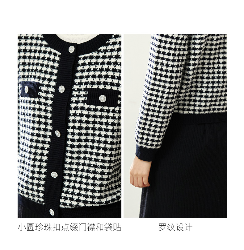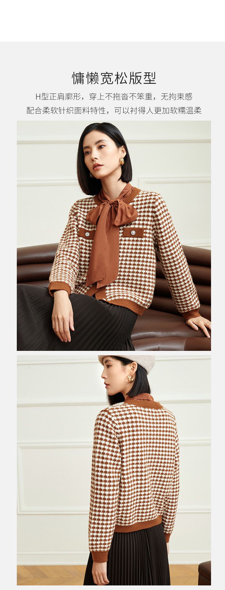 玳莎女装格子提花针织开衫秋冬新款小香风复古圆领毛衣外套 DD33315