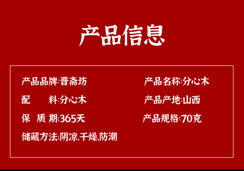 【品名】【超值3罐装】晋斋坊分心木 山西特产 选自20年树龄 手工剥取 汤色醇正 70g*3罐 【规格】70g*3罐 【产地】国内 【发货包装】独立包装 【发货地】山西 【发货快递】中通、邮政随机发 【不发货区域】新疆、西藏、青海、海南、港澳台 【发货时效】48-72小时,周末节假日顺延 |