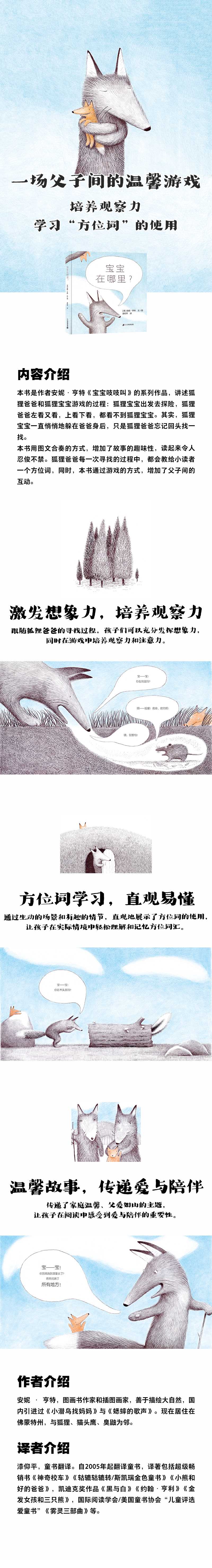 本书用图文合奏的方式,增加了故事的趣味性,读起来令人忍俊不禁。狐狸爸爸每一次寻找的过程中,都会教给小读者一个方位词,同时,本书通过游戏的方式,增加了父子间的互动。