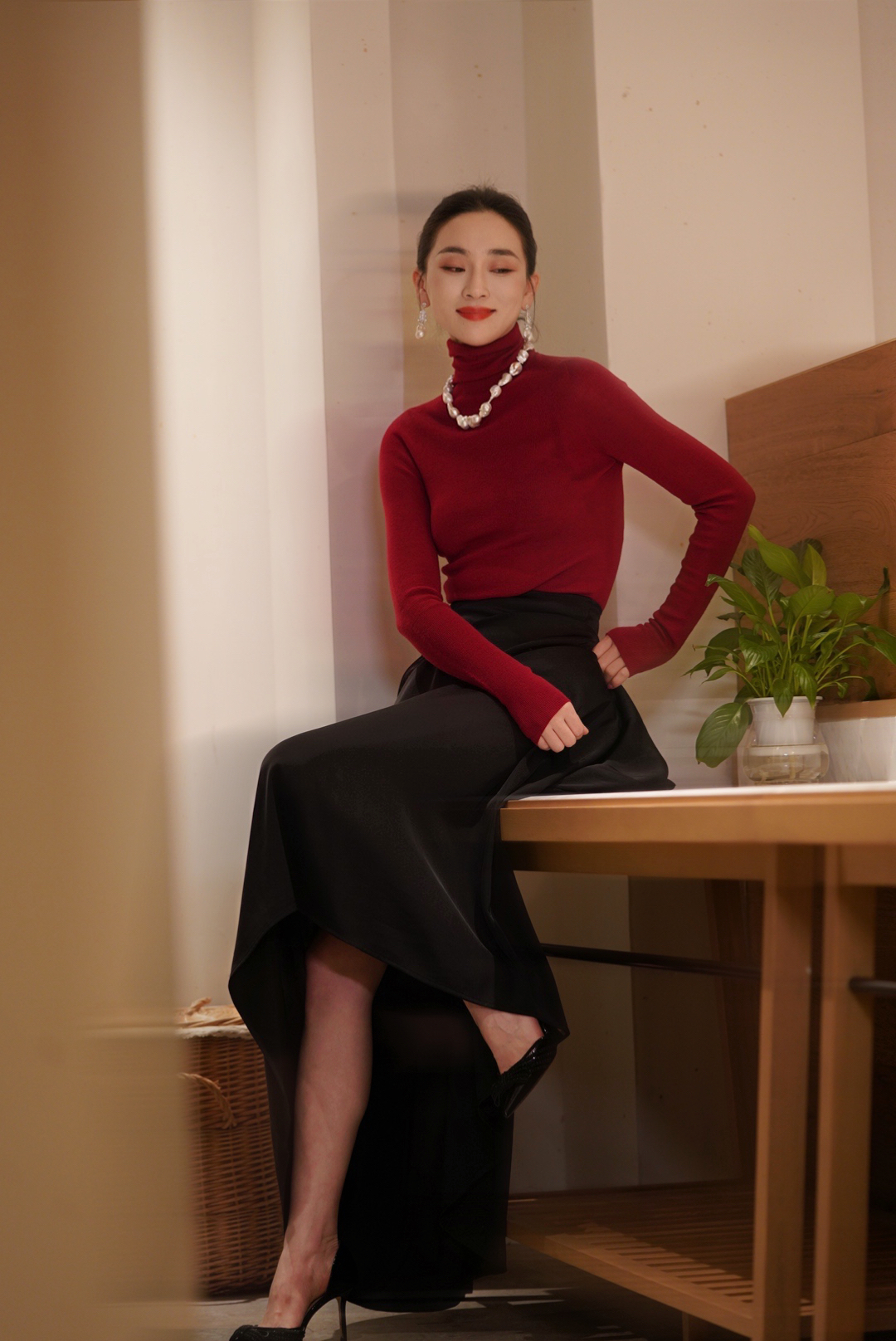 黑色圆舞曲—舒适极简半高领修身长裙 - 优雅通勤连衣裙 2201100